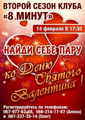 Но это вовсе не означает, что придется чувствовать себя одиноким и покинутым и с грустью ждать, когда же настанет 15 февраля. Клуб «8 минут» создает веселую вечеринку для одиноких сердец, пока еще не нашедших свою любовь и не исключено, что именно на этой вечеринке Вы встретитесь с тем единственным (или единственной), которые предназначены Вам Судьбой.