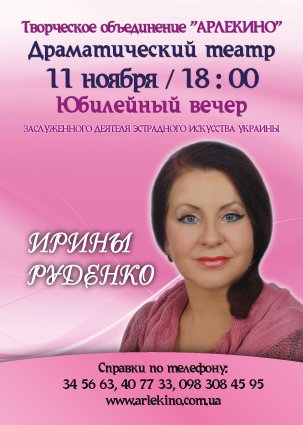 Приглашаем на юбилейный вечер заслуженного деятеля эстрадных искусств Украины, художественного руководителя Мариупольского театра кукол "Бибо", директора Областного Творческого Объединения "Арлекино" - Ирины Анатольевны Руденко.