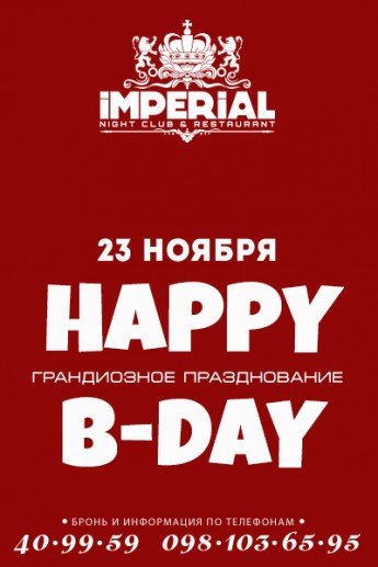 Ночной клуб Империал отмечает первый годик своей работы. Много вечеринок, много гостей прошло в стенах нашего любимого клуба. Приглашаем всех друзей отметить наш день рождения. Гарантируем веселье в лучших традициях клуба