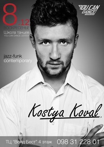 8 декабряон проведет два мастер-класса в школе танцев "You can dance center" - Jazz-Funk и Contemporary. Эта два самых популярных стиля в Украине, пришедшие к нам из стран Европы и США, и особое признание получили после выхода проекта "So You Think You Can Dance" ("Танцюють Bci").