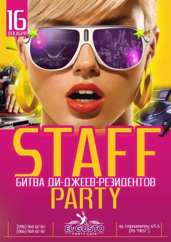 Staff Party - cерия вечеринок на которых администраторы и управляющие заведений, бармены и официанты, повара и ди-джеи, танцоры и танцовщицы - люди, которые развлекают, кормят и поят - собираются, чтобы отдохнуть после рабочих выходных в компании друзей и коллег.
