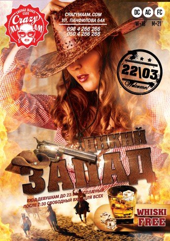 Особенная суббота. Сегодня мы предлагаем окунуться во времена настоящих мужчин и невероятно опасных женщин. Дикий Запад к вашим услугам! Тематическая вечеринка, привнесет в обычный ход вечера изюминку и уголёк.