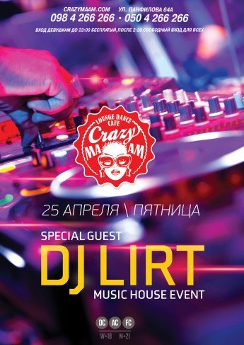 На сей раз мы с удовольствием послушаем DJ Lirt. Каждый раз когда он стоит за вертушками, звучат самые интересные и конечно невероятно острые треки. И так! В эту пятницу настоящий парад хаус музыки. Все на танцпол.