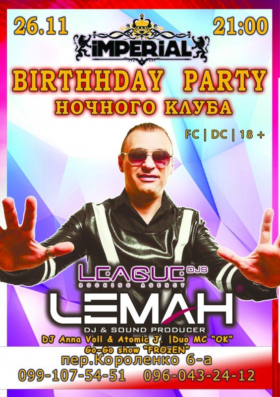 Не Пропусти! Суббота 26 ноября День рождения Ночного клуба "Империал"! Хедлайнер вечера - DJ LEMAH!