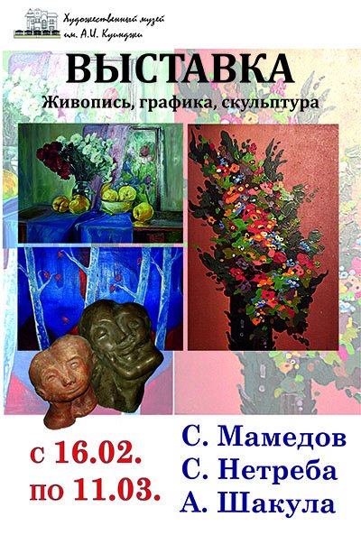 16 февраля 2018 годав художественном музее им. А.И. Куинджи (ул. Георгиевская,58, тел.: 33 32 09) состоится открытиевыставки работ художников С. Мамедова, С. Нетребы, А. Шакулы.