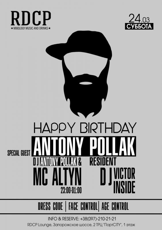 Давайте поздравим этого парня с Днем Рождения! Многолетний опыт, мастерство всё это вы услышите в эту субботу! DJ Antony Pollak подготовил для Вас сливки музыки.