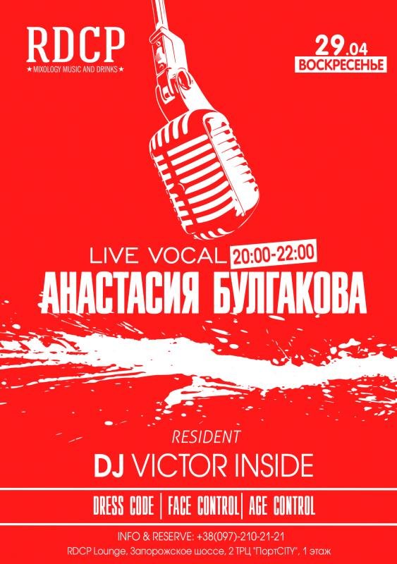 RDCP Lounge приглашает всех любителей живого вокала 29 апреля в 20:00. Жизнерадостная АнастасияБулгаковазарядит Вас позитивыми эмоциями, а завораживающие мелодии помогут создать особое настроение и прекрасно отдохнуть. Резерв столиков 097 210 21 21.