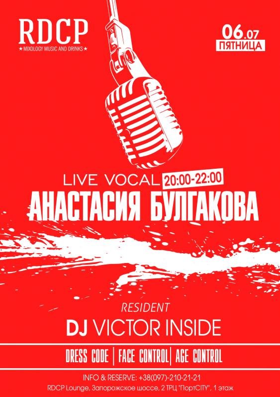 RDCP Summer Terrace приглашает всех любителей живого вокала 6 июля в 20:00. Жизнерадостная Анастасия Булгаков азарядит Вас позитивыми эмоциями, а завораживающие мелодии помогут создать особое настроение и прекрасно отдохнуть на свежем воздухе. Резерв столиков 097 210 21 21.
