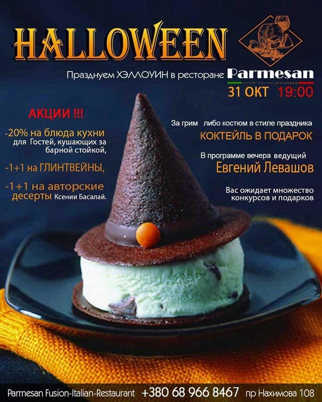 31 октября Вас ожидает ОХХЭЛУИТЕЛЬНАЯ Вечеринка! Будет жутко весело и ужасно вкусно! Вас ждёт масса конкурсов от ведущего Евгения Левашова и приятные подарки от ресторана Parmesan.