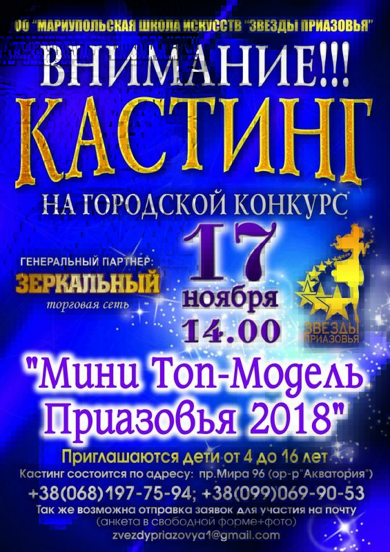 17 ноября в 14:00 по адресу пр.Мира,96 (ориентир кафе "Акватория") состоится кастинг на Ежегодный Городской конкурс красоты "Мини Топ - Модель Приазовья 2018".