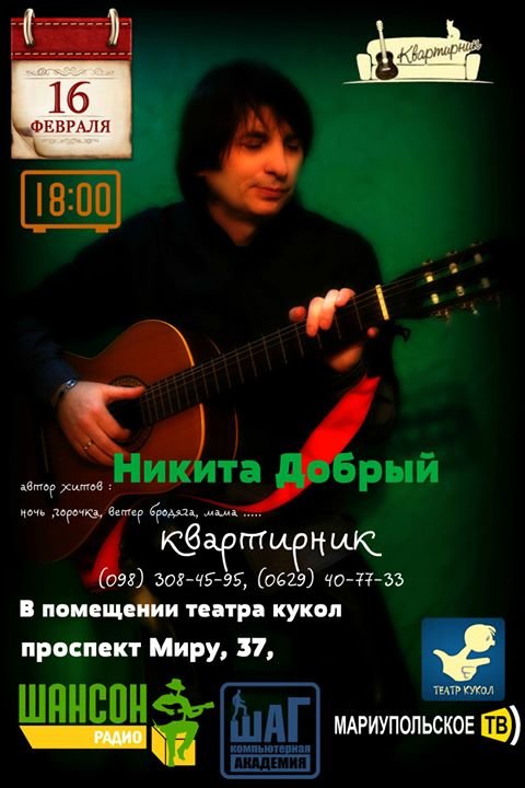 16 февраля в помещении Мариупольского театра кукол состоится концерт исполнителя русского шансона Никиты Доброго.