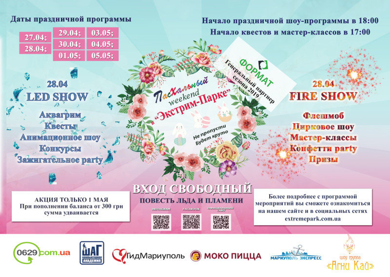 Близятся пасхальные праздники, и Экстрим Парк приготовил для Вас незабываемую weekend, целых 8 дней Вас будут развлекать аниматоры, Вас ждут мастер классы, квесты и флешмобы, Fire и Led show.