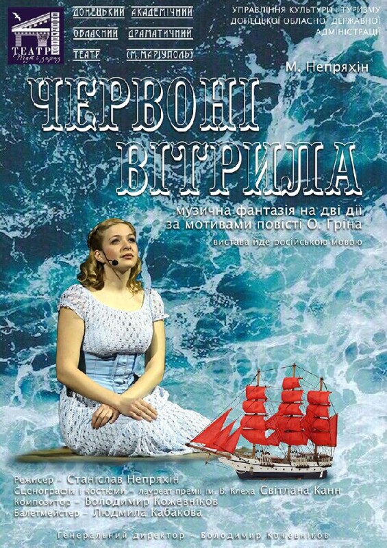 Свою знамениту повість-феєрію Грін написав у першій чверті XX століття, подарувавши світові одну з найкрасивіших романтичних історій про піднесену мрію, непохитну віру в диво і любов, яка робить неймовірне можливим. Її сюжет взяли за основу автори сценічної фантазії театру. Смертоносні шторми і розбійницькі набіги, хитромудрі інтриги і підступні задуми ворогів очікують юну Ассоль і шляхетного капітана Грея, перш ніж збудеться давнє пророцтво. А яскраві музичні номери – веселі корабельні куплети, ліричні пісні, запальні танці, запеклі битви, допоможуть вам повною мірою відчути атмосферу морської романтики і неабияке загострення пристрастей.