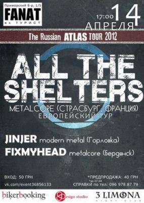 В рамках европейского тура, впервые в Мариуполе, да и в Украине вообще, французская Metalcore / Post Hardcore команда All the Shelters! (http://alltheshelters.com/, http://www.myspace.com/alltheshelters).