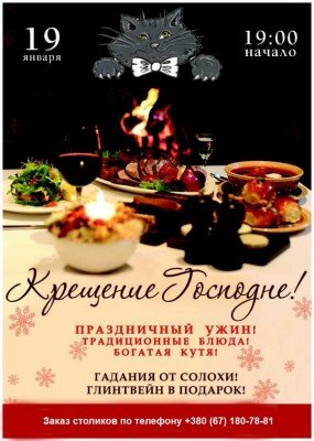 Ресторан Кот Бегемот приглашает всех на Крещение на праздничный ужин. Вас ожидают традиционные блюда, богатая кутя, а так же гадания от Солохи. Всем гостям глинтвейн в подарок!