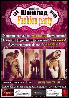 Красивое место, вкусная еда, модный ведущий, показ эксклюзивного белья... Что еще нужно для того, чтобы приятно провести вечер? Конкурсы, сюрпризы, призы и подарки от партнеров. С модным ведущим Аскольдом Квятковским.
