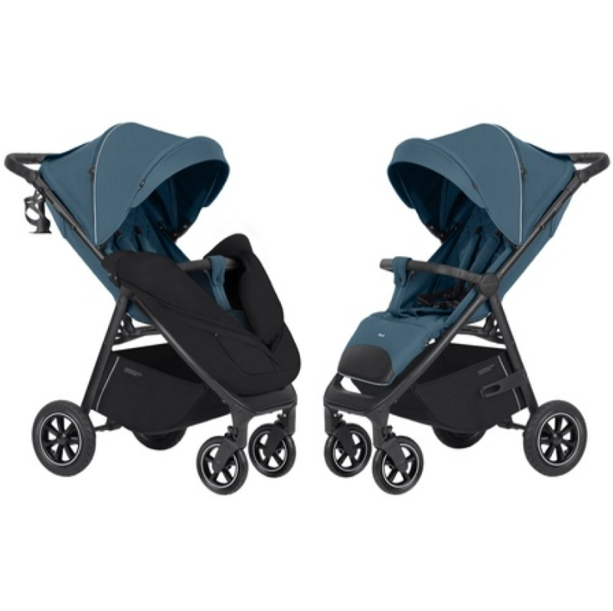 Спинка візочка регулюється до повністю горизонтального положення, а вентиляційні секції гарантують комфорт навіть у літню спеку. Прогулянковий блок реверсивний, компактно складається разом з рамою незалежно від напрямку встановлення. Візочок має містку корзину закритого типу, капор зі змінною висотою фіксації, м’яку амортизацію.