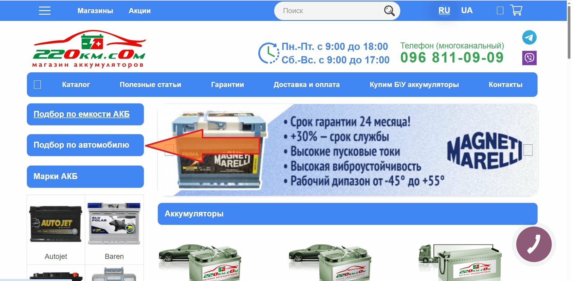 Для удобства клиентов на сайте 220km реализован подбор аккумулятора по марке автомобиля. Достаточно выбрать марку, модель и модификацию авто, после чего система автоматически предложит оптимальные варианты аккумуляторов.