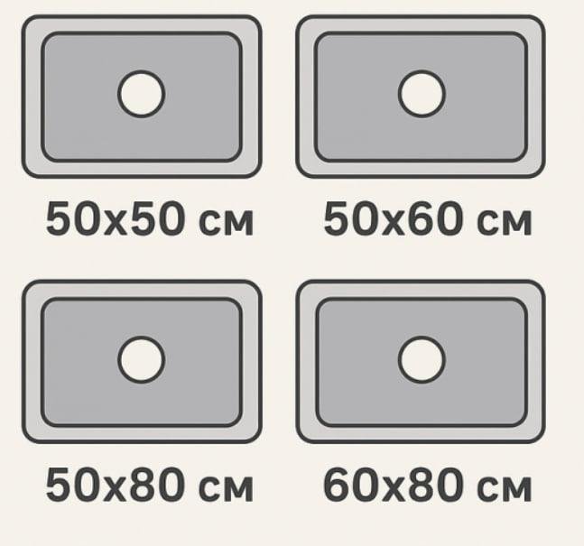 Накладні мийки бувають різних розмірів: від компактних 480×480 мм для невеликих кухонь до просторих 860×500 мм для великих приміщень. Чаша може бути ліворуч або праворуч, що дозволяє підлаштувати мийку під планування кухні. Товщина нержавіючої сталі зазвичай 0,6–1 мм: тонка сталь легше, але шумніша при наборі води, товста – більш довговічна і менше вібрує.
