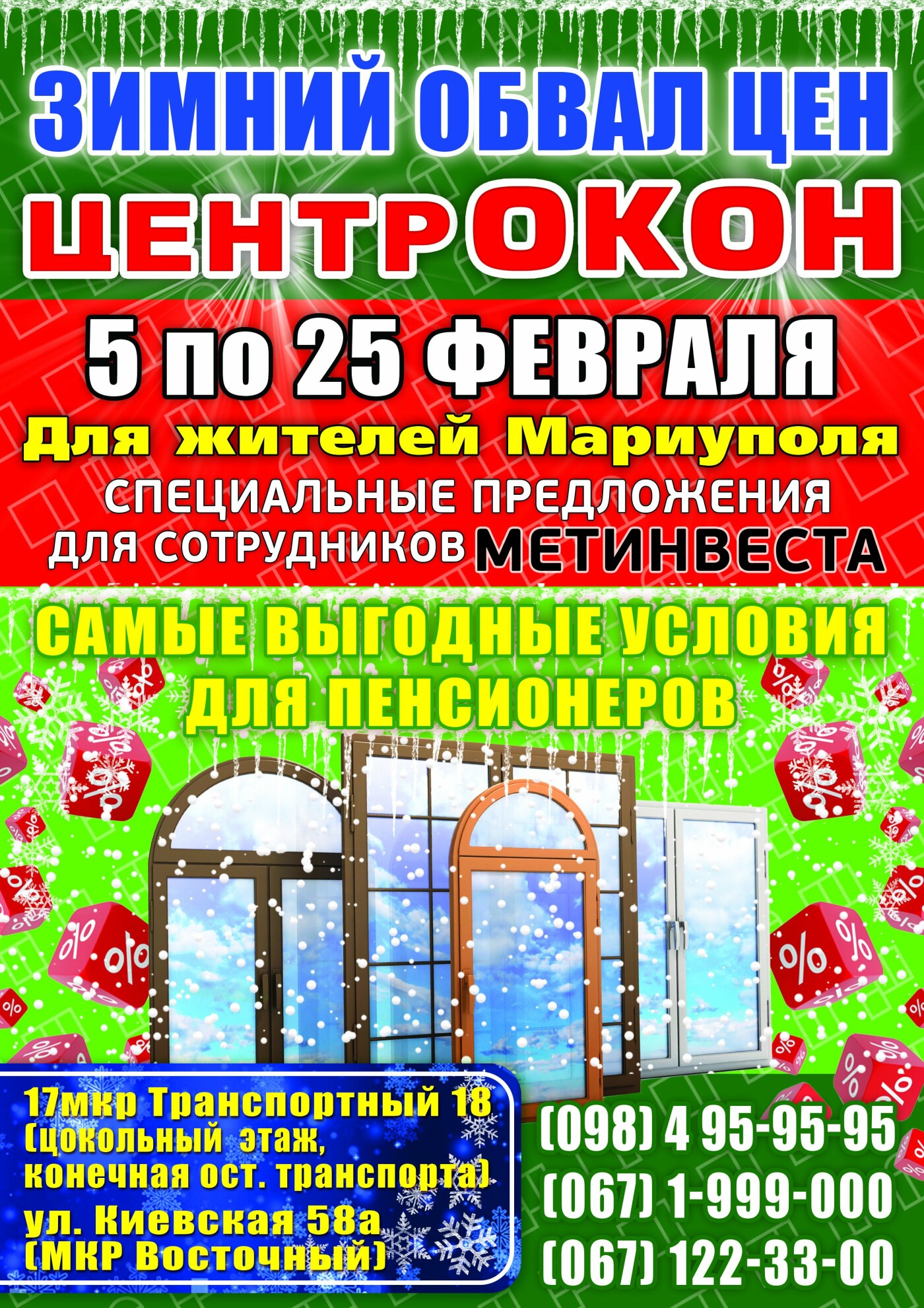 НЕ УПУСТИТЕ ВОЗМОЖНОСТЬ ЗАКАЗАТЬ ОКНА ПО ЗИМНЕЙ СУПЕР ЦЕНЕ С 5 ПО 25 ФЕВРАЛЯ . В НАДЕЖНОЙ И СТАБИЛЬНОЙ КОМПАНИИ «ЦЕНТР ОКОН»!