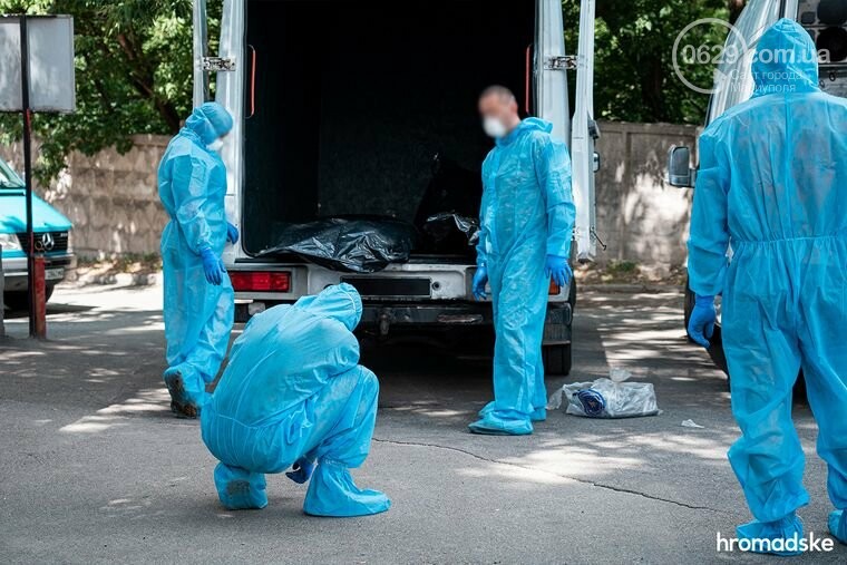 Також одягаю захисний костюм, маску, рукавички. У кімнаті біля входу, де оглядають тіла, бачу на каталках трьох літніх померлих людей. Жінка одягнена, з накритим обличчям, чоловіки — голі після розтинів. Це — цивільні. Морг продовжує обслуговувати всіх, попри те, що сюди привозять десятки тіл із фронту.