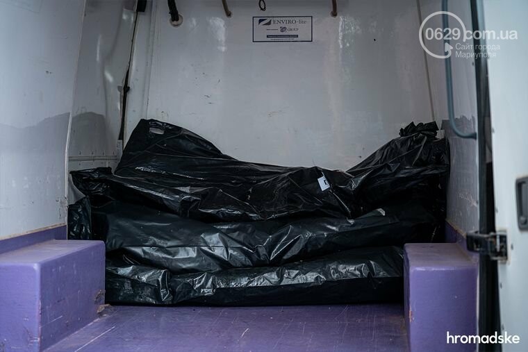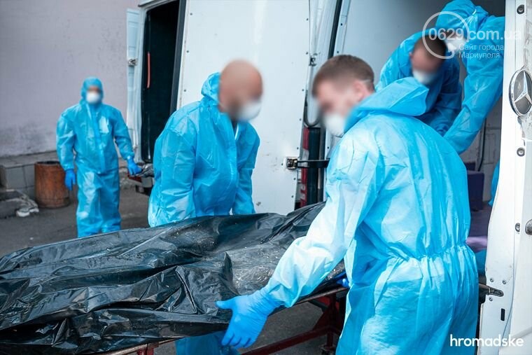 Олена Толкачова, керівниця патронатної служби «Азову», бігає між моргом, автівкою з тілами та військовими. Після вмовлянь вдягає на себе целофановий халат і рукавички, від костюма й маски відмовляється.
