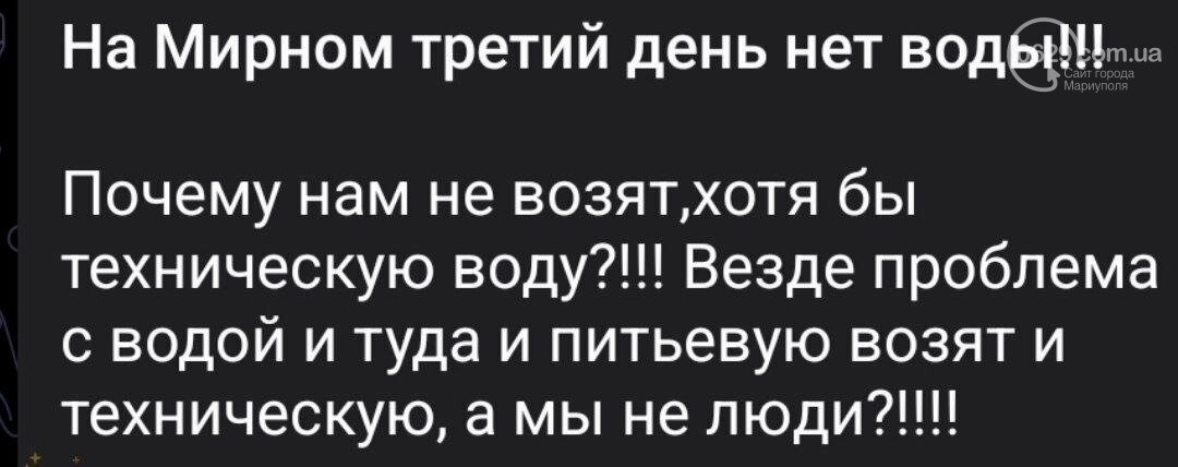 За повідомленнями місцевих жителів, централізоване водопостачання у Маріуполі працює лише частково — вода подається раз на два дні, максимум на кілька годин. Тиск настільки слабкий, що верхні поверхи багатоповерхівок залишаються без доступу до води. Люди змушені стояти біля кранів по кілька годин, щоб набрати хоча б кілька літрів.