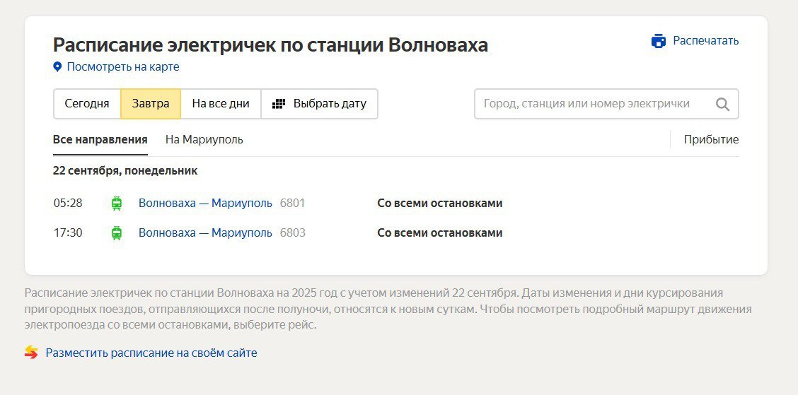 На красивому, відбудованому залізничному вокзалі у Маріуполі во всю стіну сяє величезне електронне табло. Красиві співробітниці в елегантній формі РЖД (Російська залізниця - ред.) ходять по порожньому вокзалу і оголошують прибуття … аж двох електричок із Волновахи.