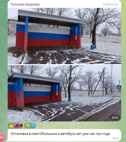 Але то нічого, що автобусів немає, проте в селах, куди не доходить громадський транспорт, окупаційна влада влаштовує піар на зупинках, фарбуючи їх у кольори російського триколора.