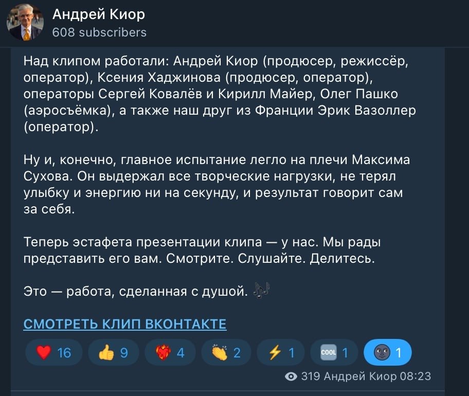 У своєму телеграм-дописі Кіор скаржиться на відсутність в окупованому Маріуполі локацій з такими потрібними для російського символізму берізками та дякує колишньому фотографу та оператору ГУНП за знімання.