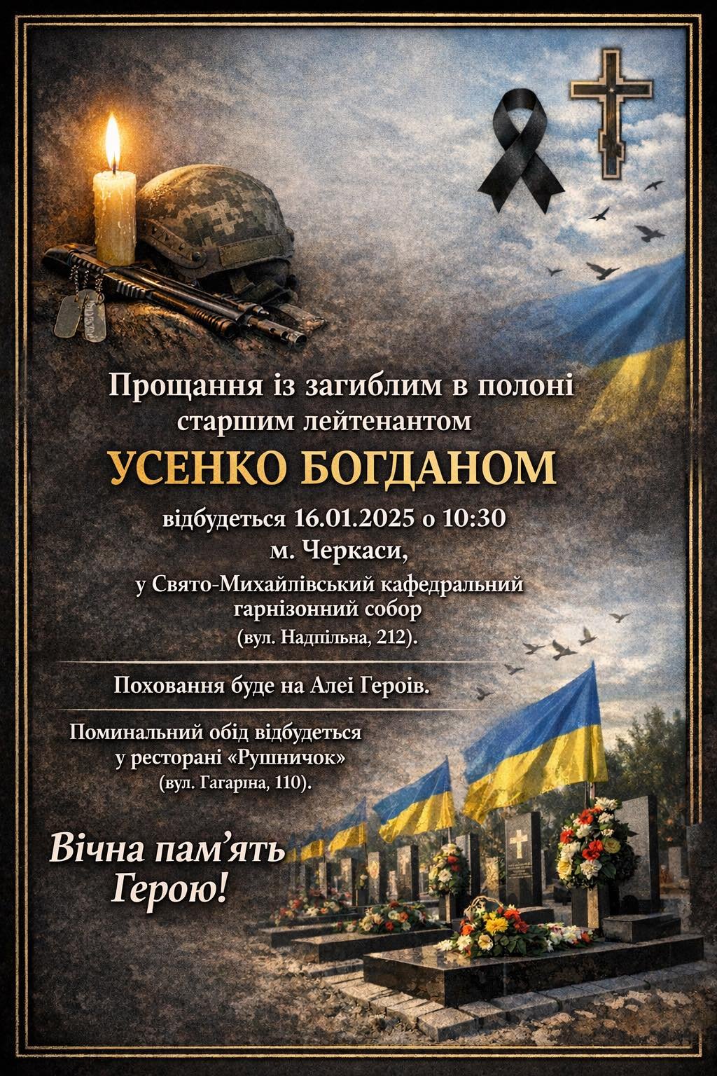 Прощання з Богданом Усенком відбудеться 16 січня у Черкасах, у Свято-Михайлівському кафедральному гарнізонному соборі.