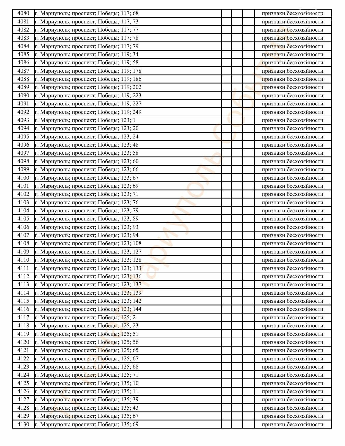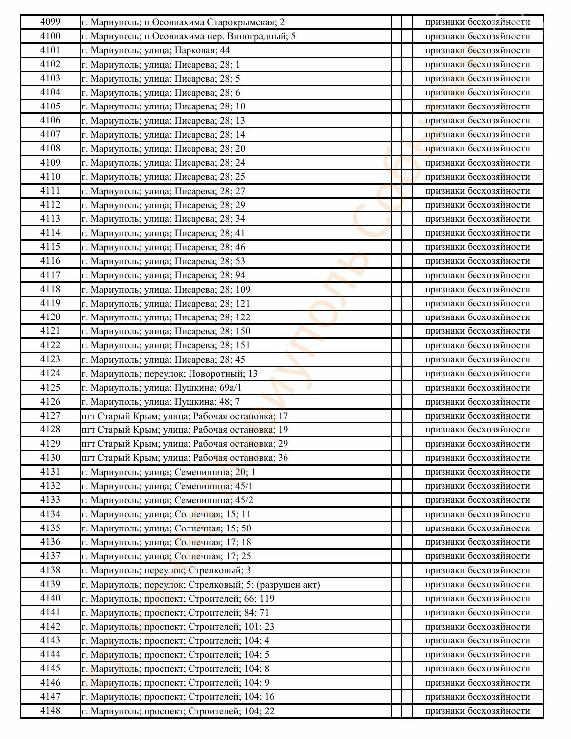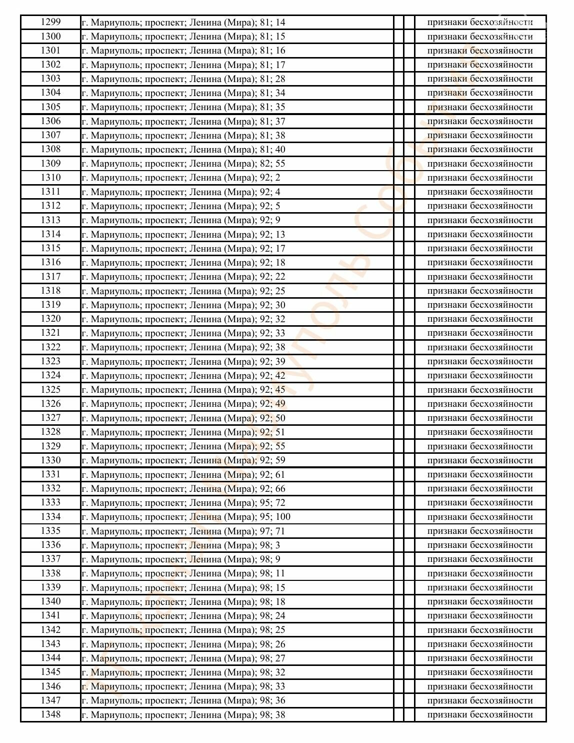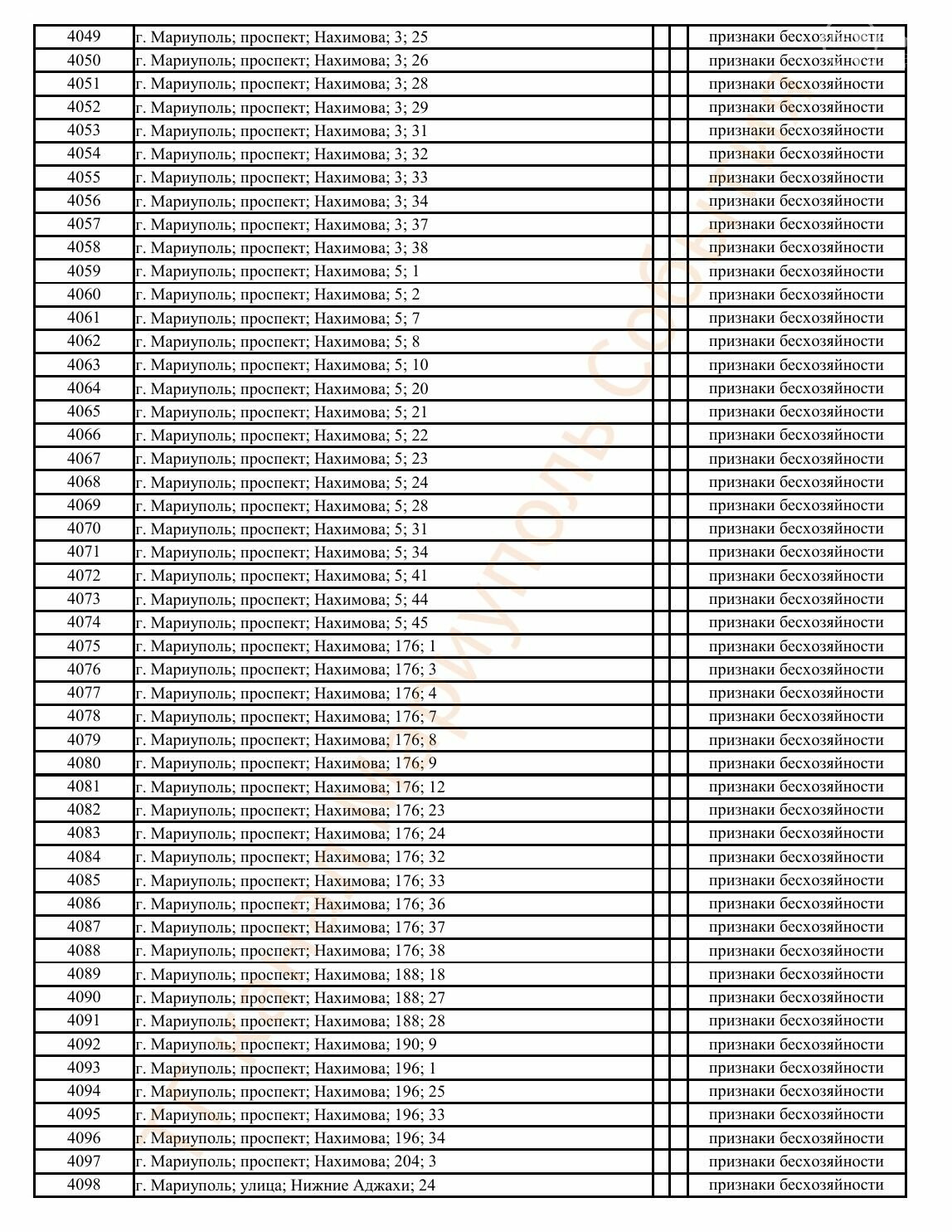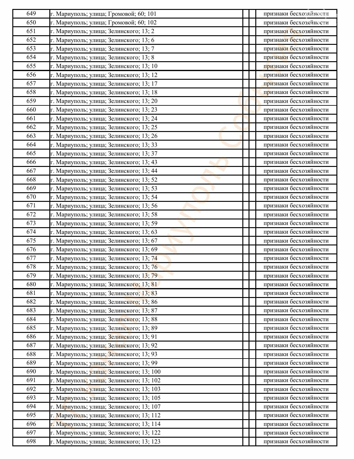 Окупаційна адміністрація Маріуполя оприлюднила черговий перелік нерухомості, яку визнали такою, що «має ознаки безхазяйності». У списку — близько 13 тисяч об’єктів, переважно квартир та житлових приміщень.