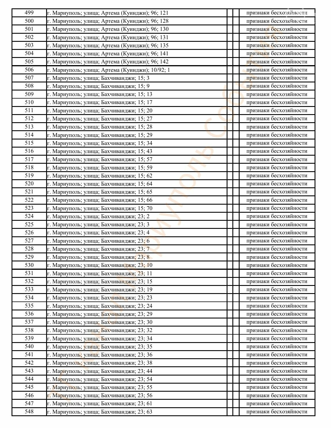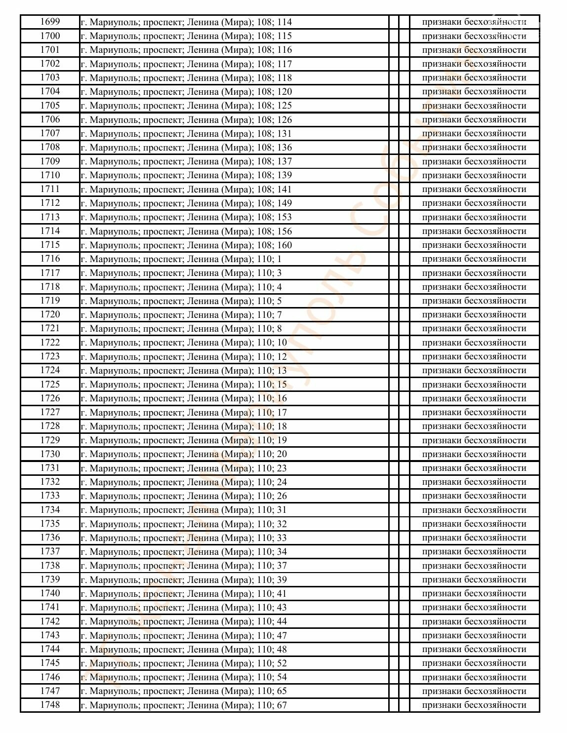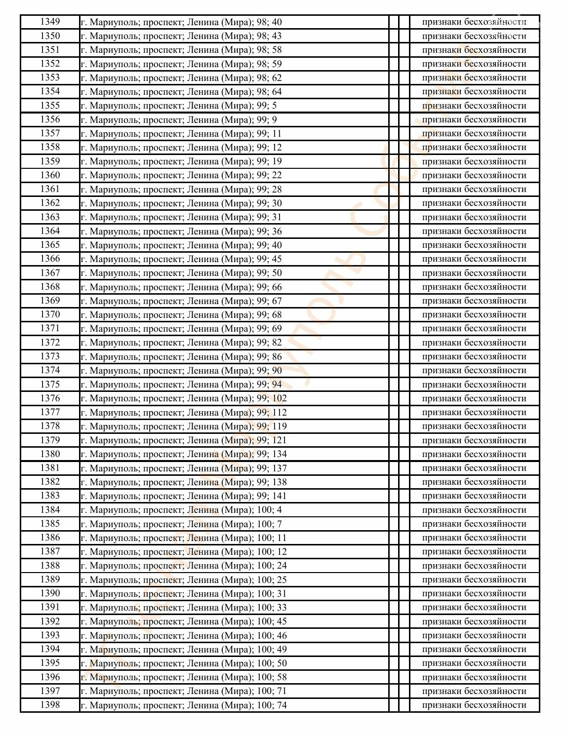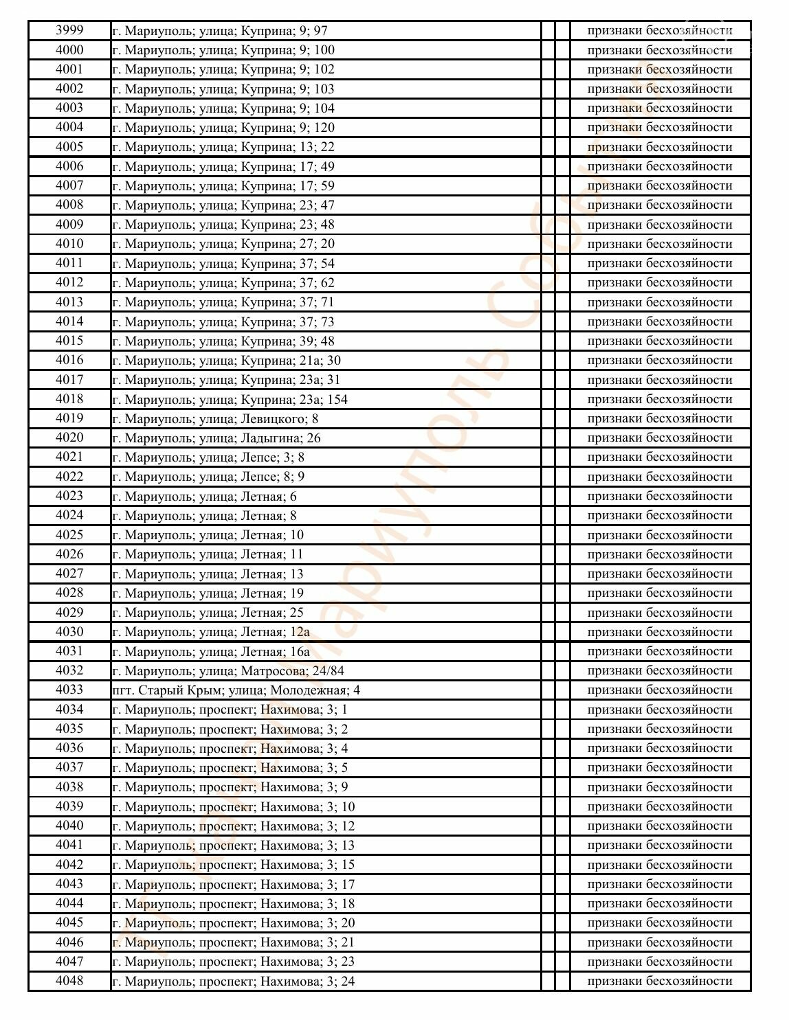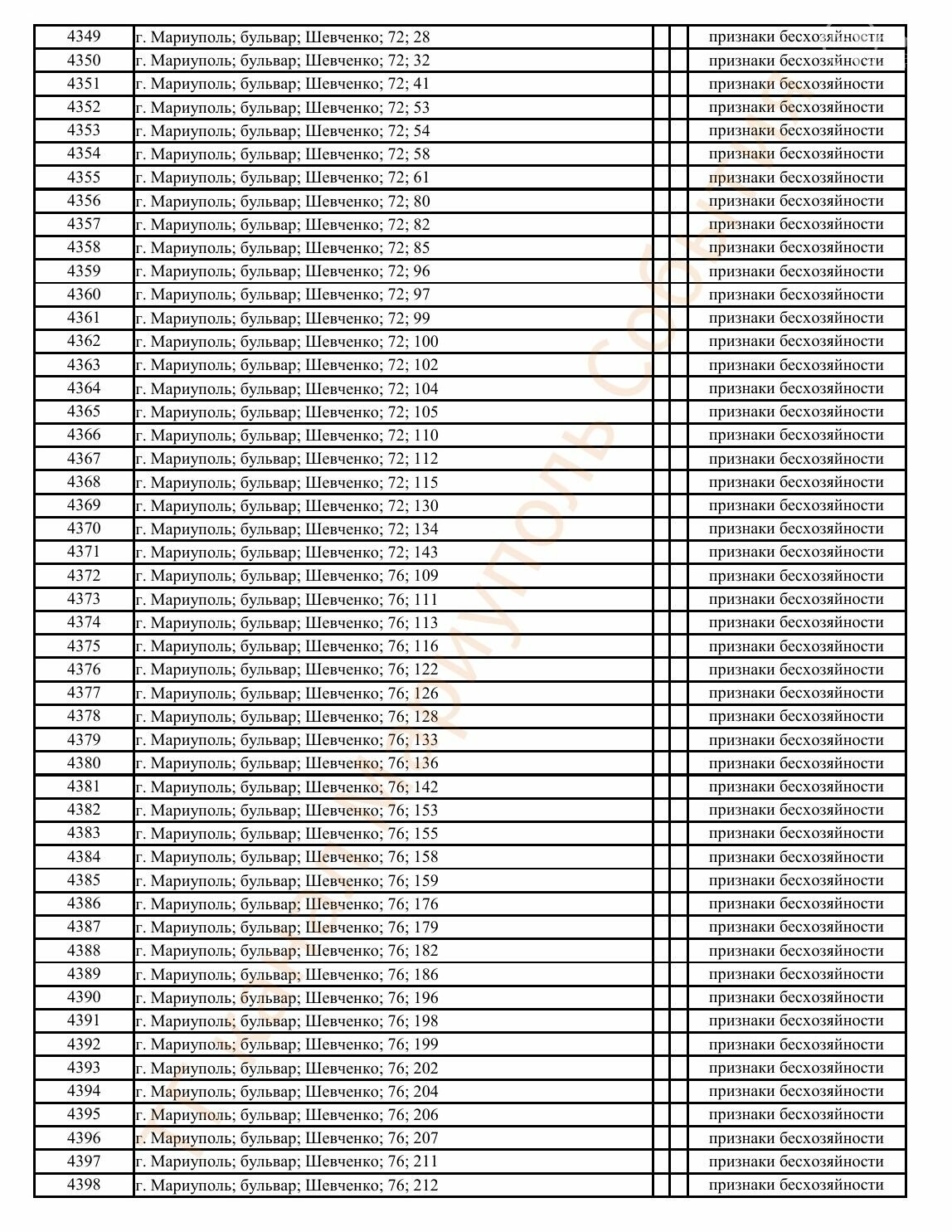 Окупаційна адміністрація Маріуполя оприлюднила черговий перелік нерухомості, яку визнали такою, що «має ознаки безхазяйності». У списку — близько 13 тисяч об’єктів, переважно квартир та житлових приміщень.
