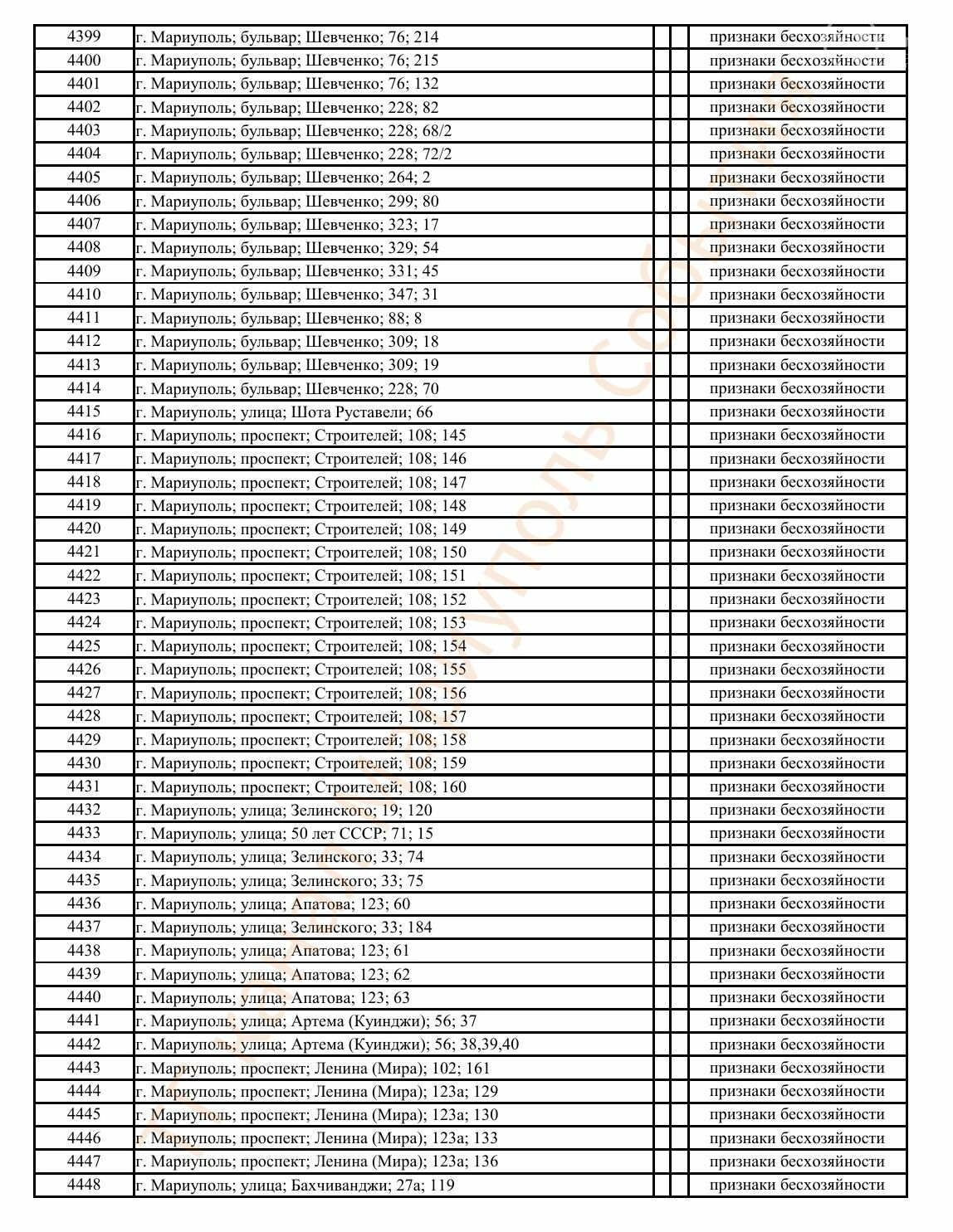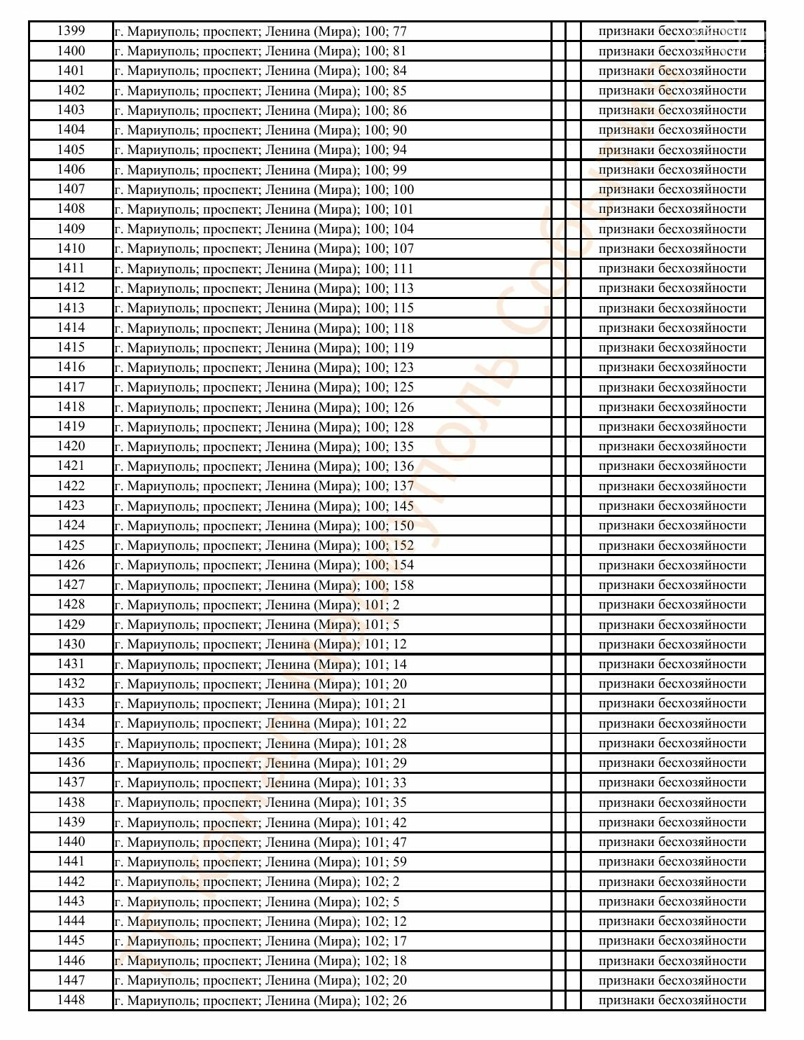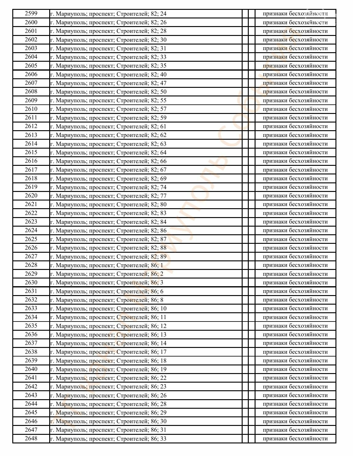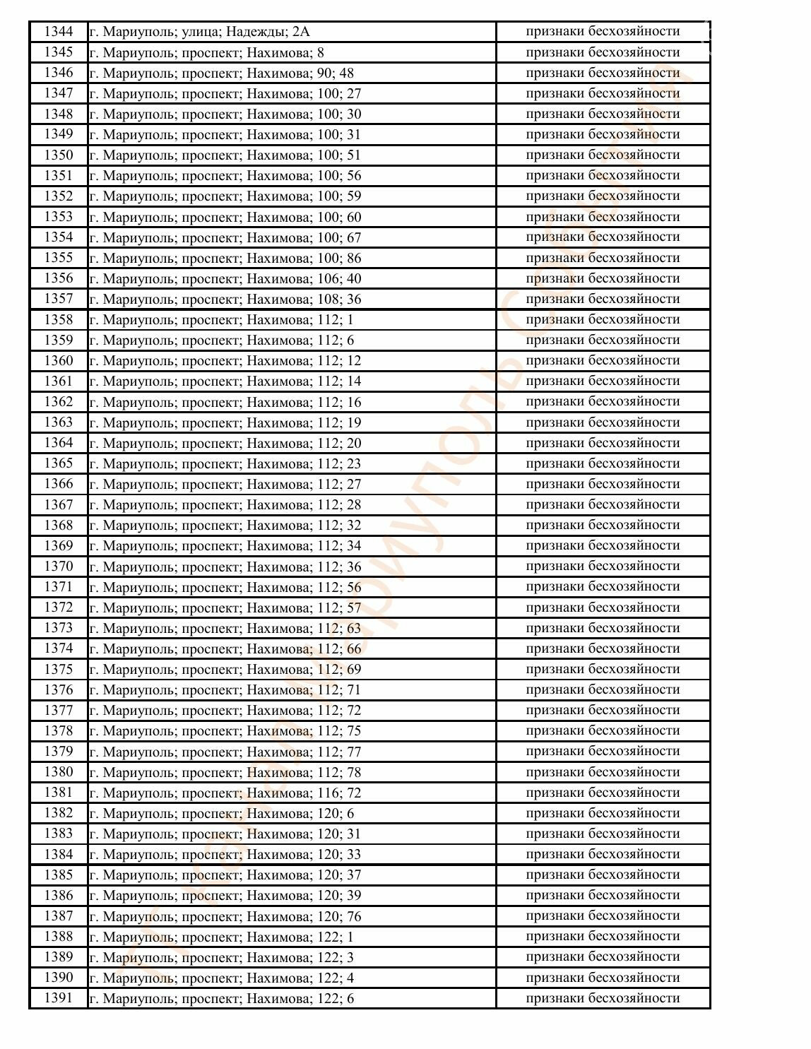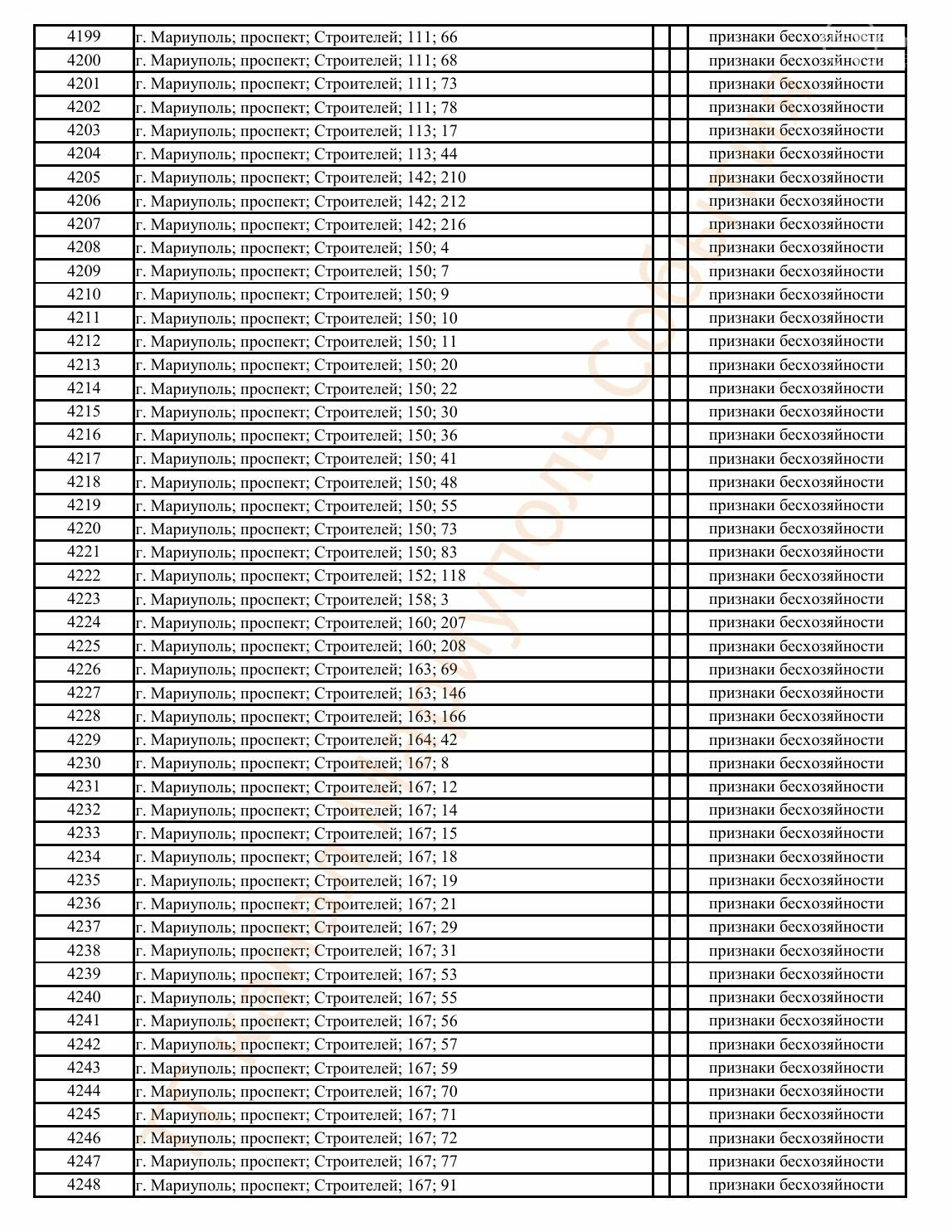 Окупаційна адміністрація Маріуполя оприлюднила черговий перелік нерухомості, яку визнали такою, що «має ознаки безхазяйності». У списку — близько 13 тисяч об’єктів, переважно квартир та житлових приміщень.