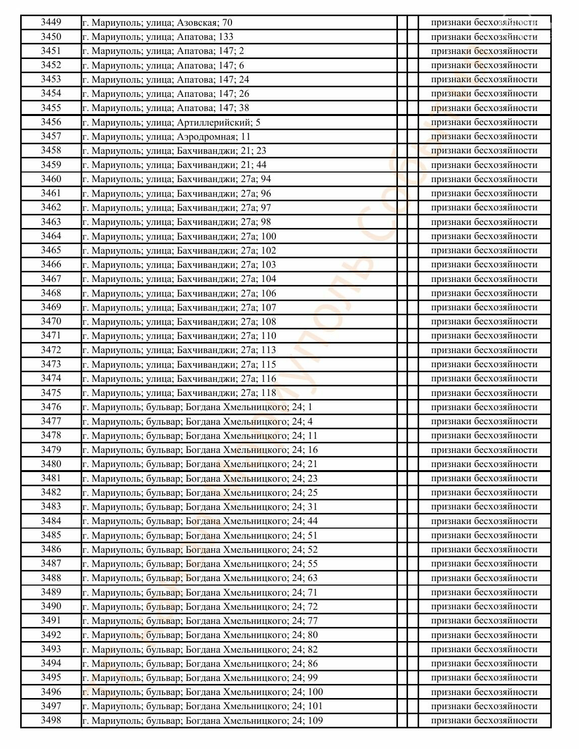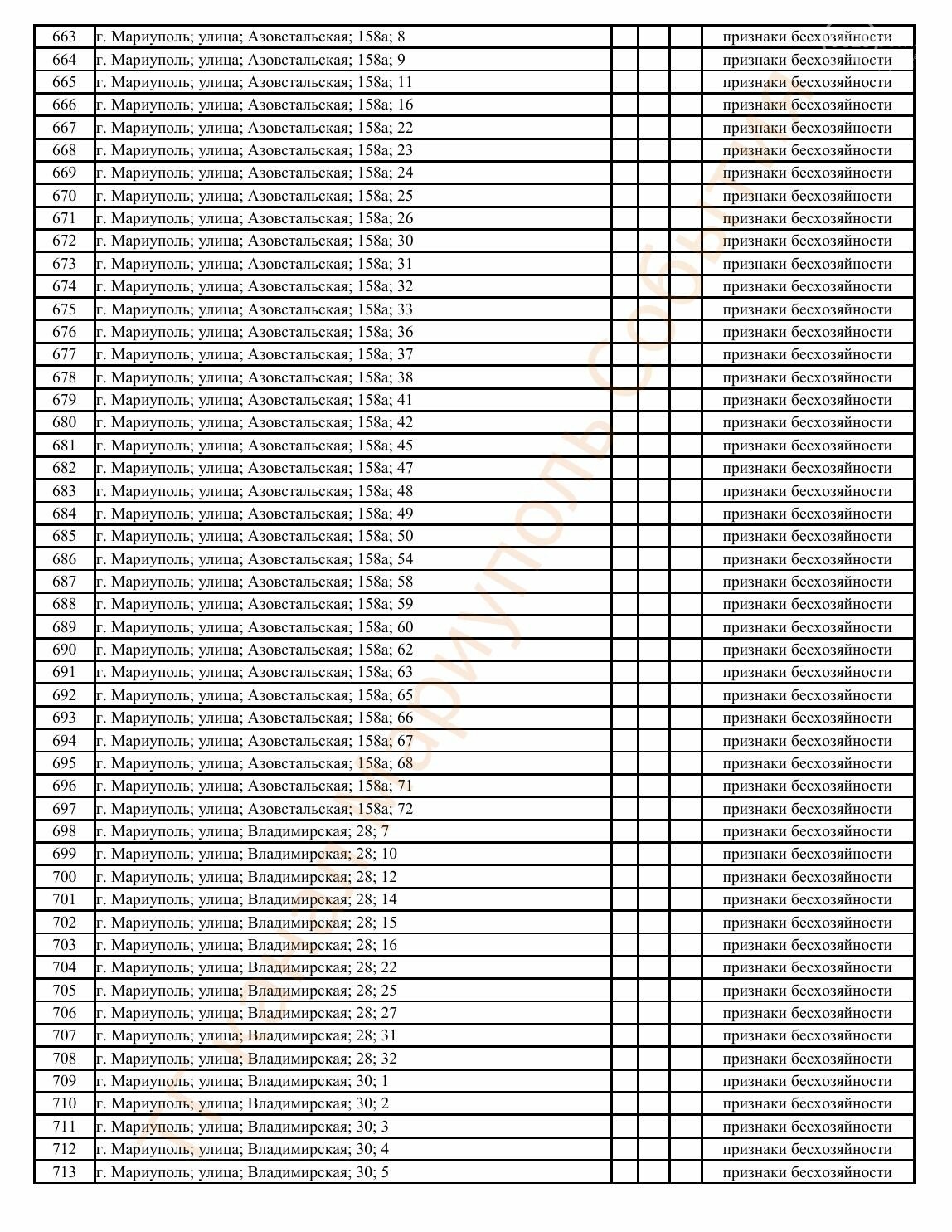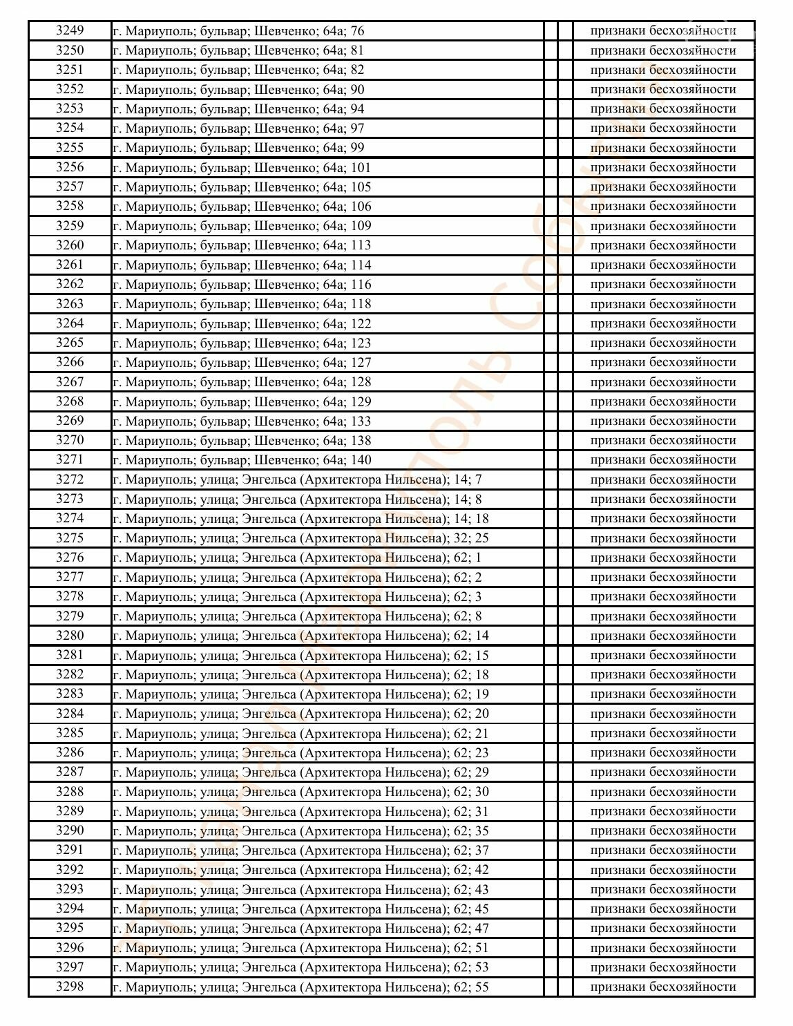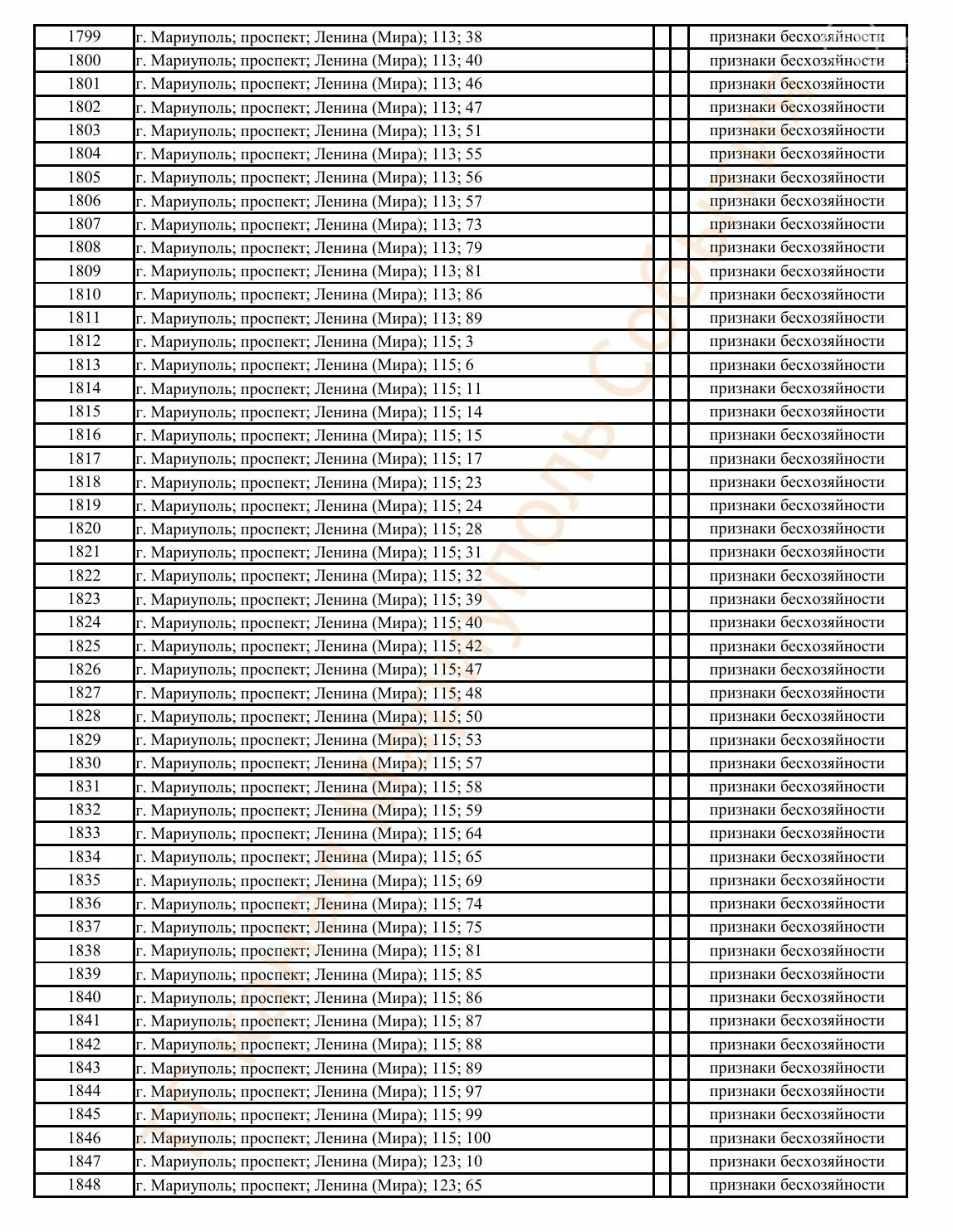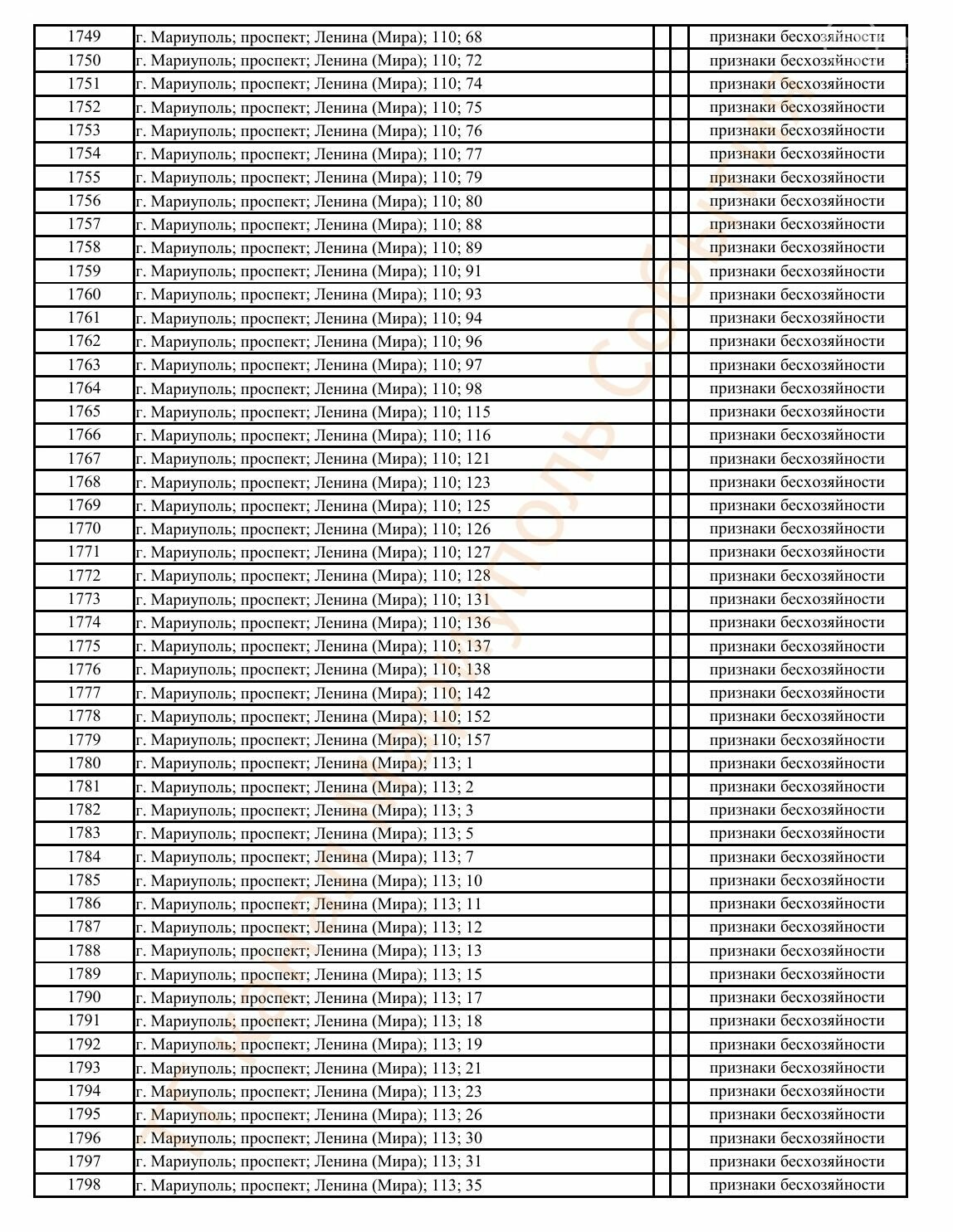 Окупаційна адміністрація Маріуполя оприлюднила черговий перелік нерухомості, яку визнали такою, що «має ознаки безхазяйності». У списку — близько 13 тисяч об’єктів, переважно квартир та житлових приміщень.