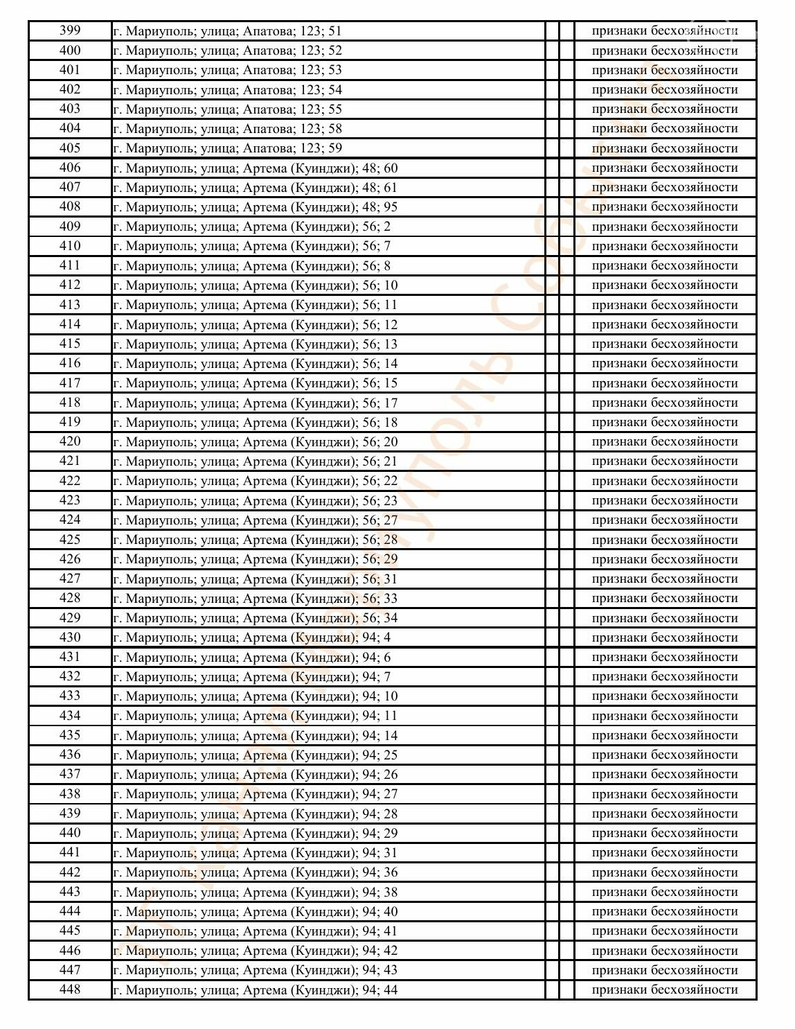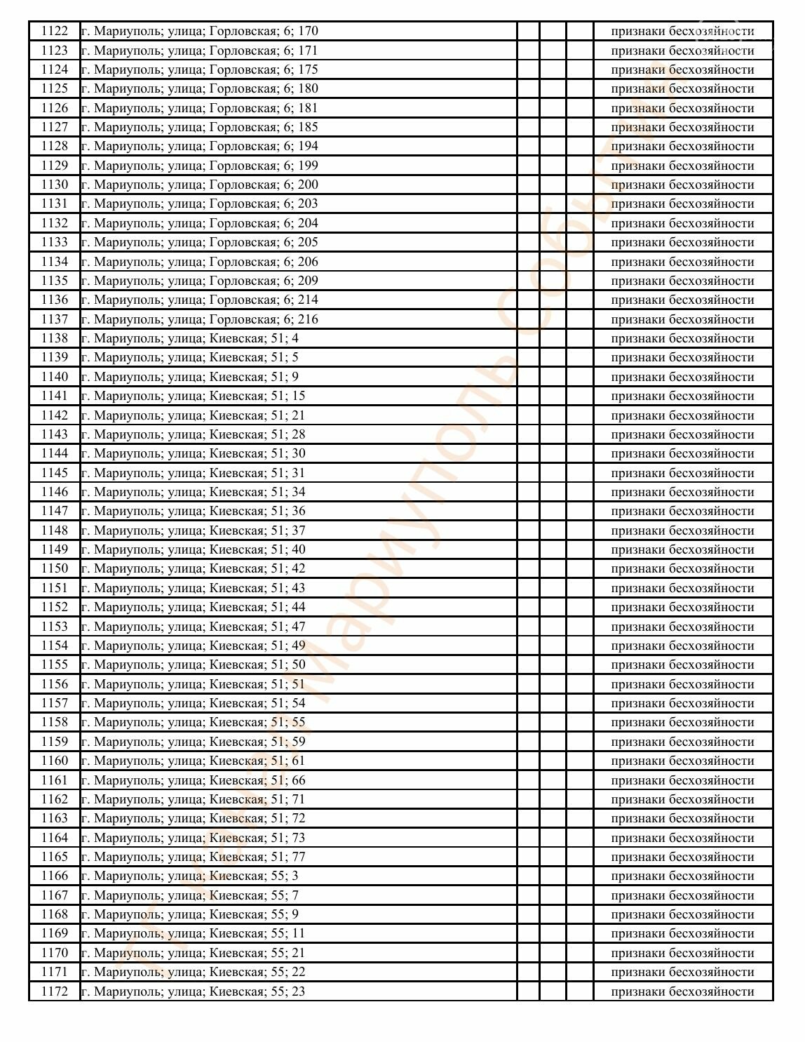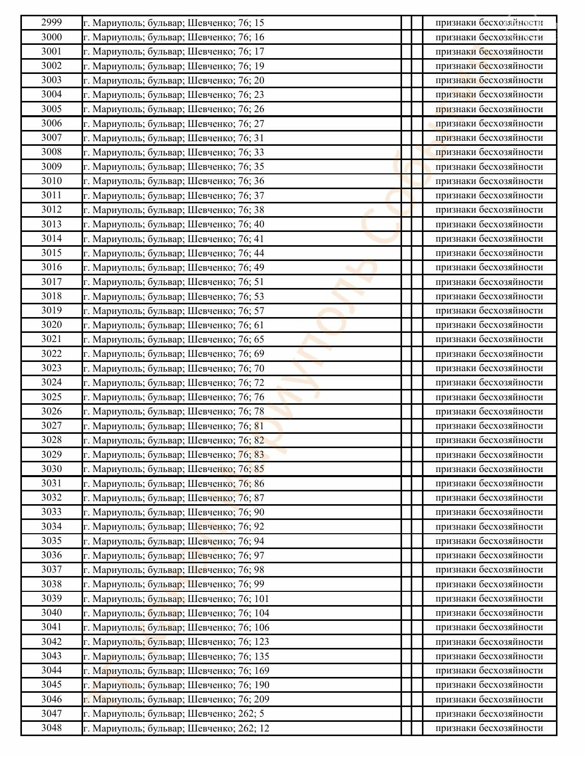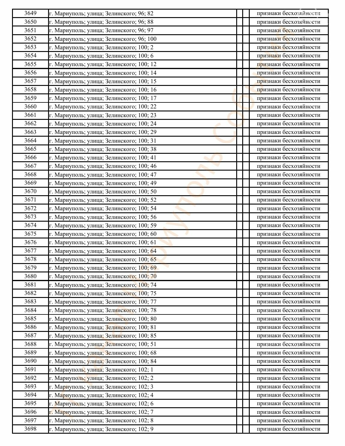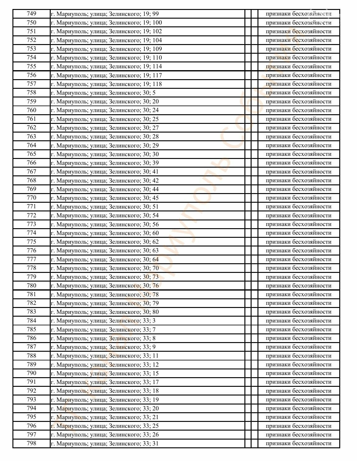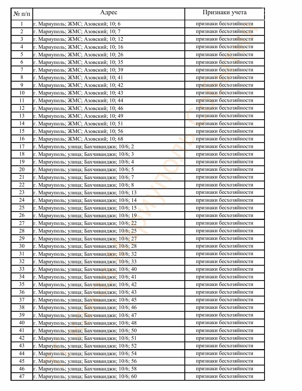 Окупаційна адміністрація Маріуполя оприлюднила черговий перелік нерухомості, яку визнали такою, що «має ознаки безхазяйності». У списку — близько 13 тисяч об’єктів, переважно квартир та житлових приміщень.