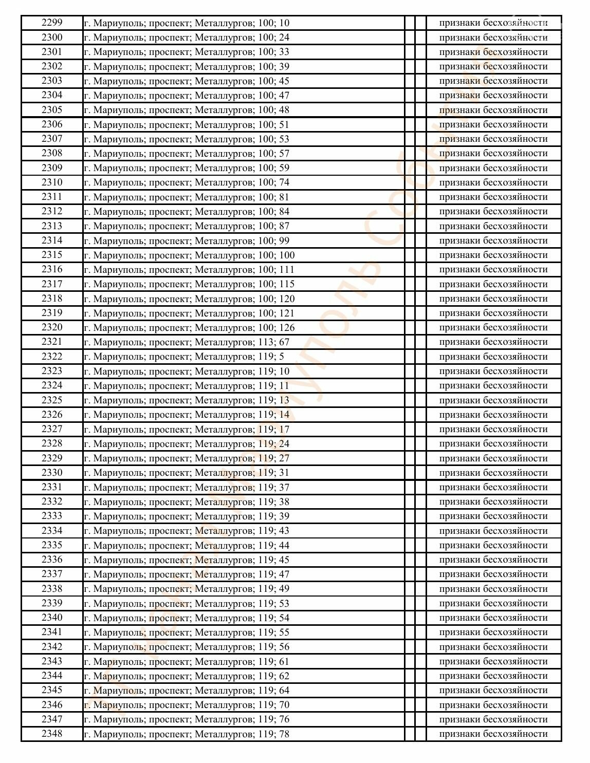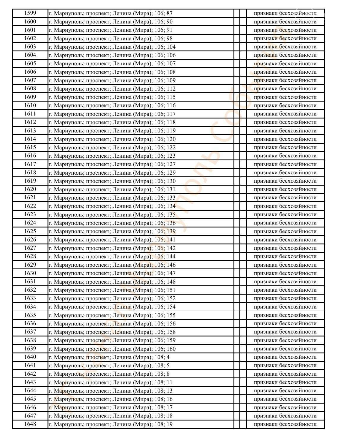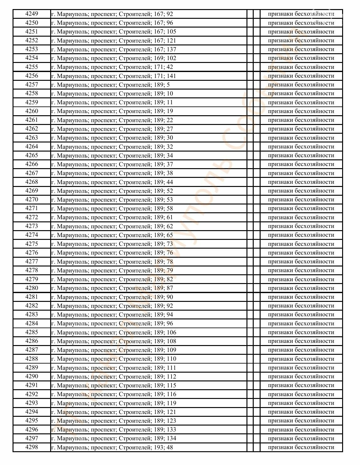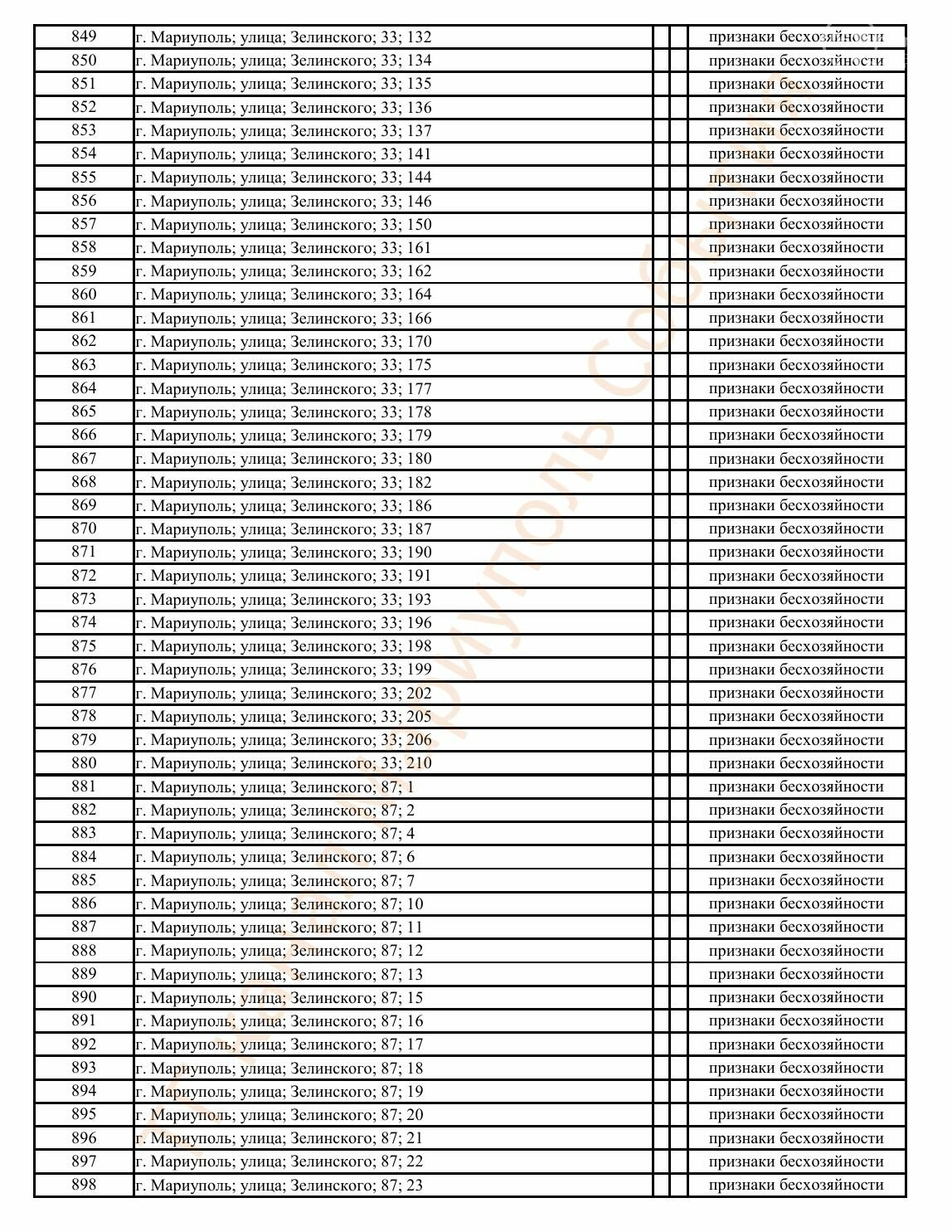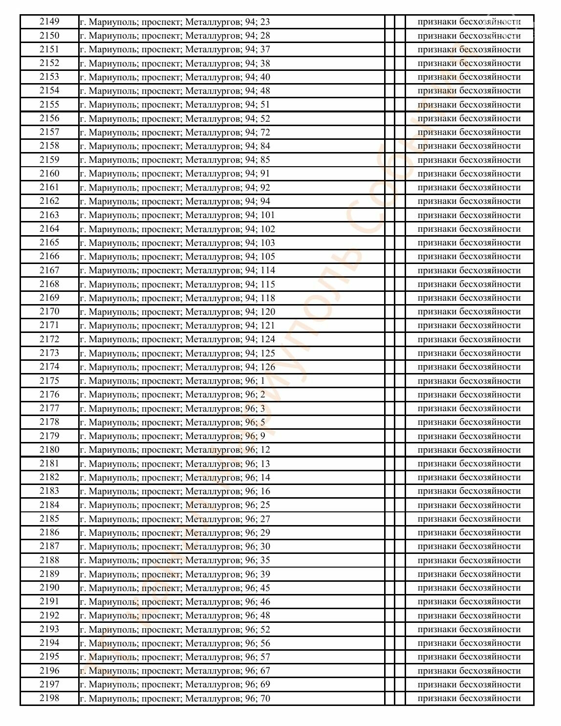 Окупаційна адміністрація Маріуполя оприлюднила черговий перелік нерухомості, яку визнали такою, що «має ознаки безхазяйності». У списку — близько 13 тисяч об’єктів, переважно квартир та житлових приміщень.