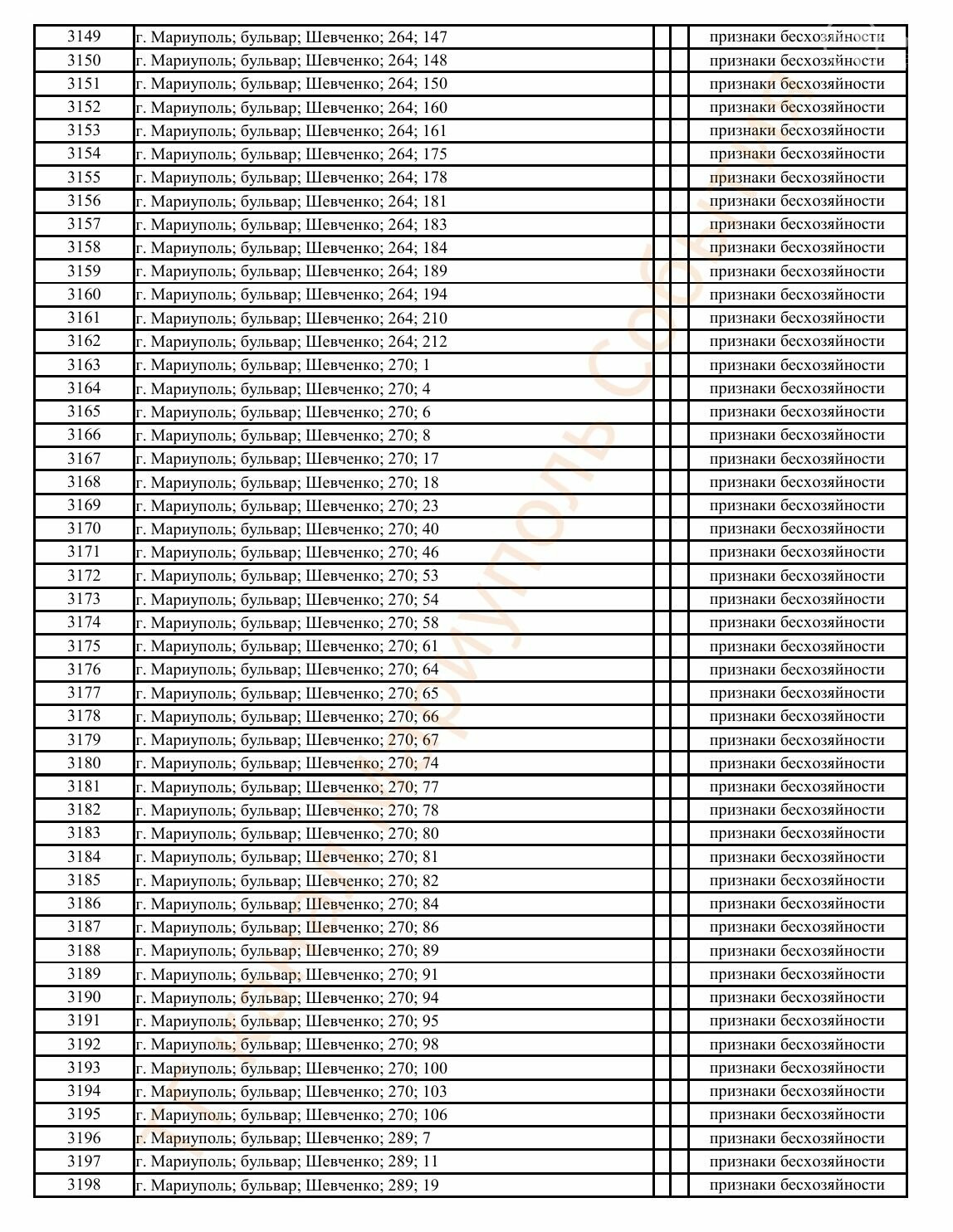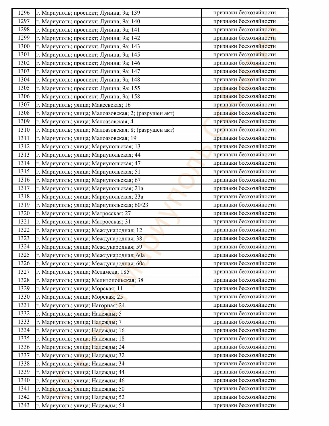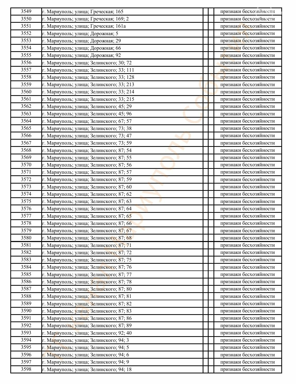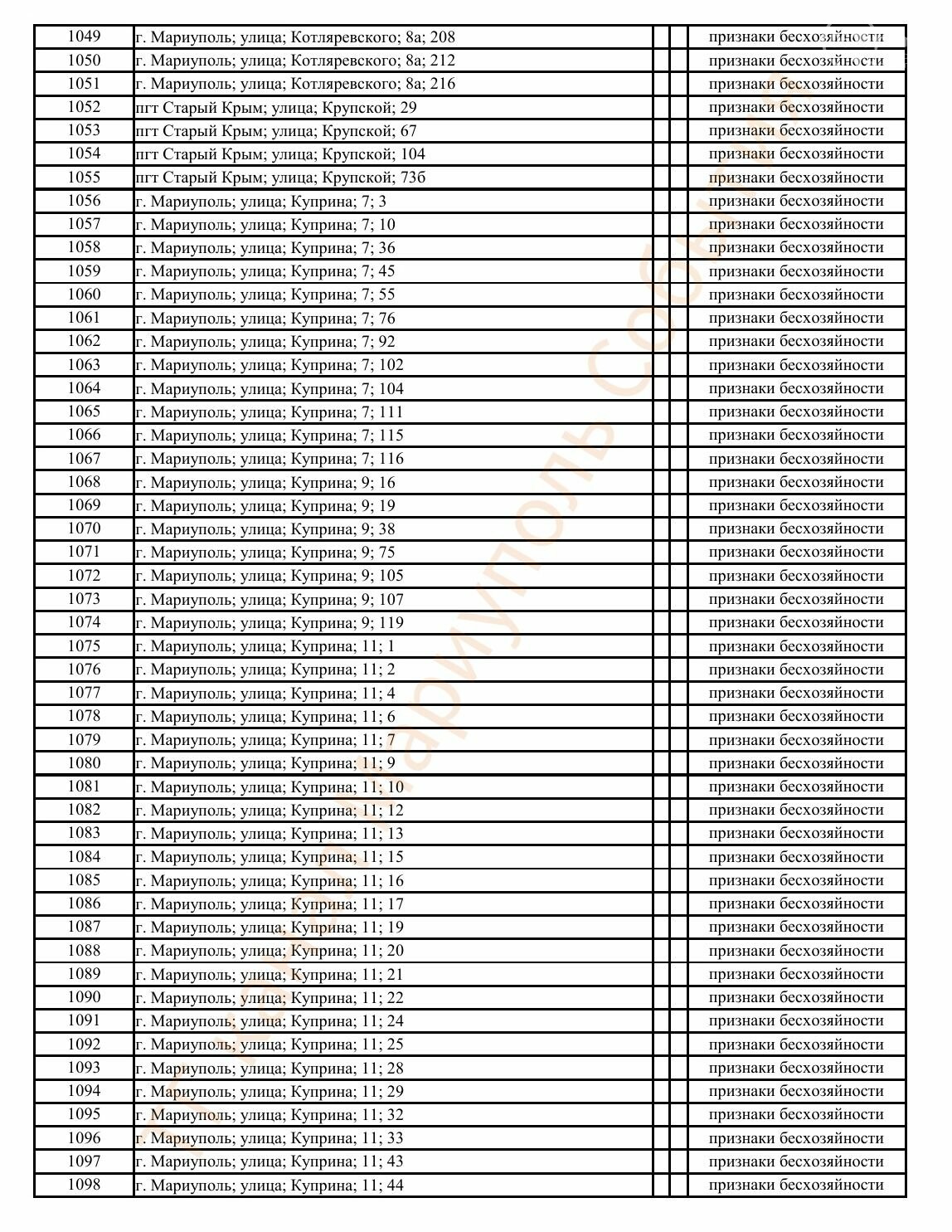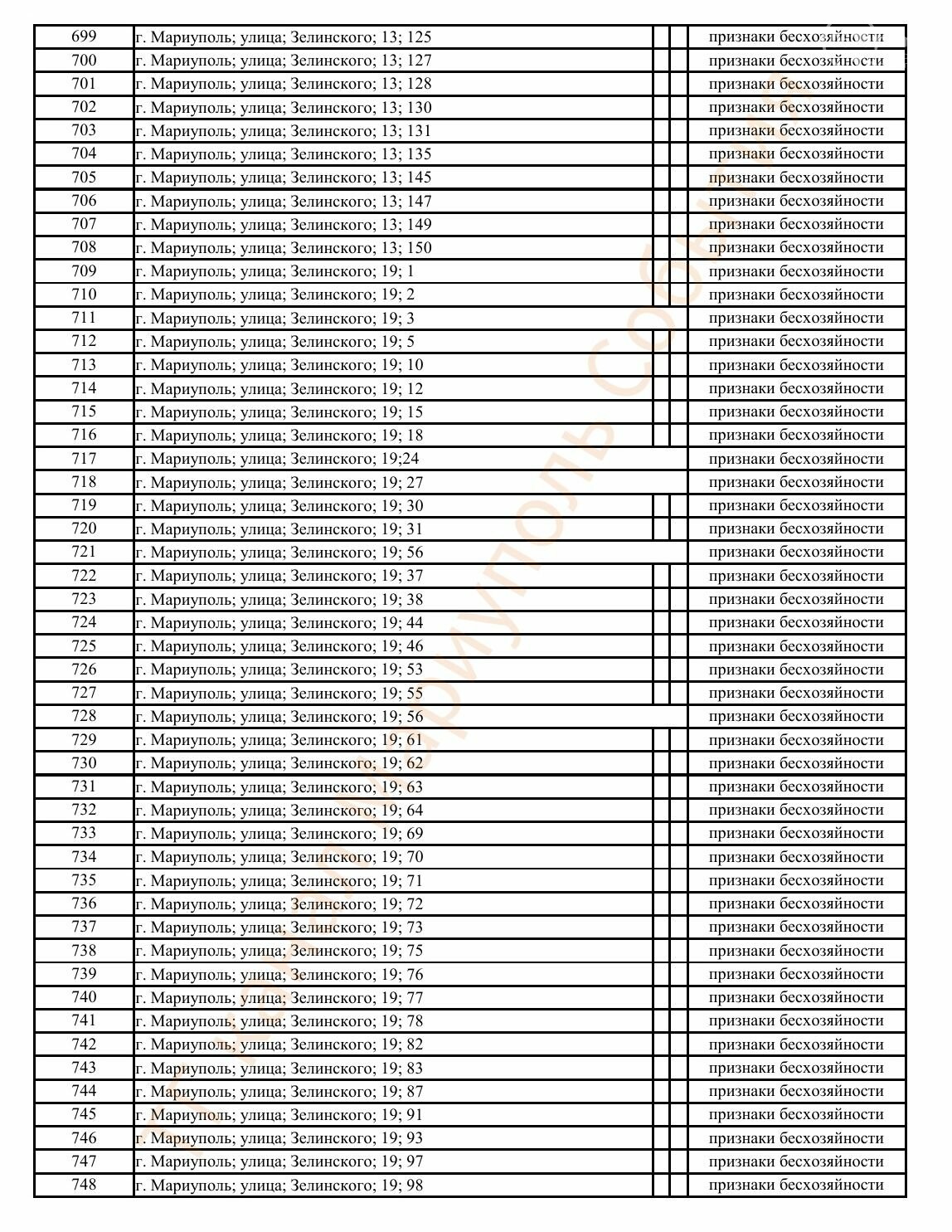 Окупаційна адміністрація Маріуполя оприлюднила черговий перелік нерухомості, яку визнали такою, що «має ознаки безхазяйності». У списку — близько 13 тисяч об’єктів, переважно квартир та житлових приміщень.