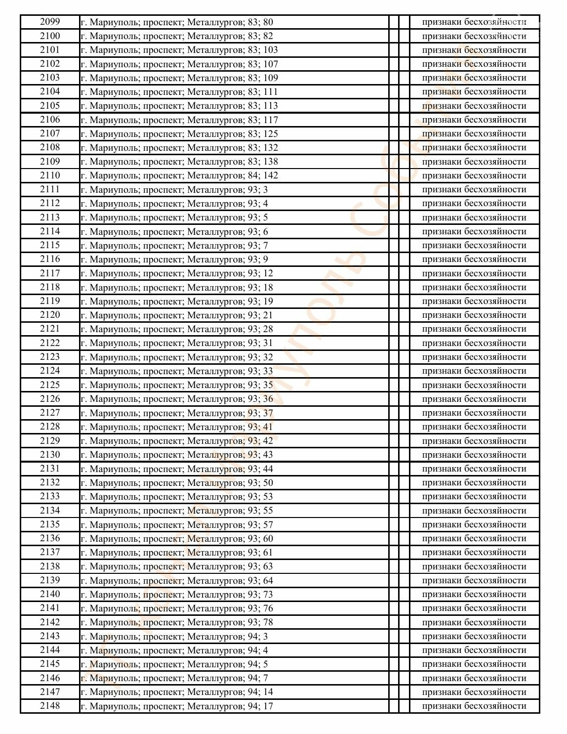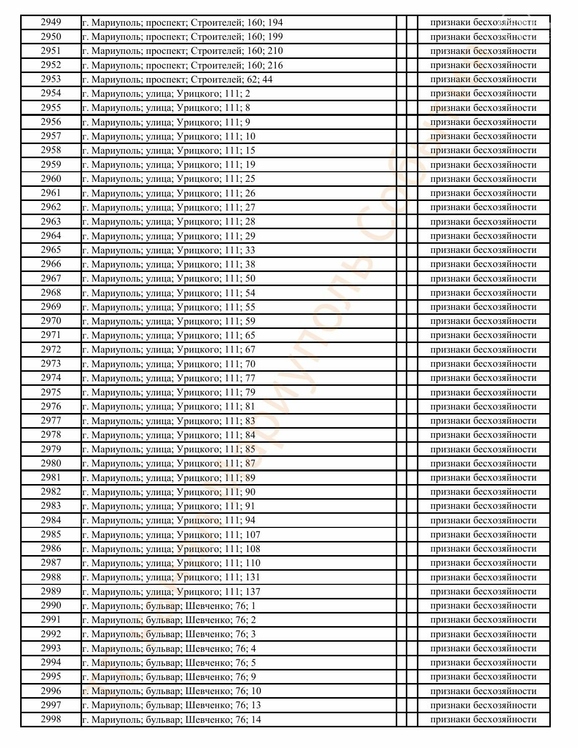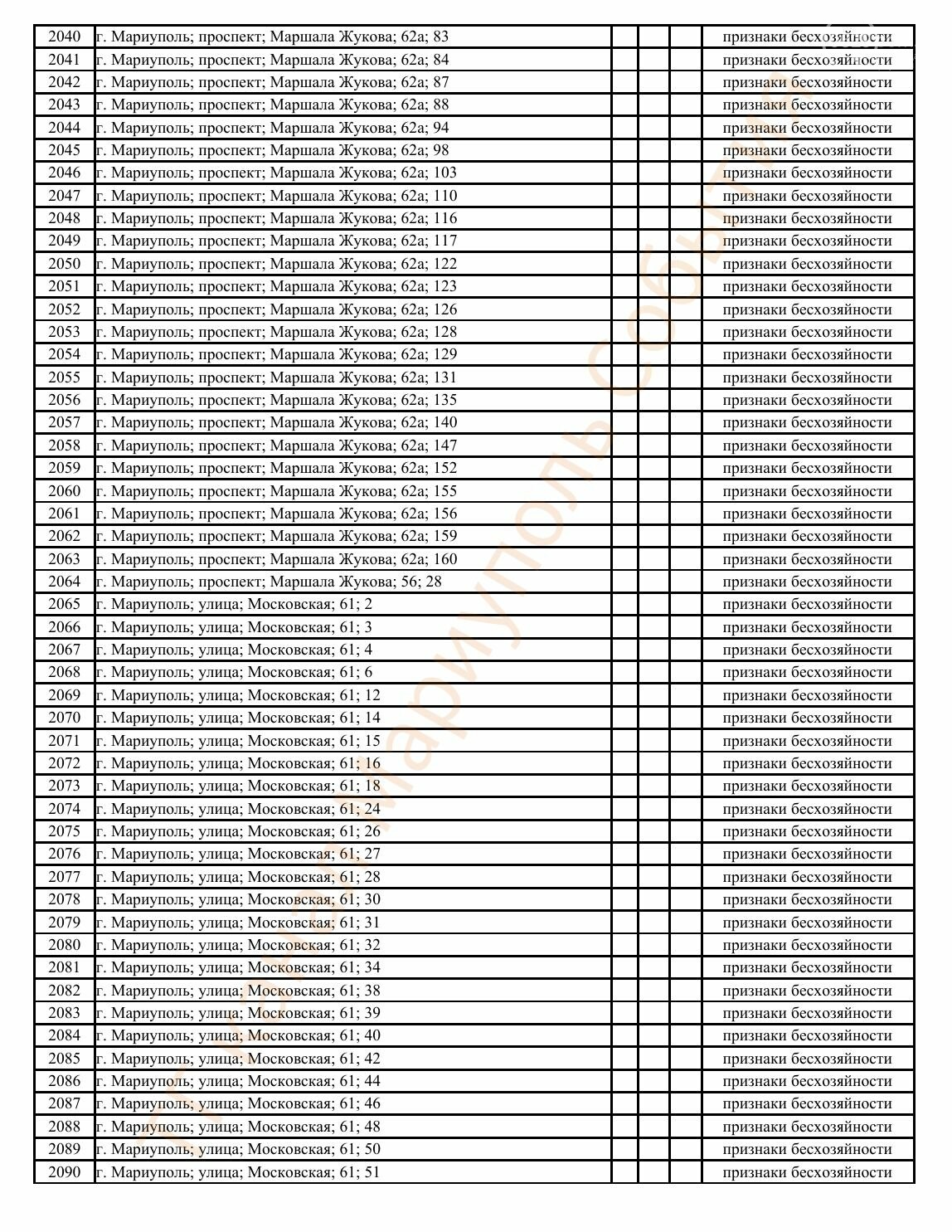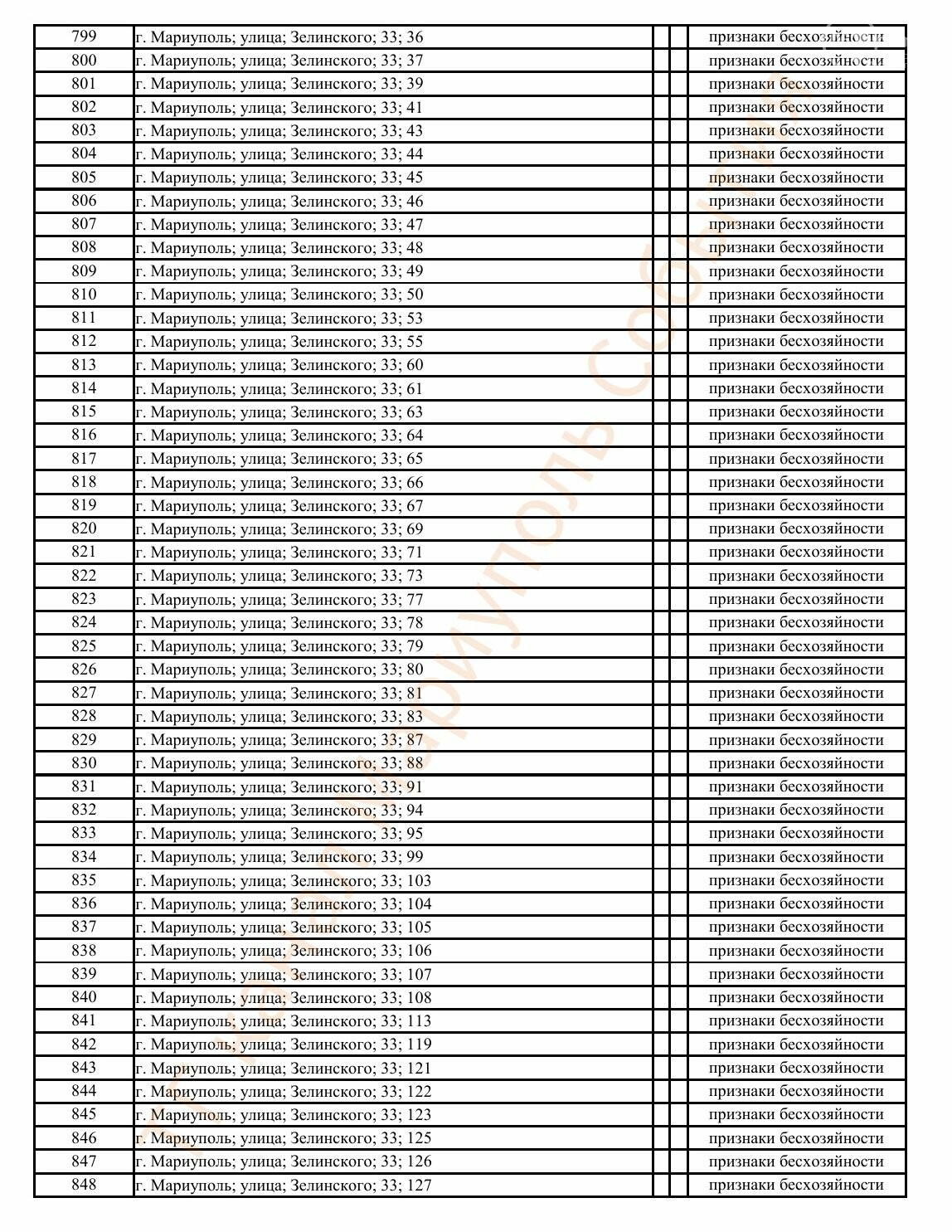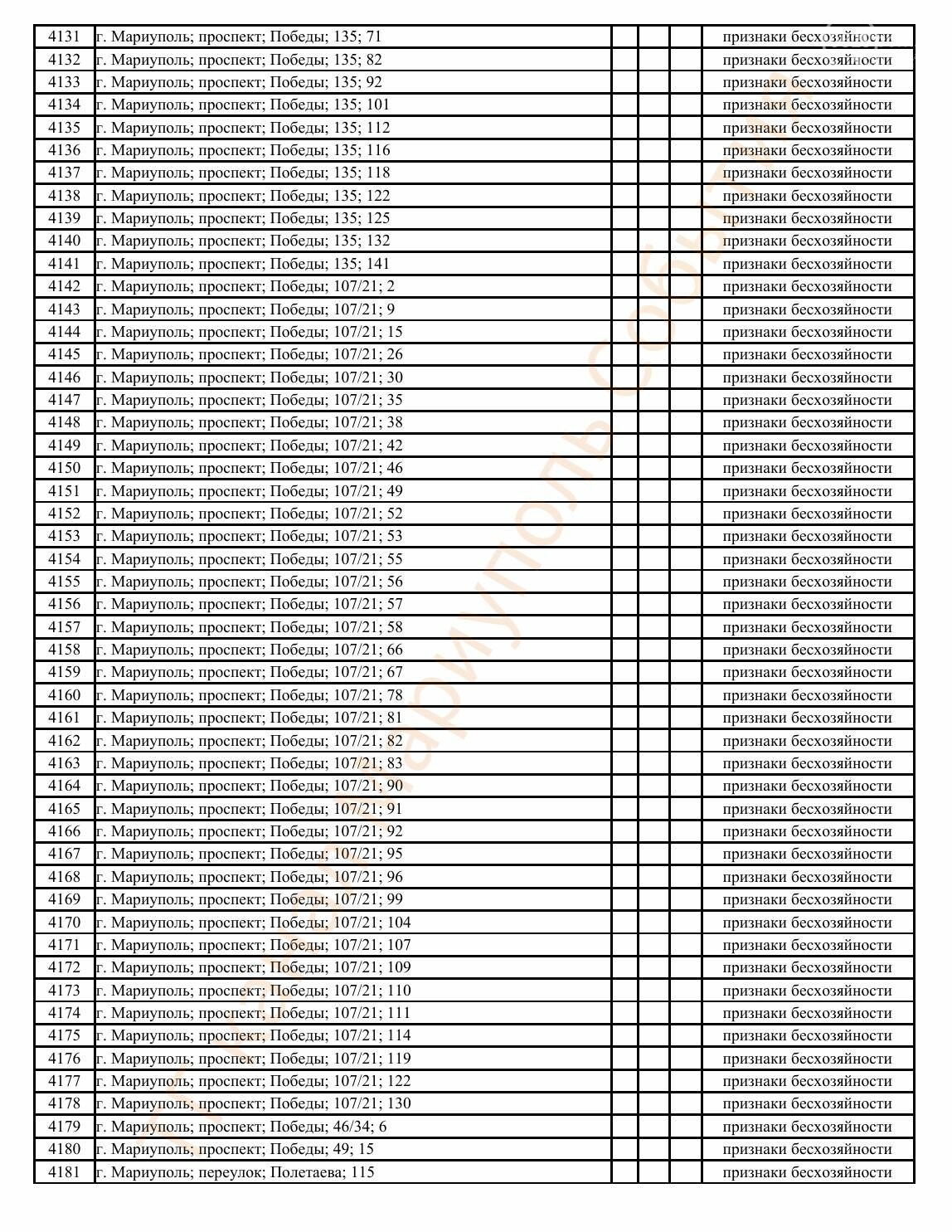 Окупаційна адміністрація Маріуполя оприлюднила черговий перелік нерухомості, яку визнали такою, що «має ознаки безхазяйності». У списку — близько 13 тисяч об’єктів, переважно квартир та житлових приміщень.