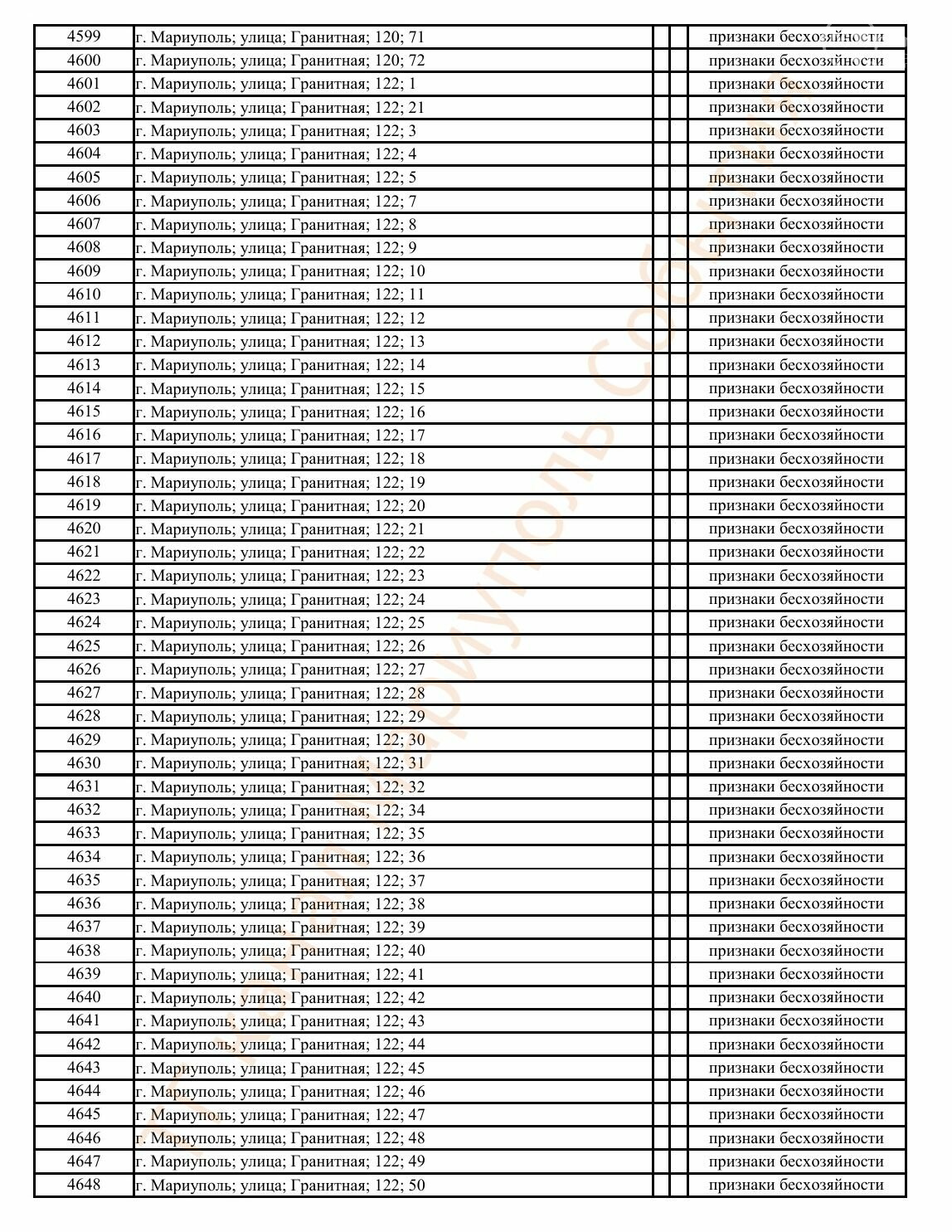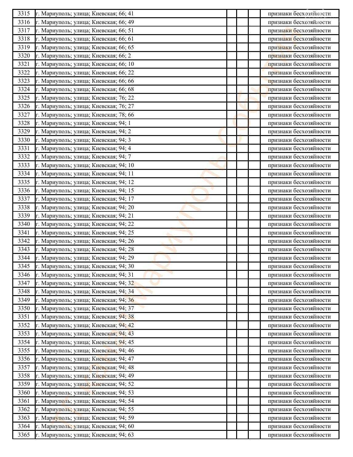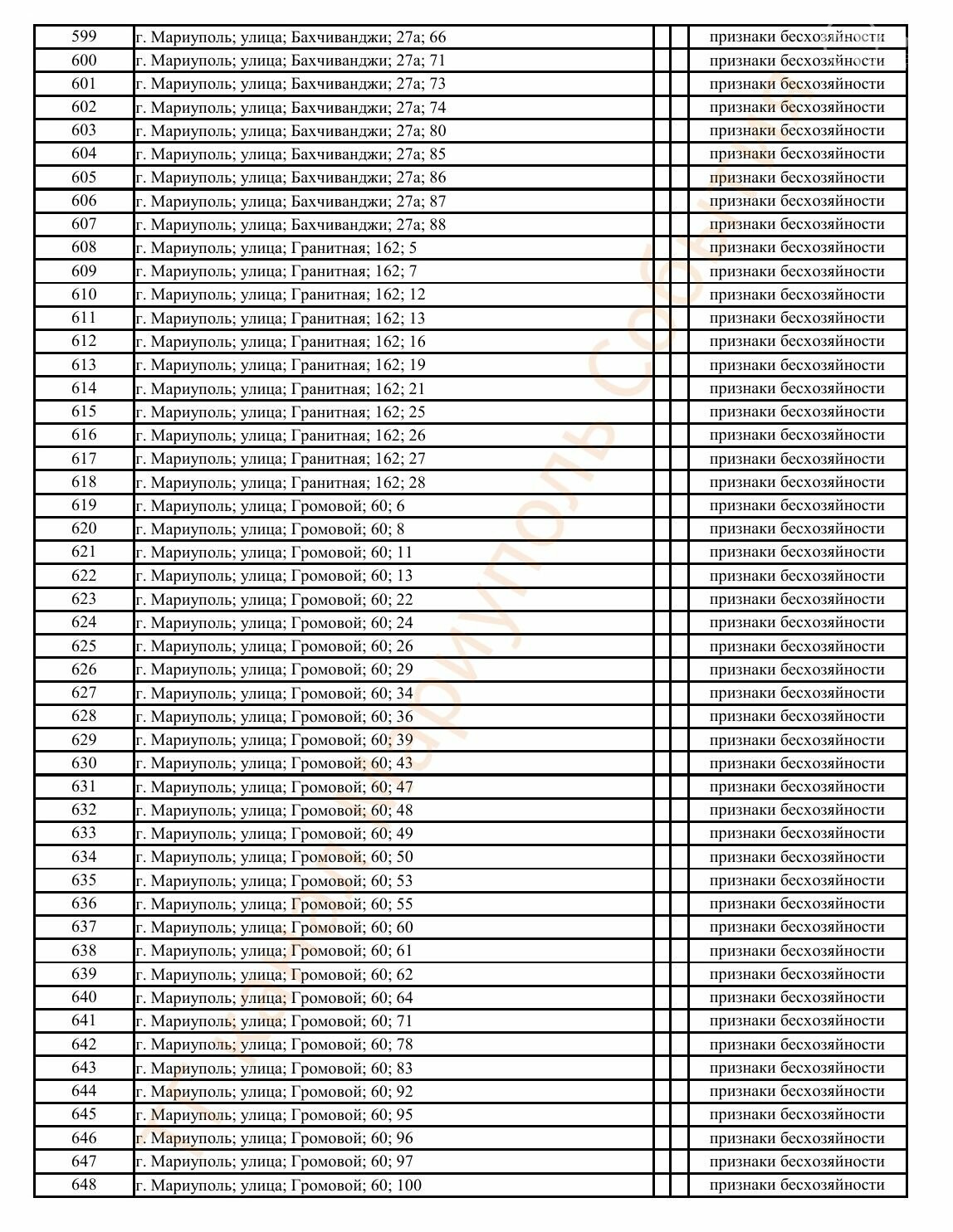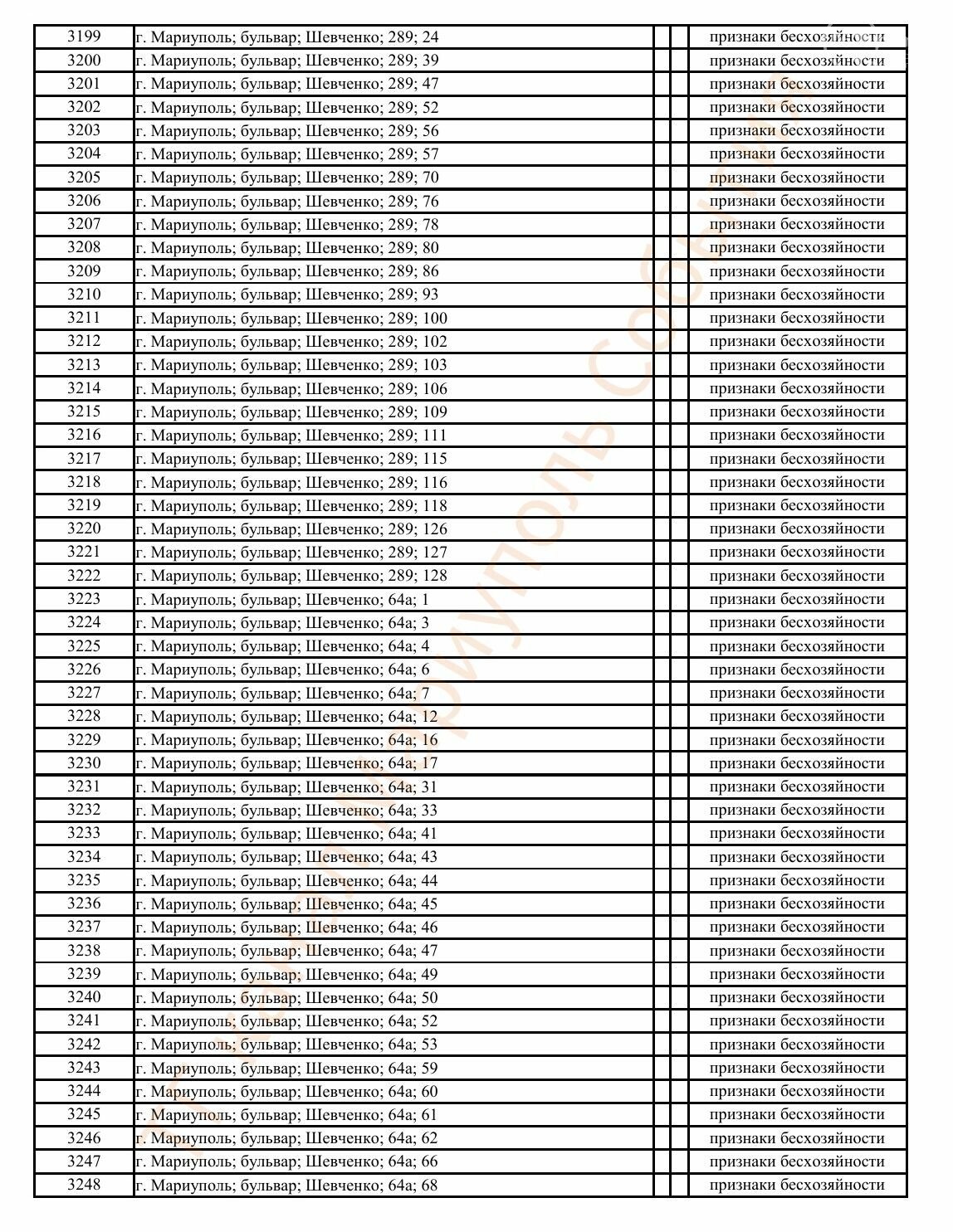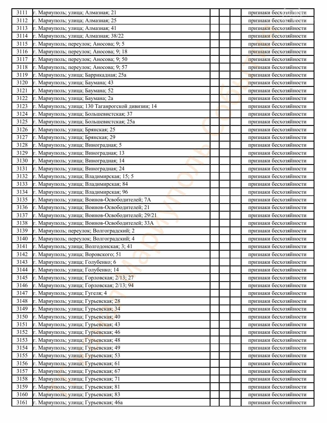 Окупаційна адміністрація Маріуполя оприлюднила черговий перелік нерухомості, яку визнали такою, що «має ознаки безхазяйності». У списку — близько 13 тисяч об’єктів, переважно квартир та житлових приміщень.