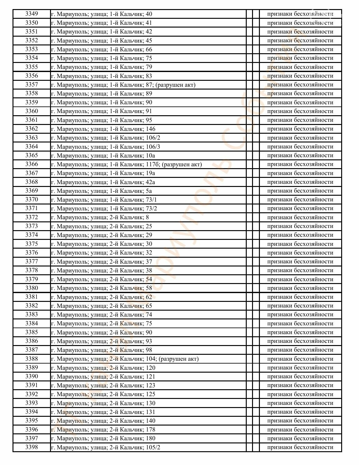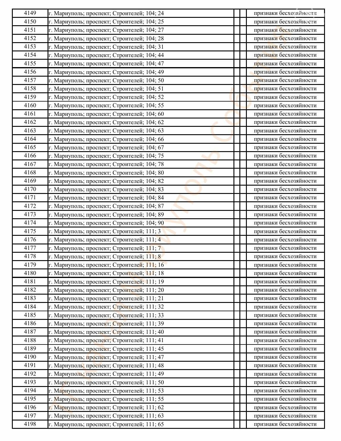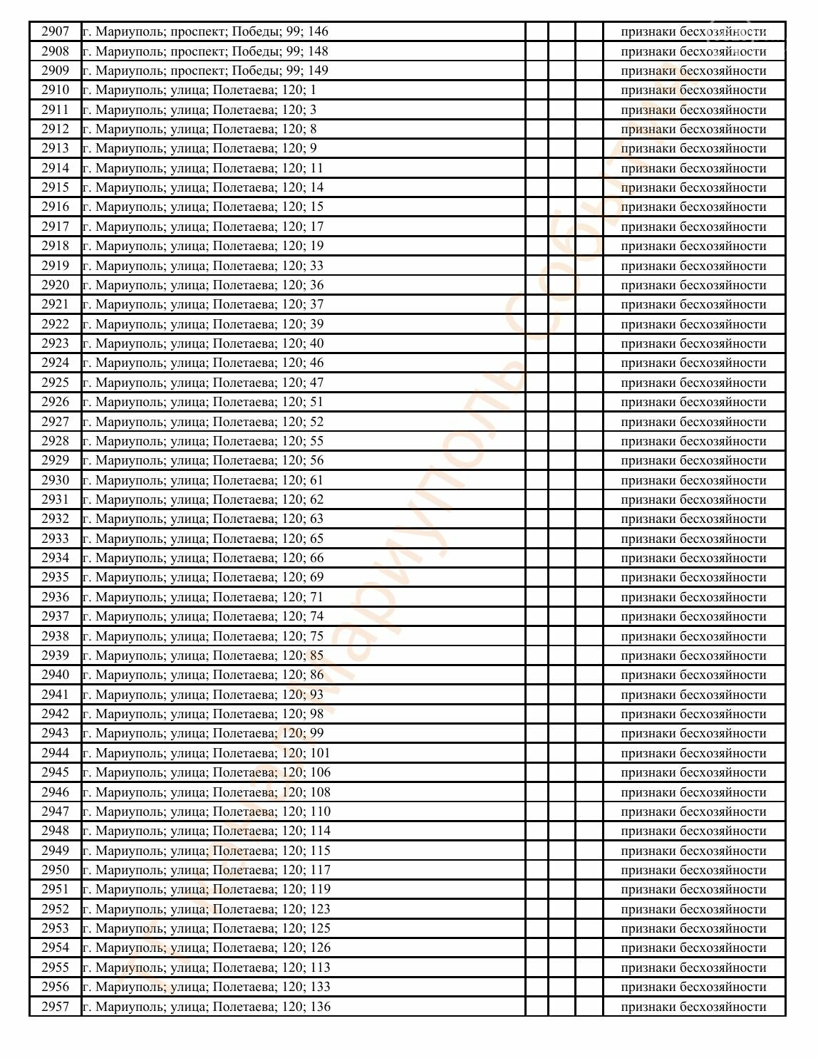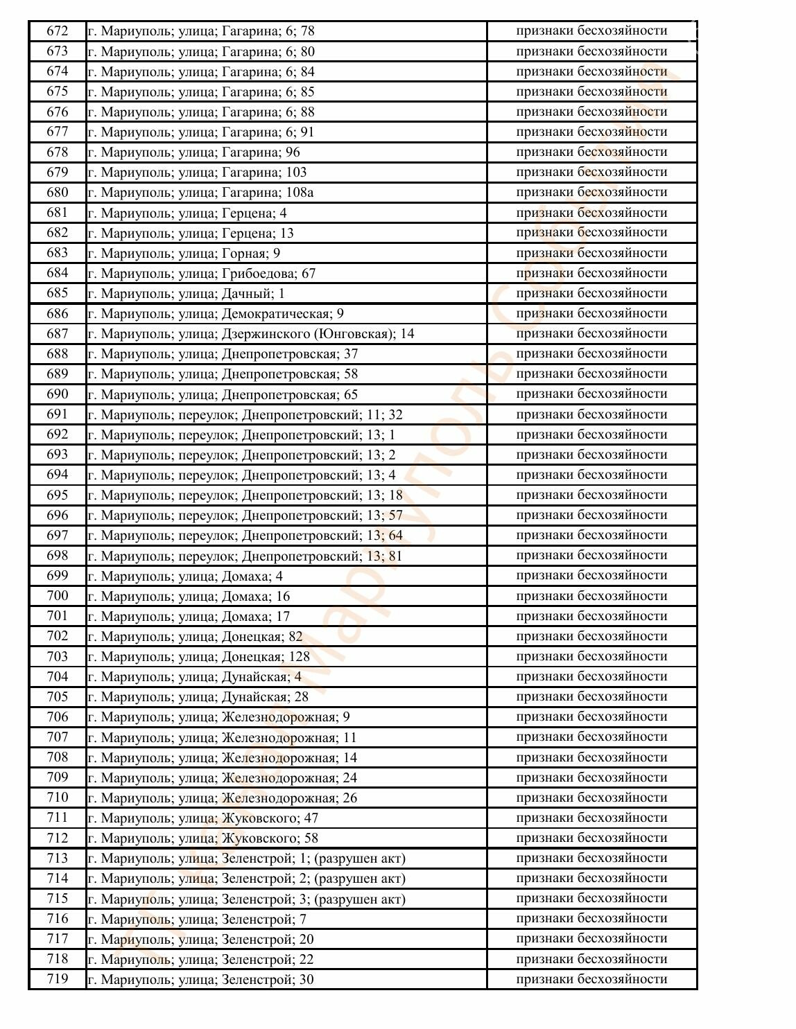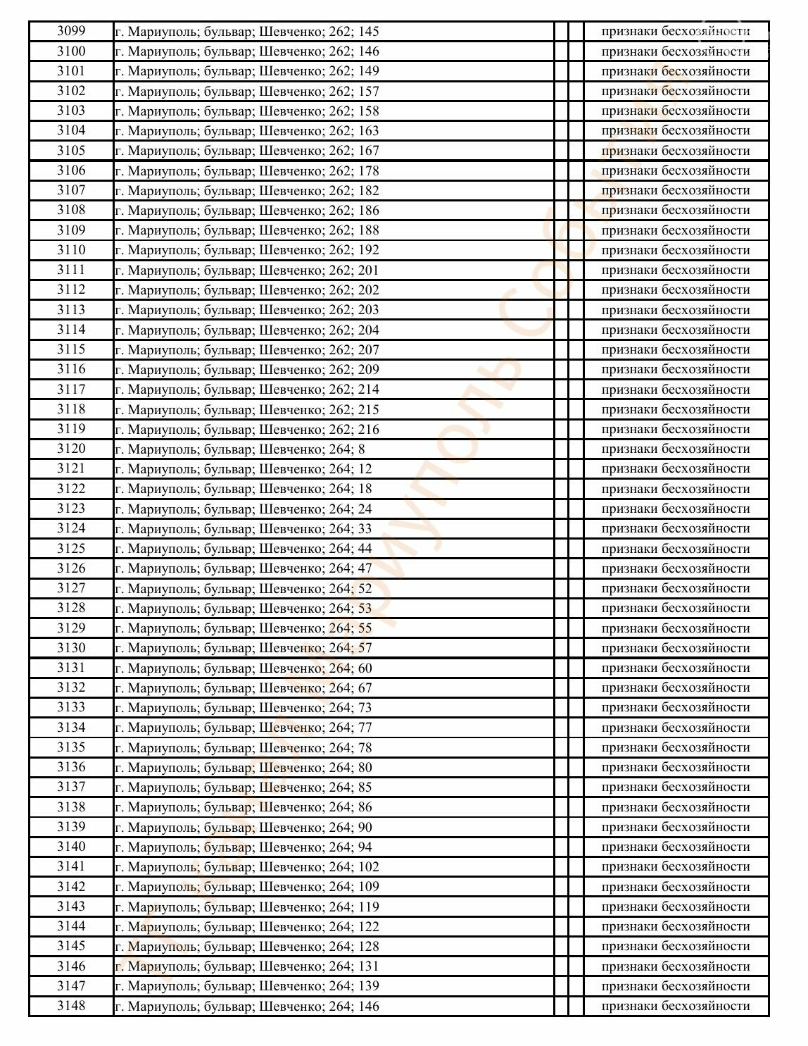 Окупаційна адміністрація Маріуполя оприлюднила черговий перелік нерухомості, яку визнали такою, що «має ознаки безхазяйності». У списку — близько 13 тисяч об’єктів, переважно квартир та житлових приміщень.