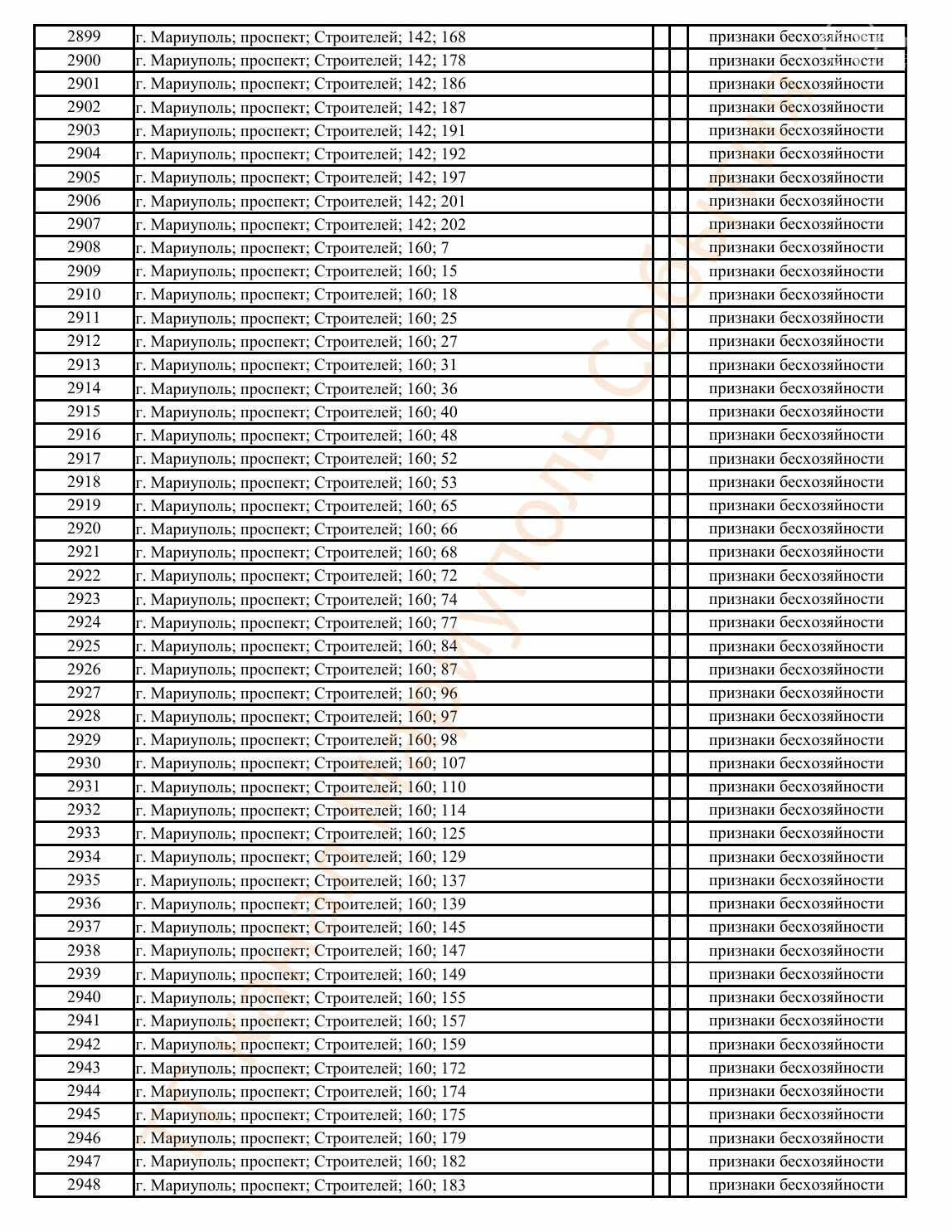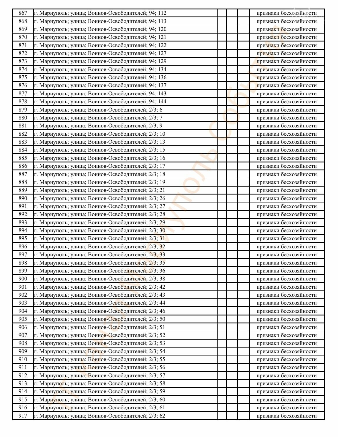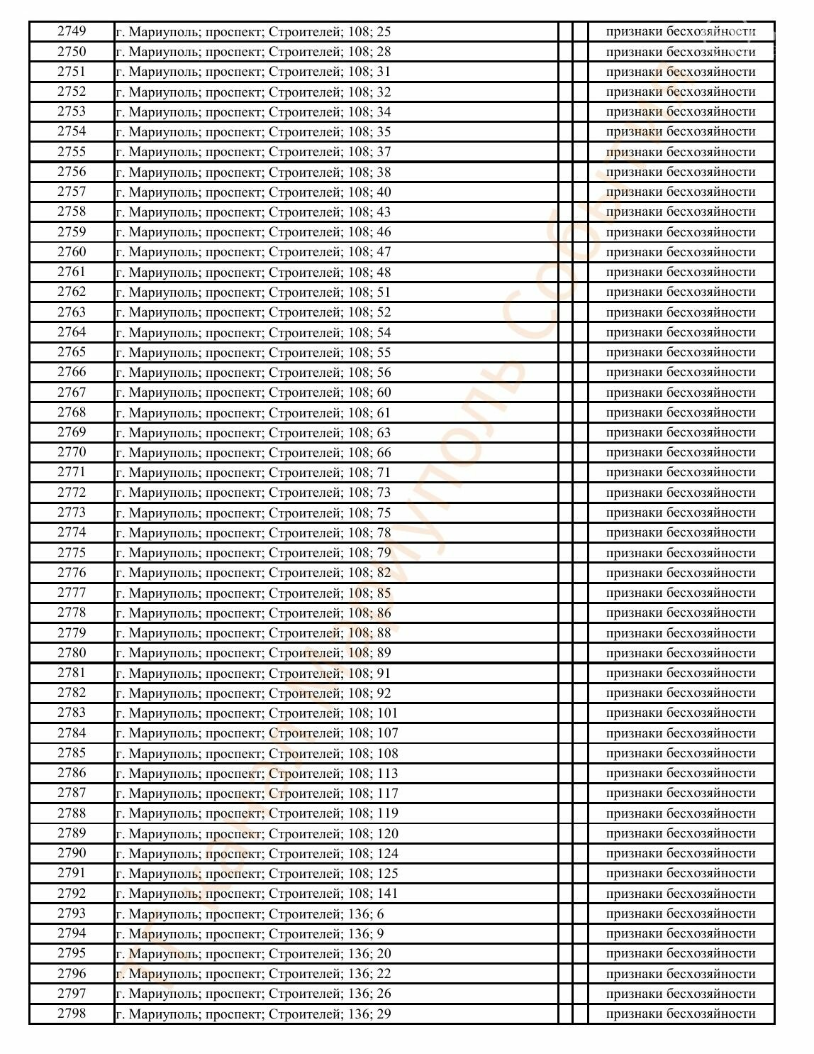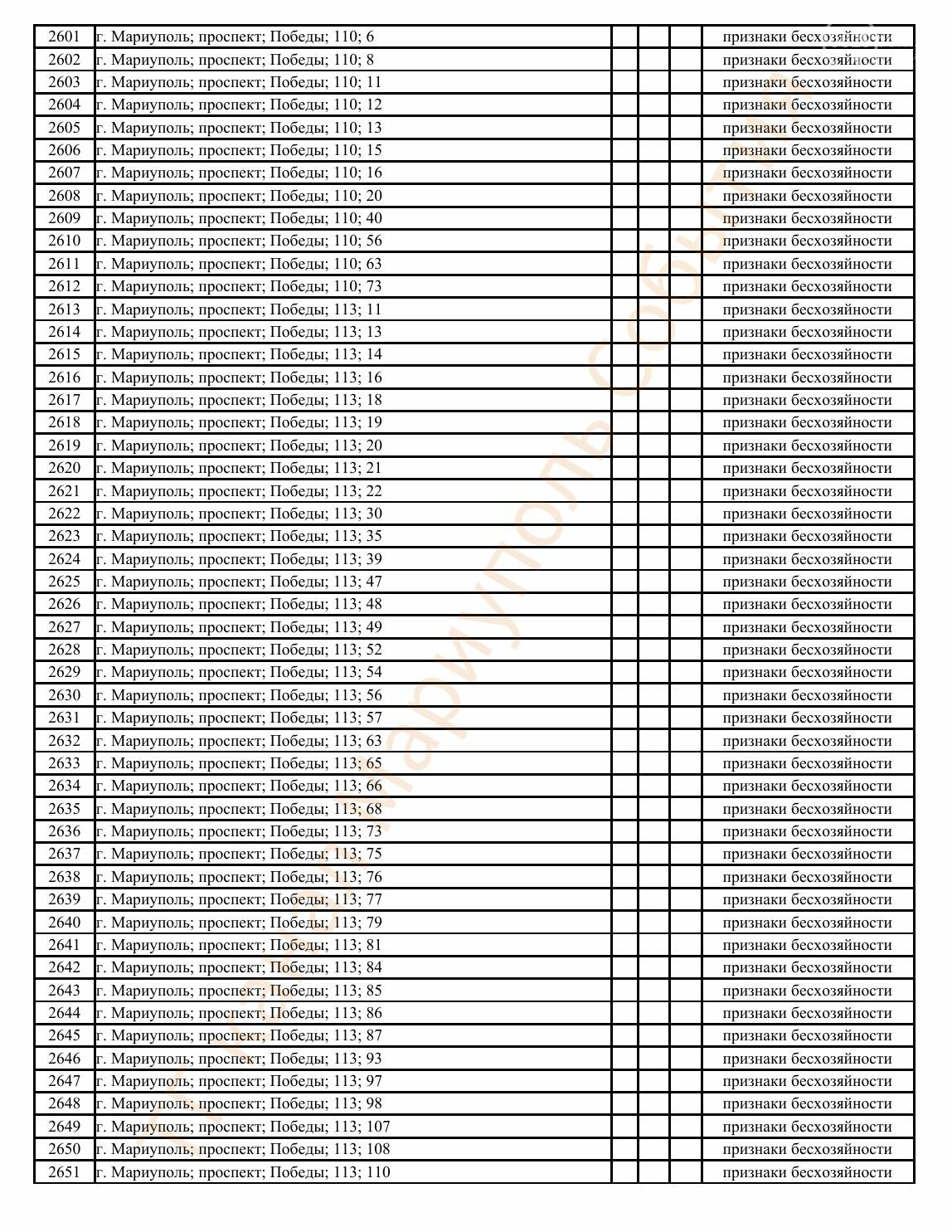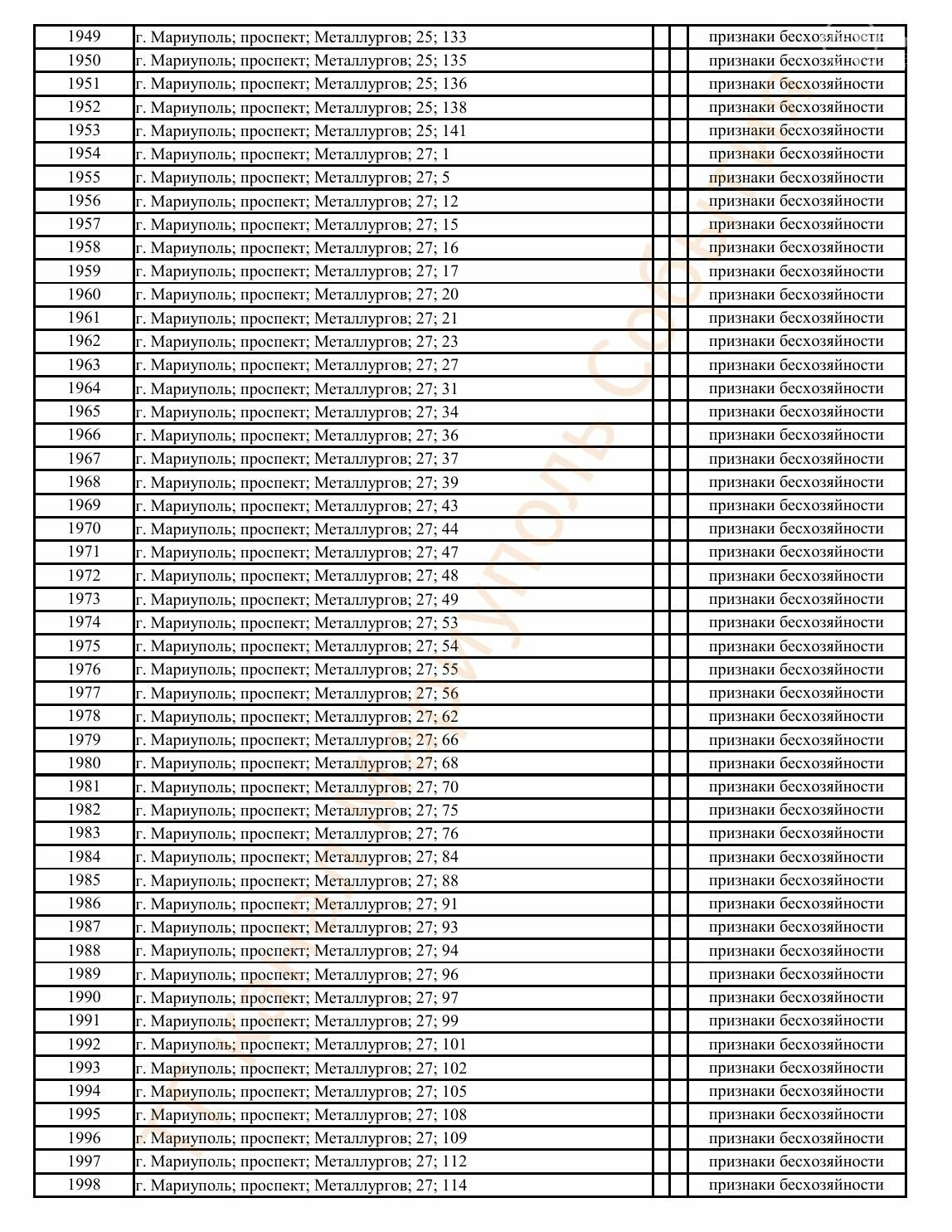 Окупаційна адміністрація Маріуполя оприлюднила черговий перелік нерухомості, яку визнали такою, що «має ознаки безхазяйності». У списку — близько 13 тисяч об’єктів, переважно квартир та житлових приміщень.