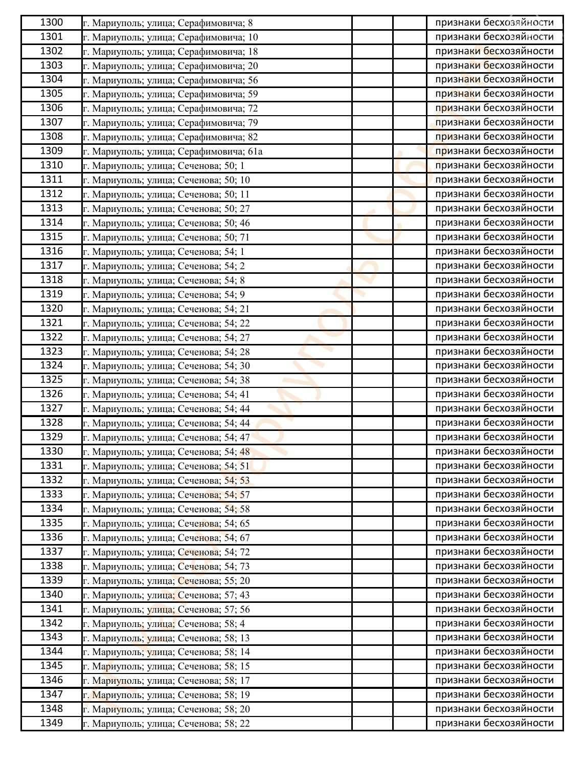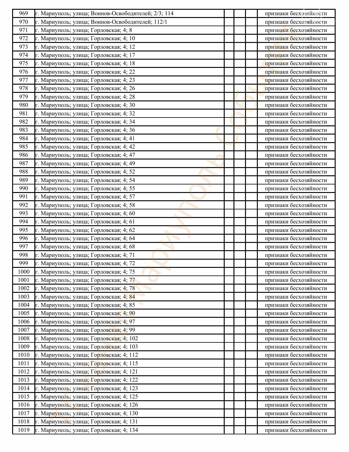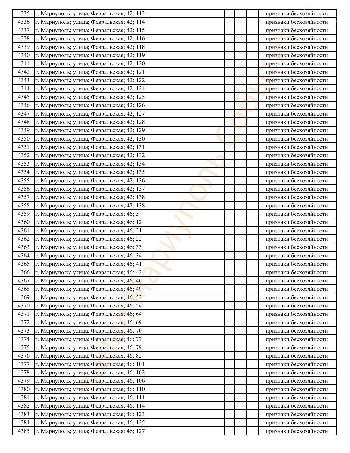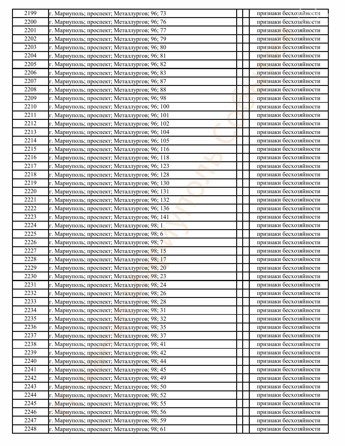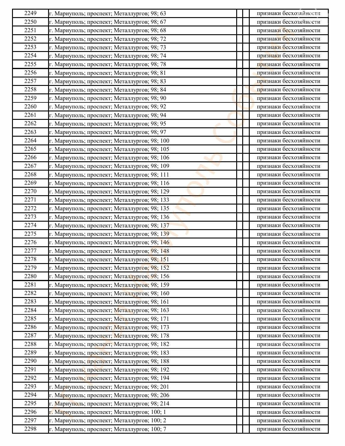 Окупаційна адміністрація Маріуполя оприлюднила черговий перелік нерухомості, яку визнали такою, що «має ознаки безхазяйності». У списку — близько 13 тисяч об’єктів, переважно квартир та житлових приміщень.