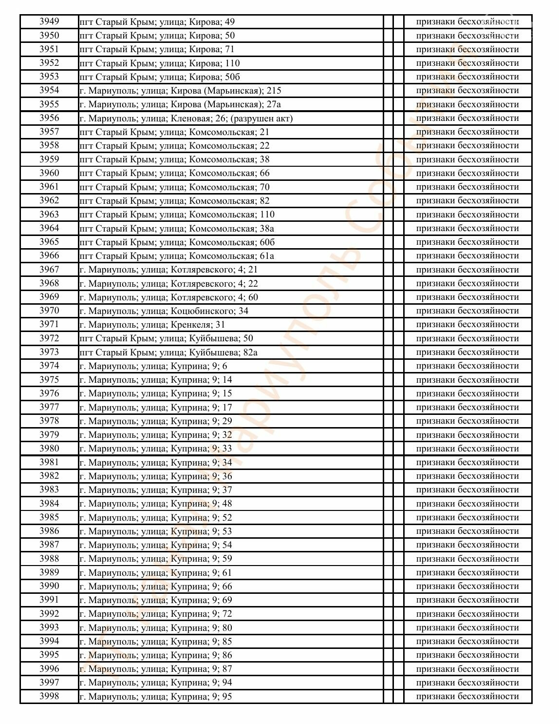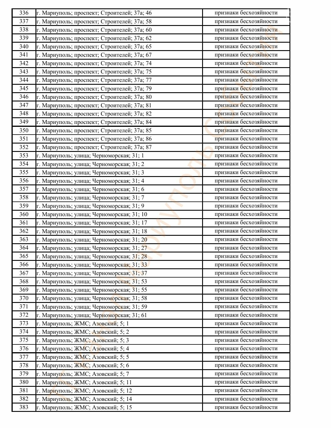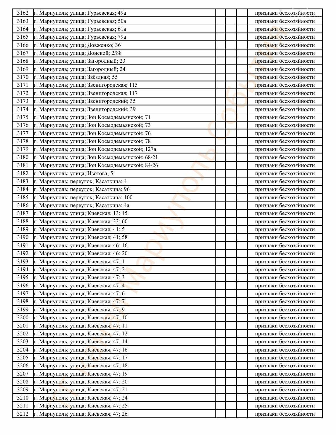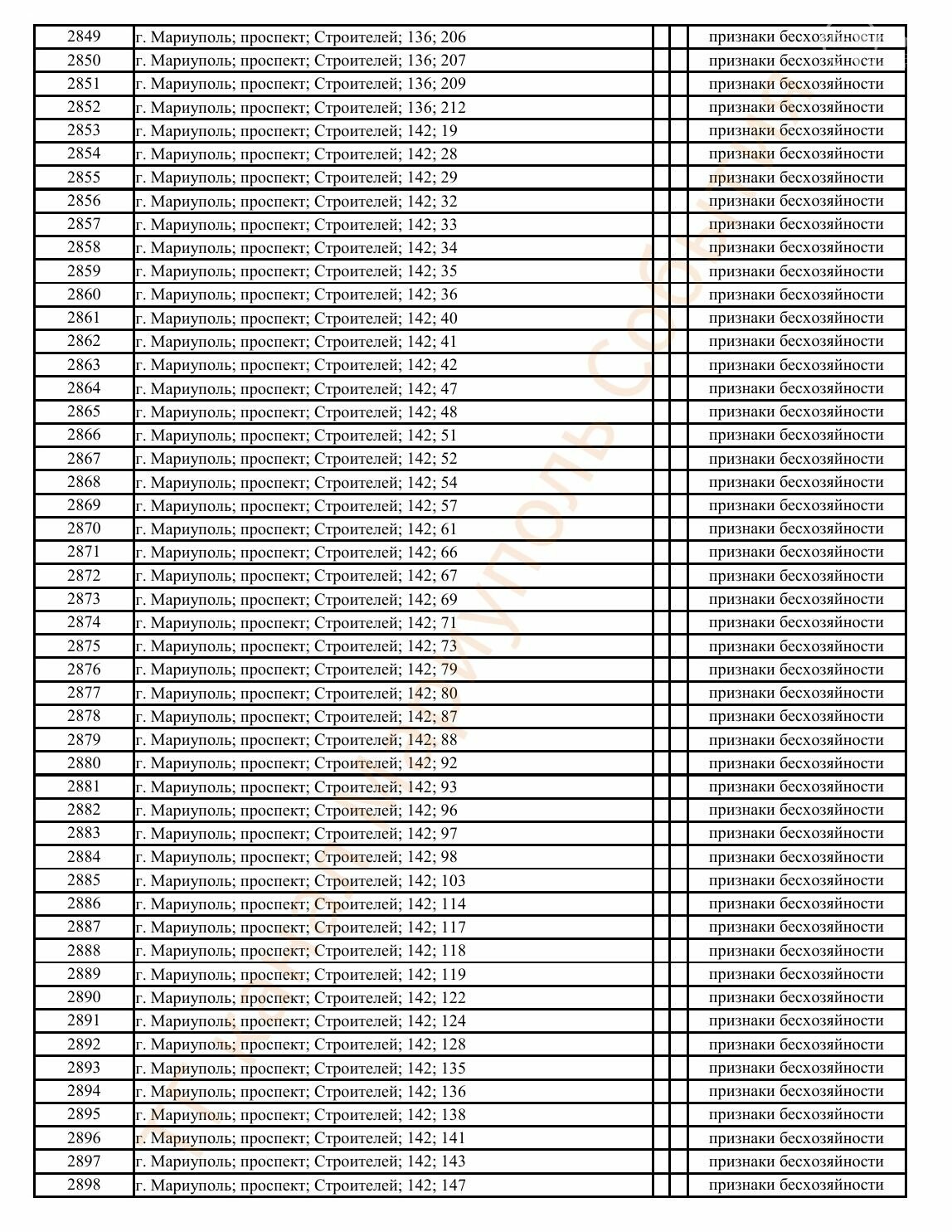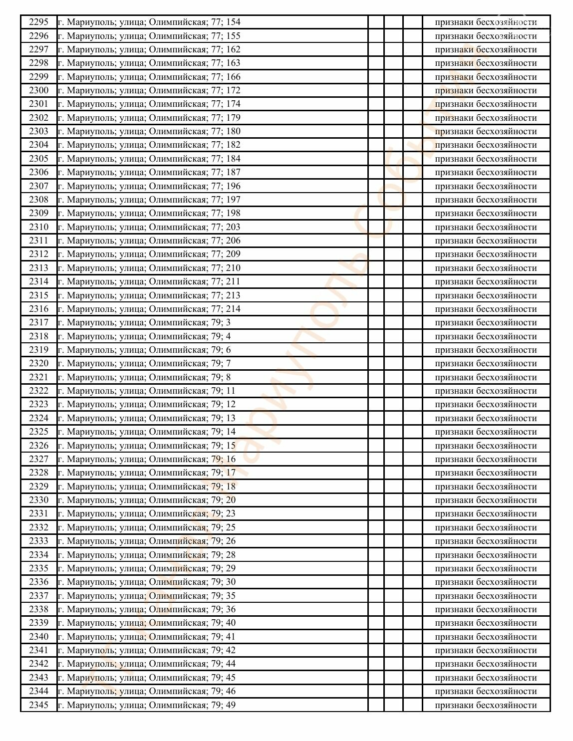 Окупаційна адміністрація Маріуполя оприлюднила черговий перелік нерухомості, яку визнали такою, що «має ознаки безхазяйності». У списку — близько 13 тисяч об’єктів, переважно квартир та житлових приміщень.