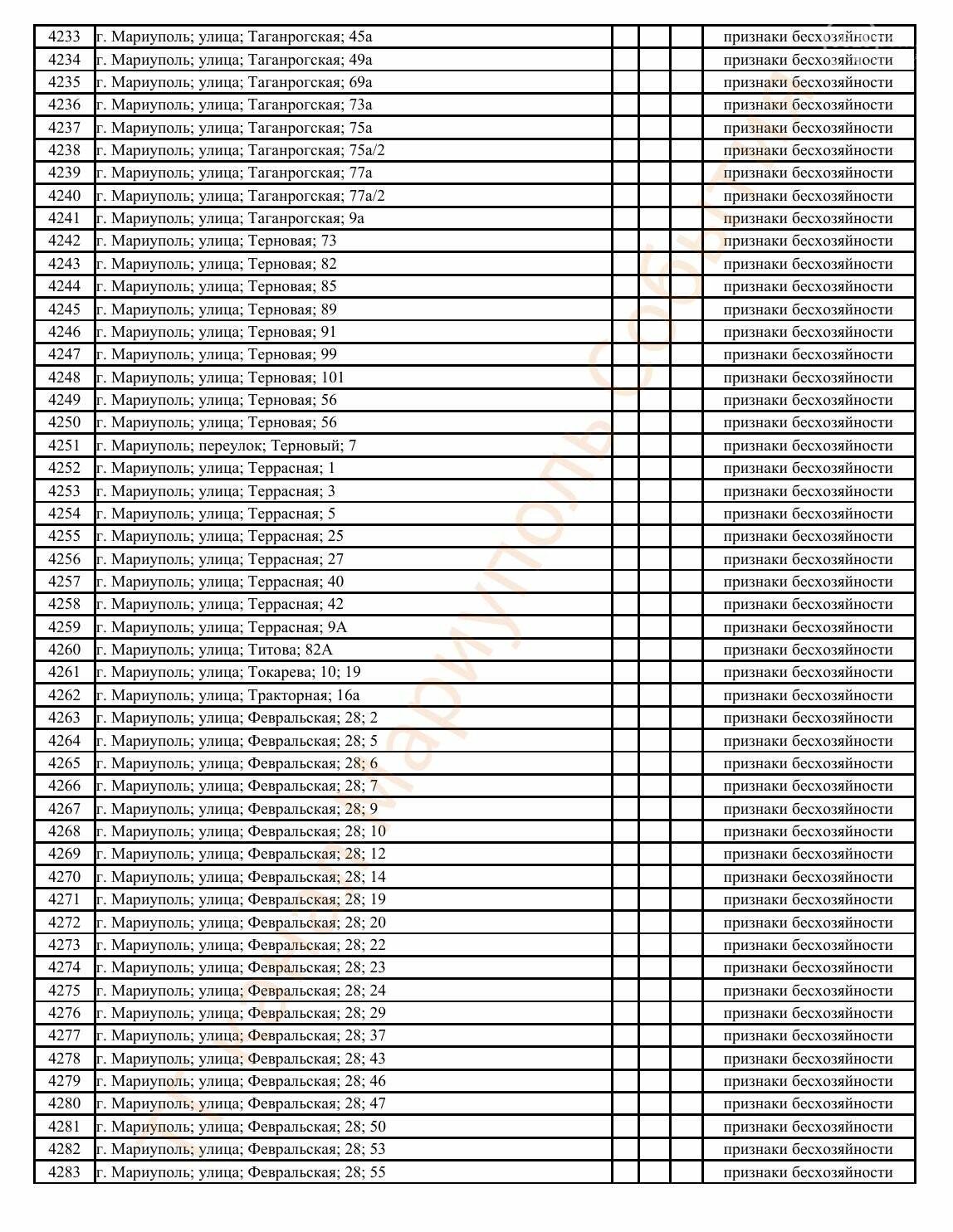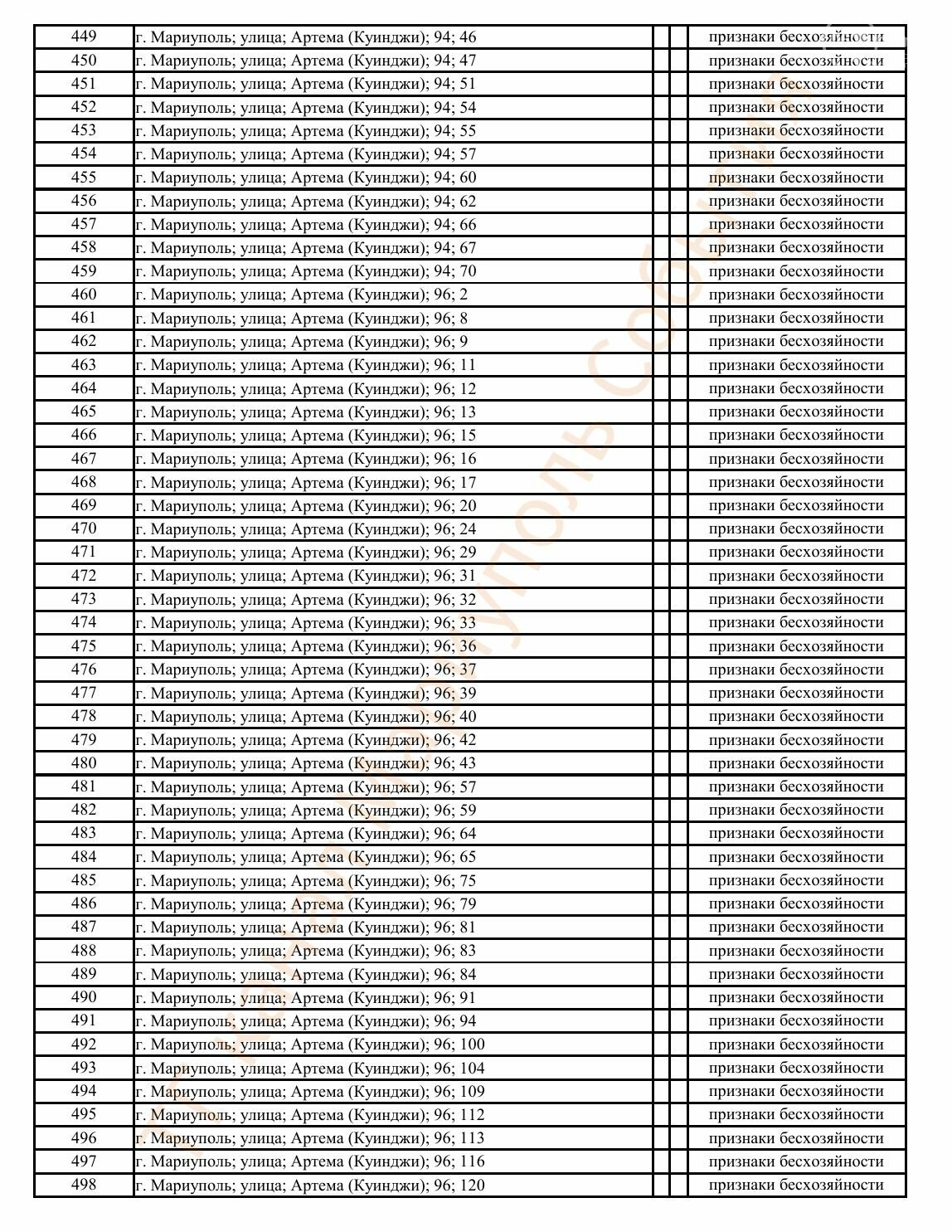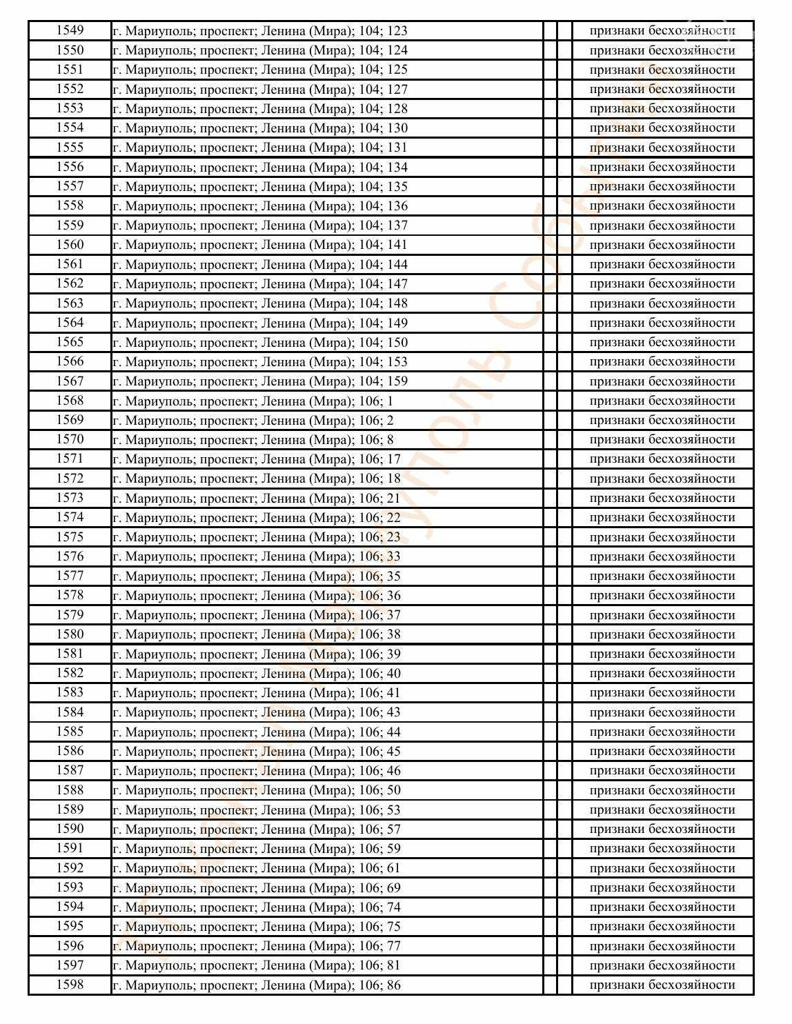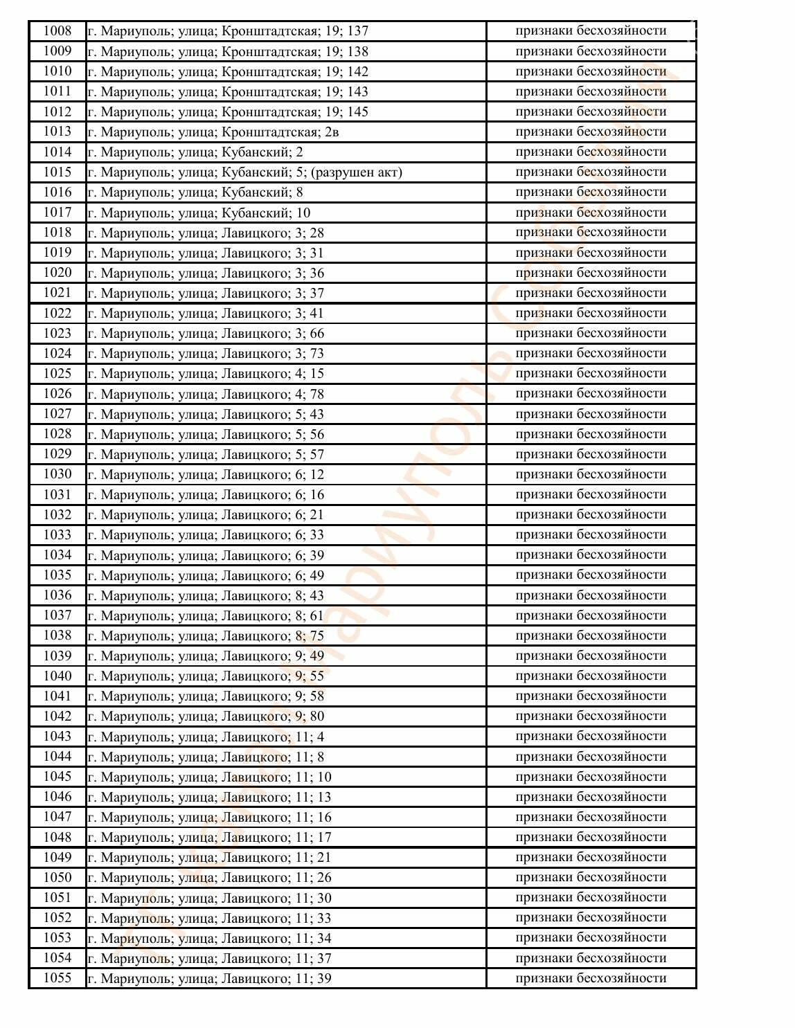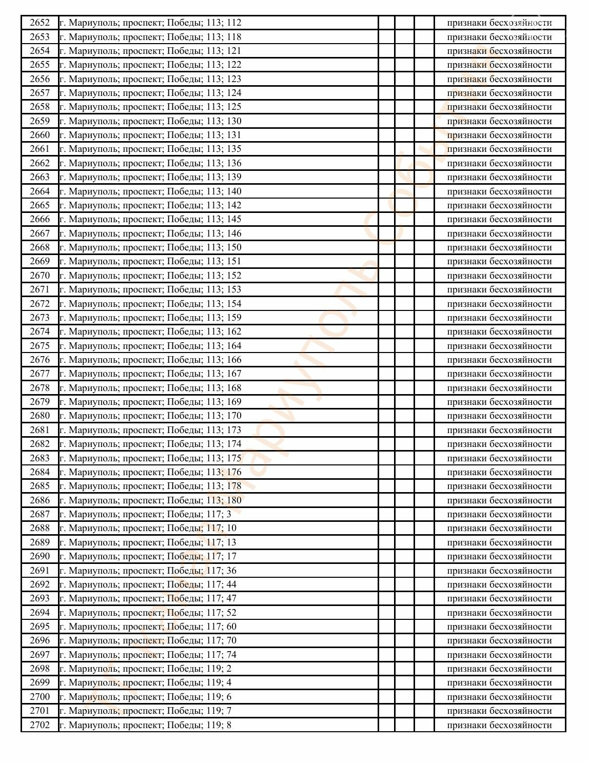 Окупаційна адміністрація Маріуполя оприлюднила черговий перелік нерухомості, яку визнали такою, що «має ознаки безхазяйності». У списку — близько 13 тисяч об’єктів, переважно квартир та житлових приміщень.
