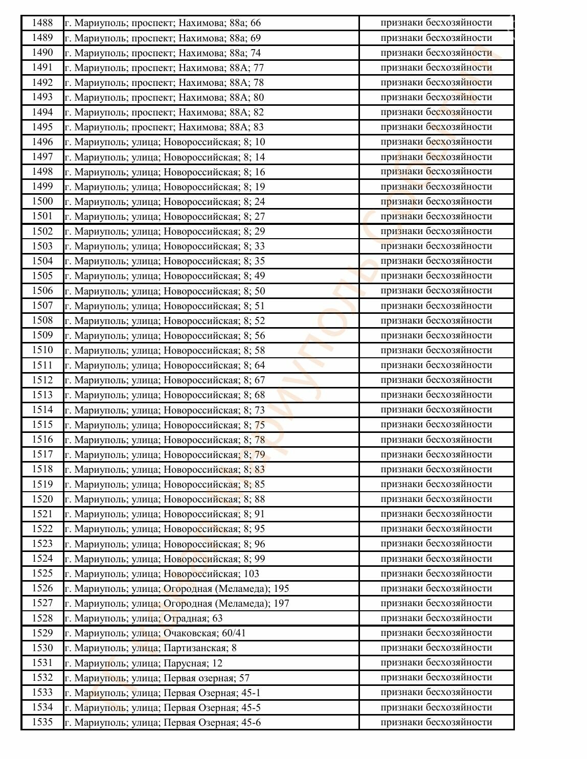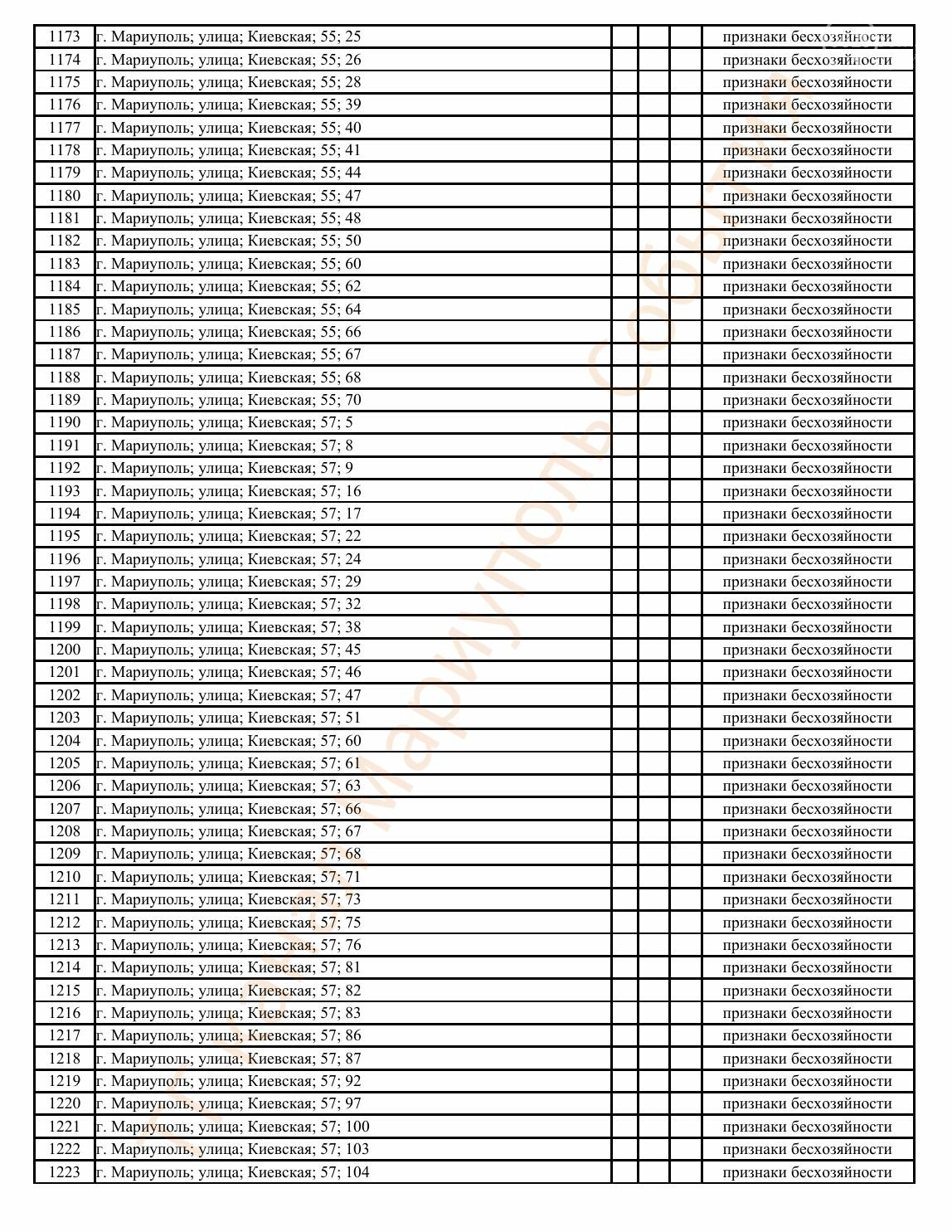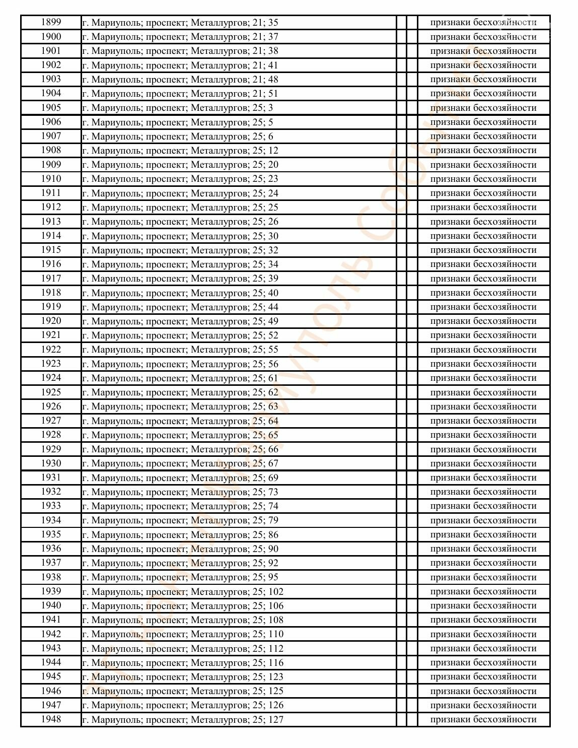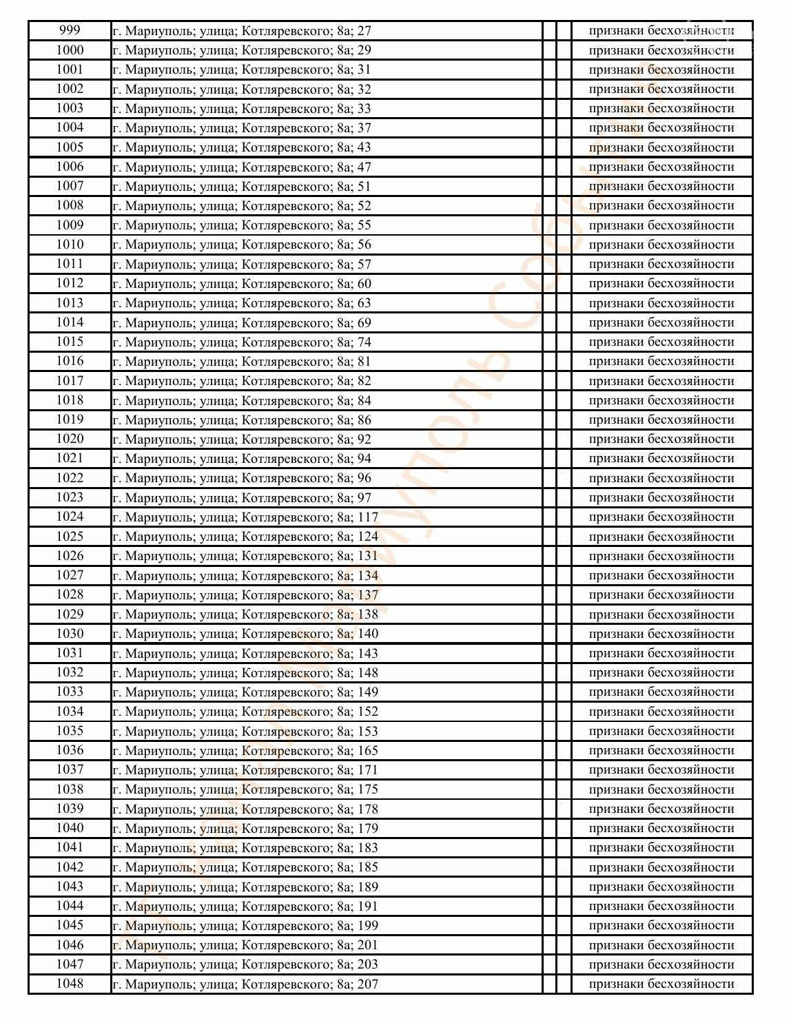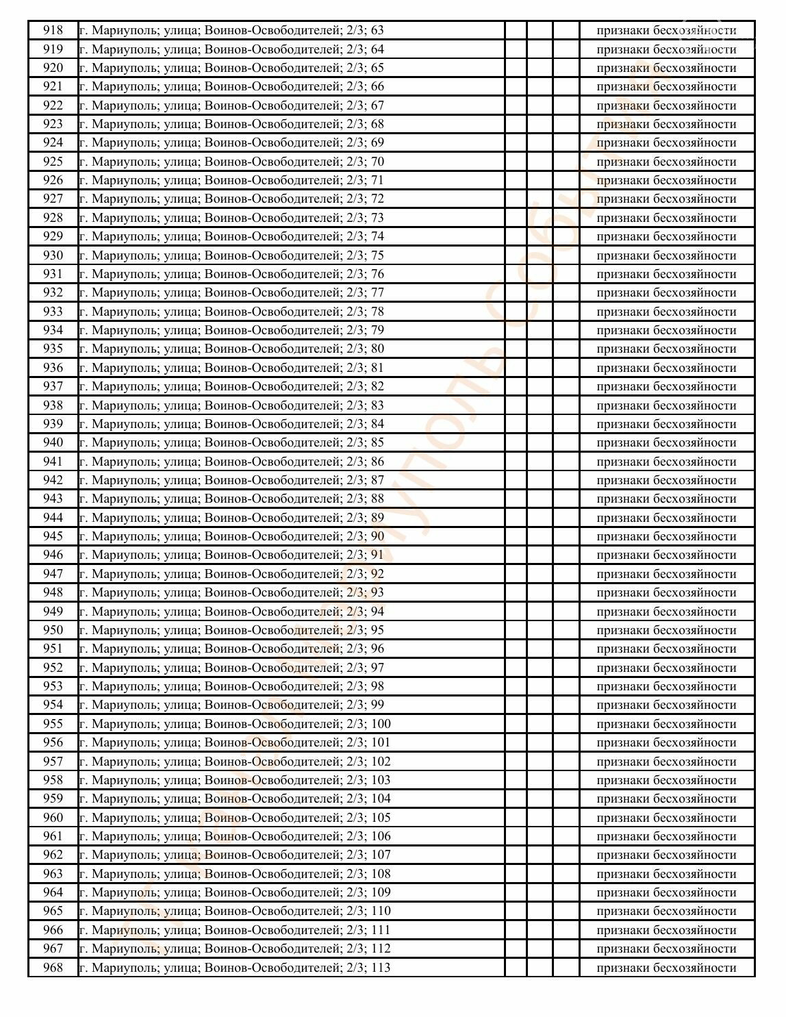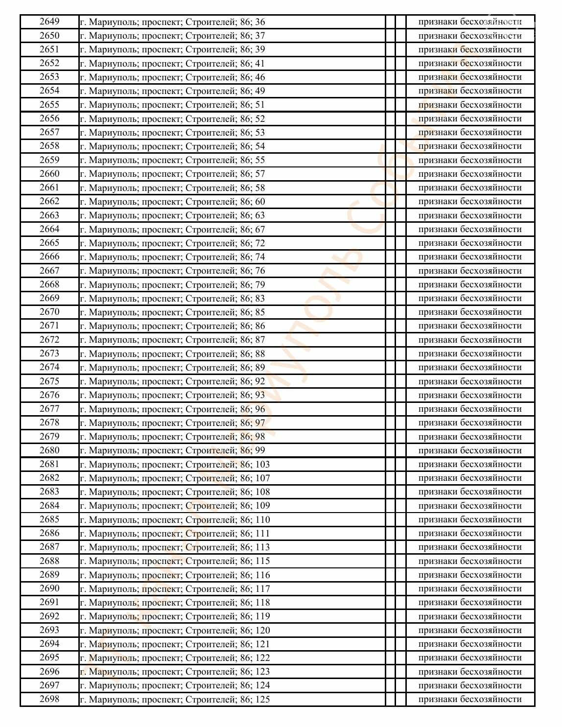 Окупаційна адміністрація Маріуполя оприлюднила черговий перелік нерухомості, яку визнали такою, що «має ознаки безхазяйності». У списку — близько 13 тисяч об’єктів, переважно квартир та житлових приміщень.