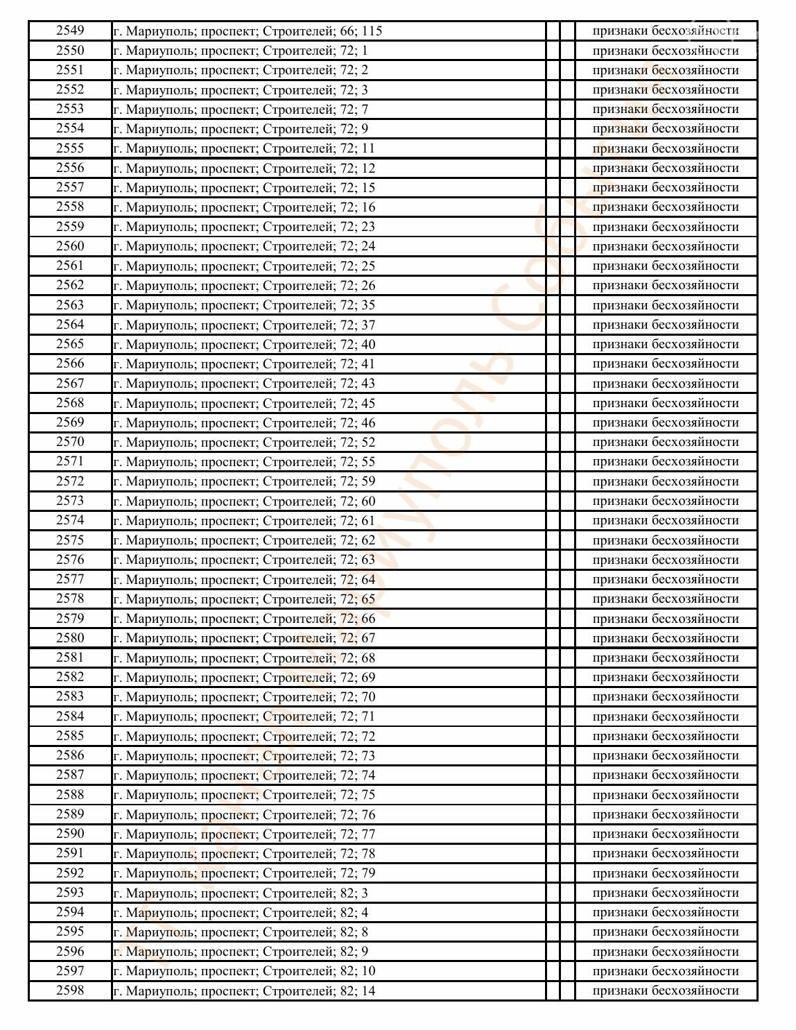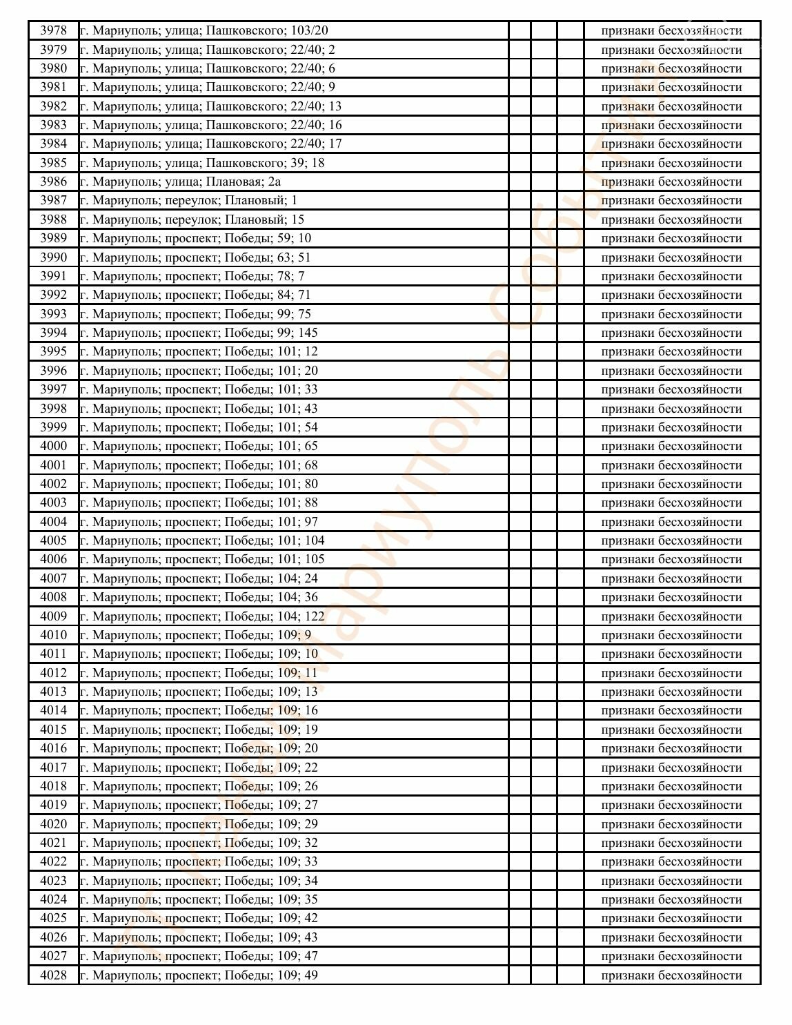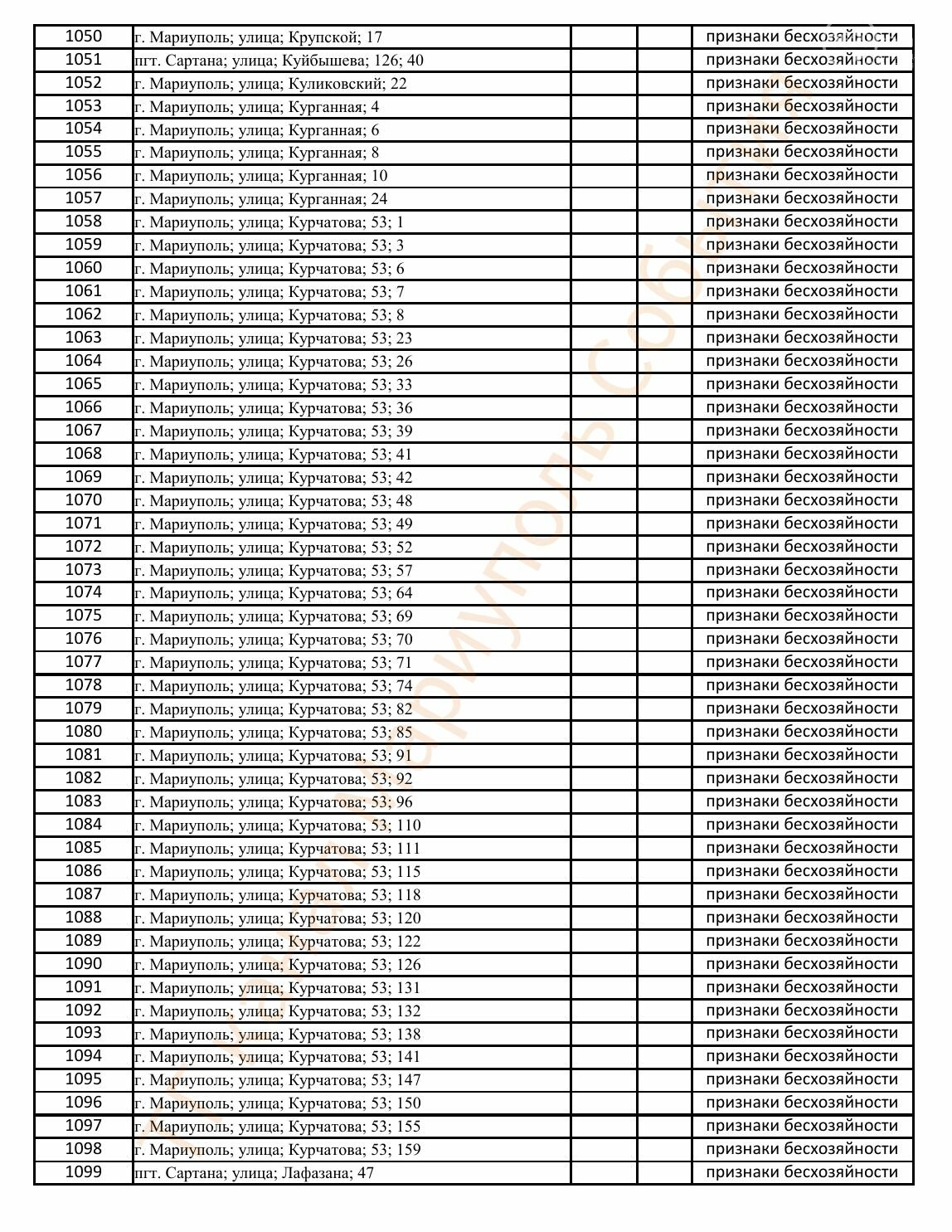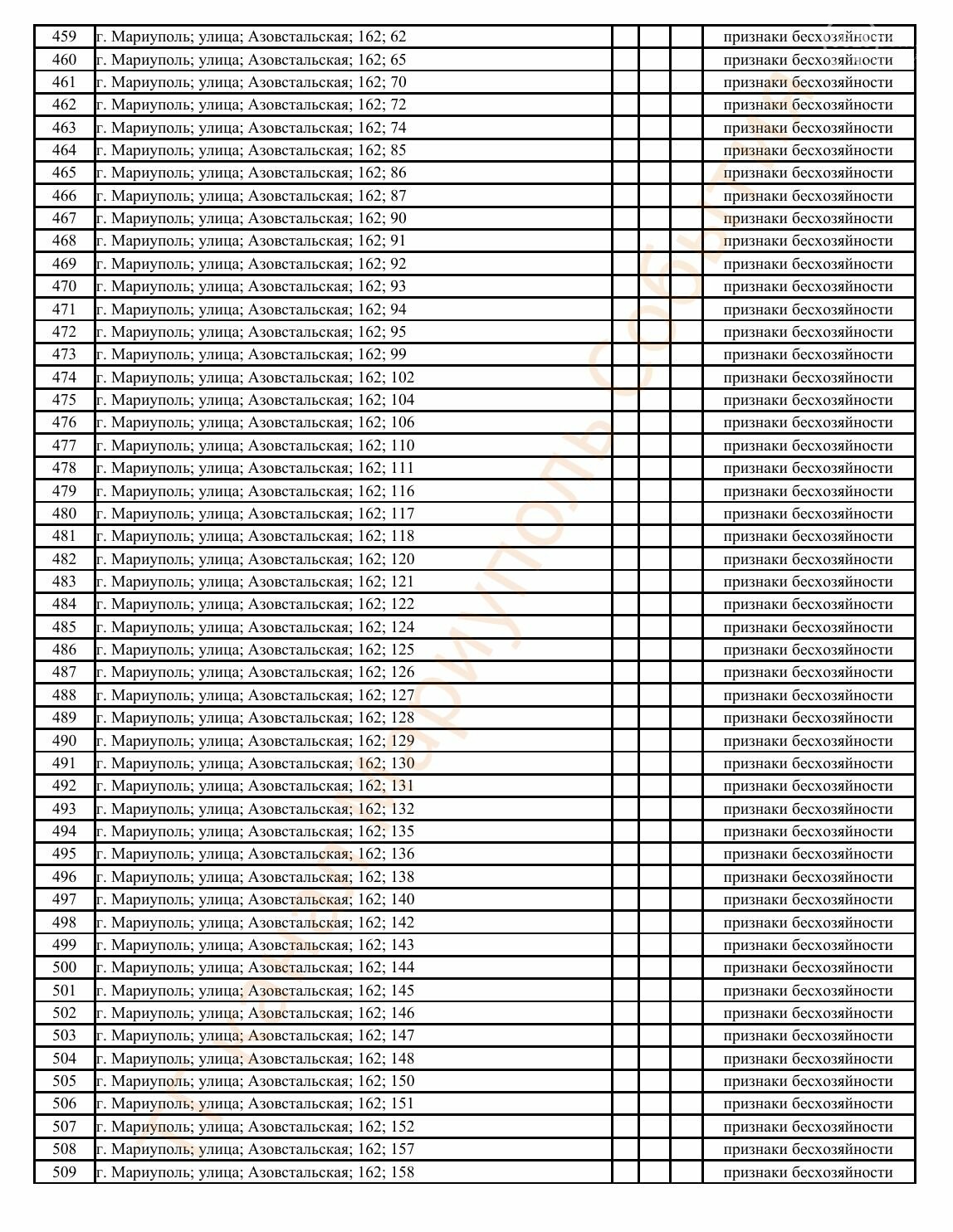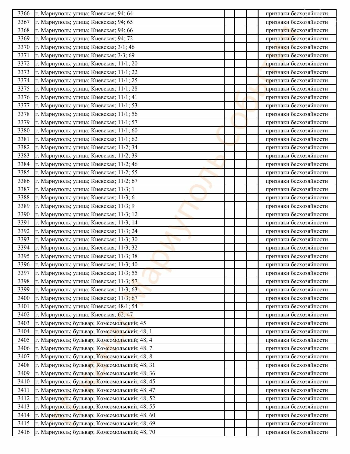 Окупаційна адміністрація Маріуполя оприлюднила черговий перелік нерухомості, яку визнали такою, що «має ознаки безхазяйності». У списку — близько 13 тисяч об’єктів, переважно квартир та житлових приміщень.