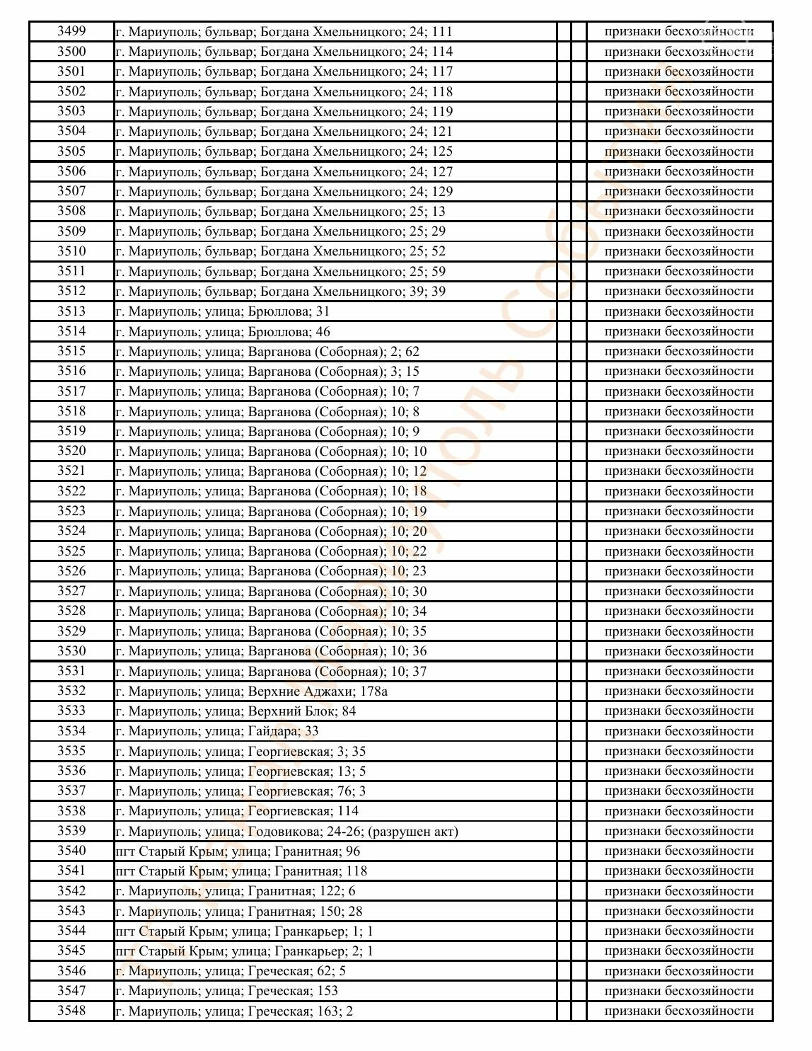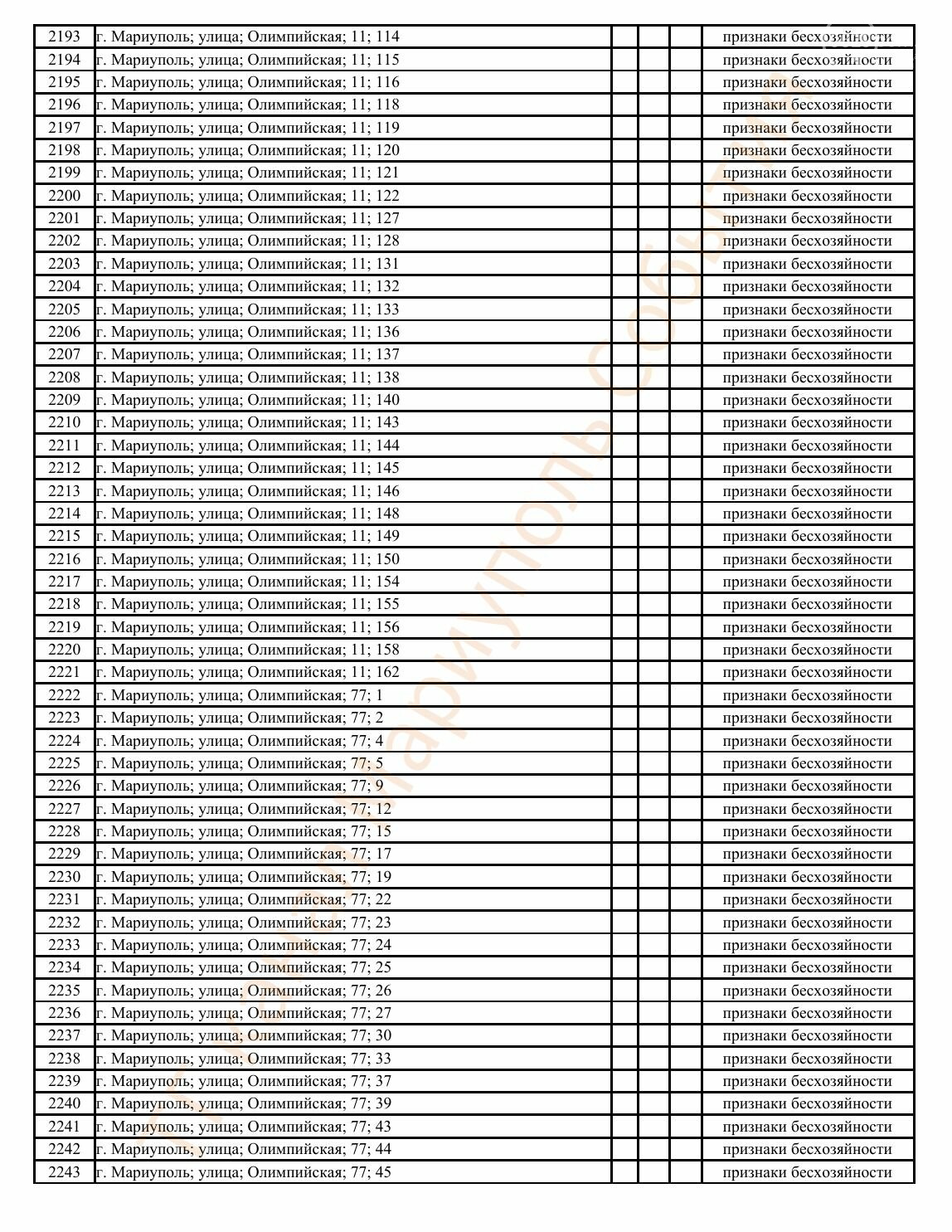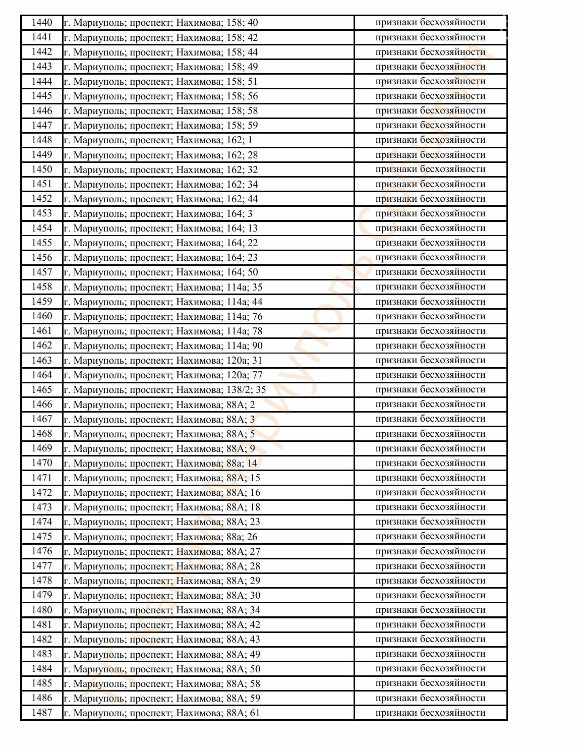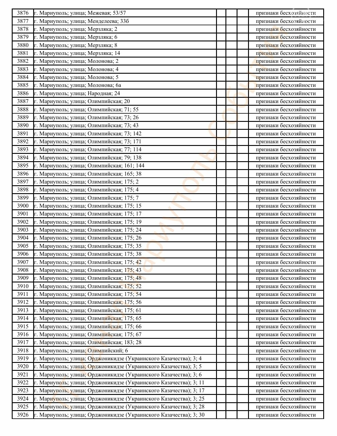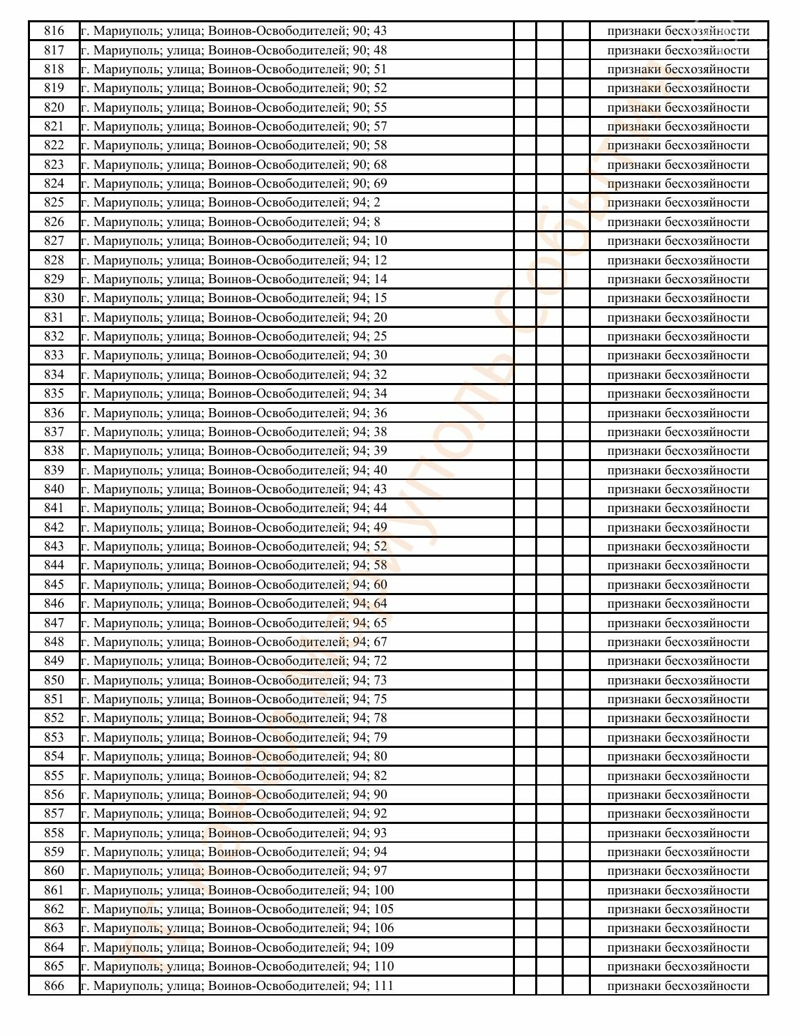 Окупаційна адміністрація Маріуполя оприлюднила черговий перелік нерухомості, яку визнали такою, що «має ознаки безхазяйності». У списку — близько 13 тисяч об’єктів, переважно квартир та житлових приміщень.