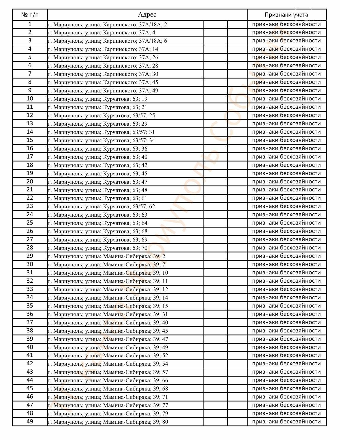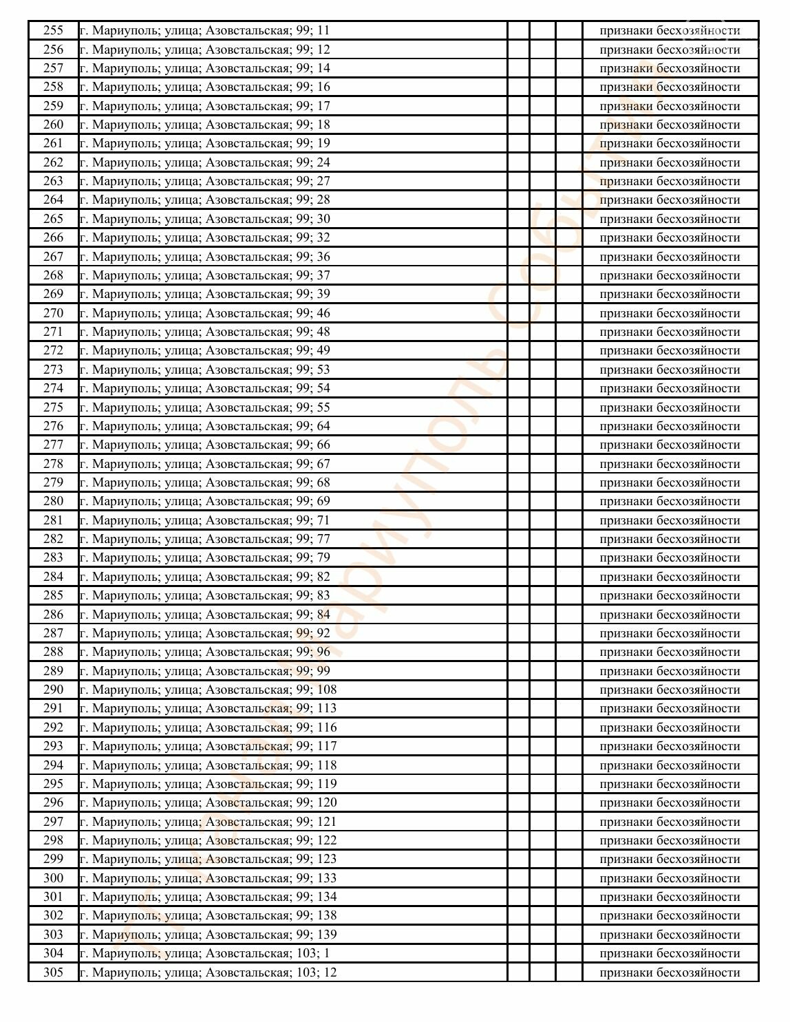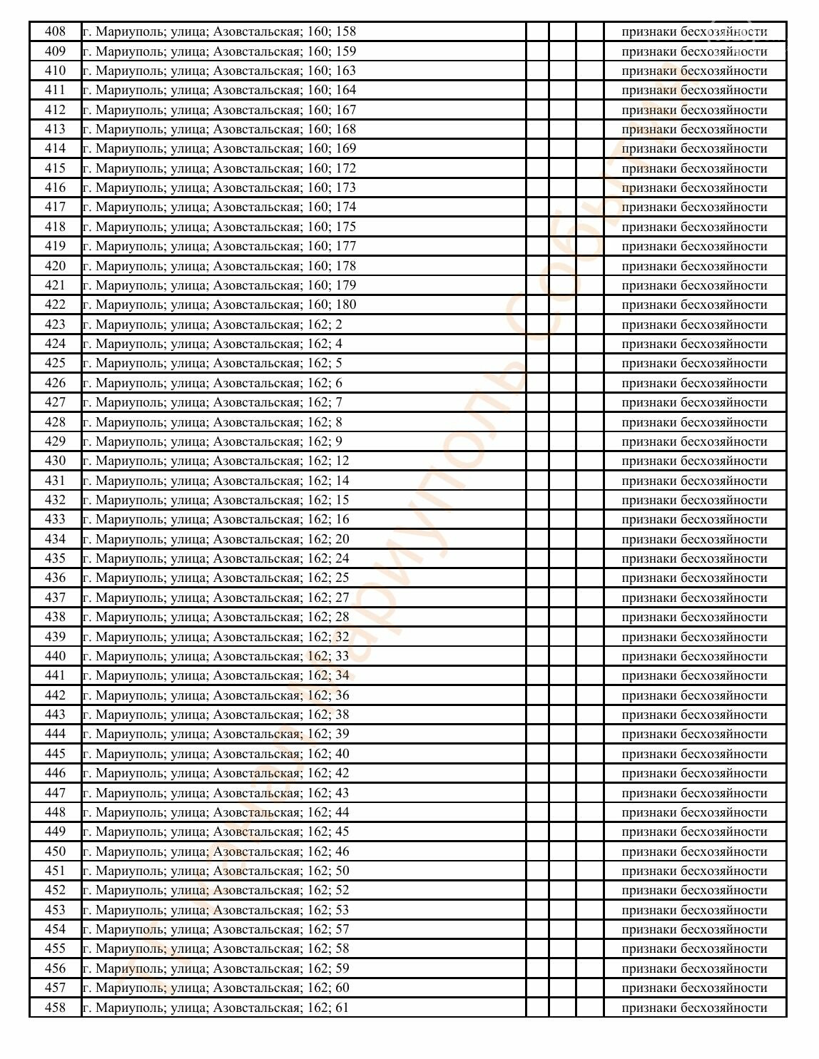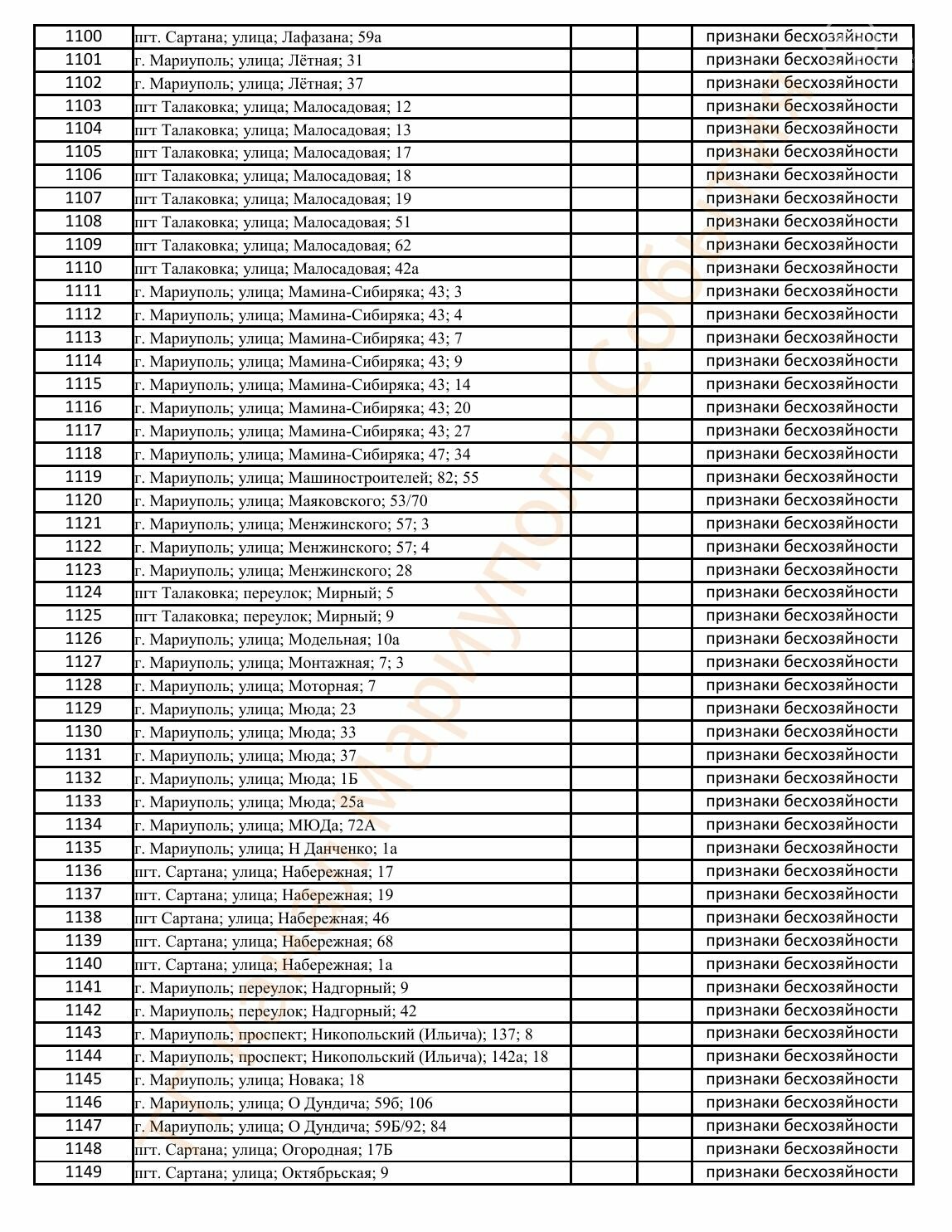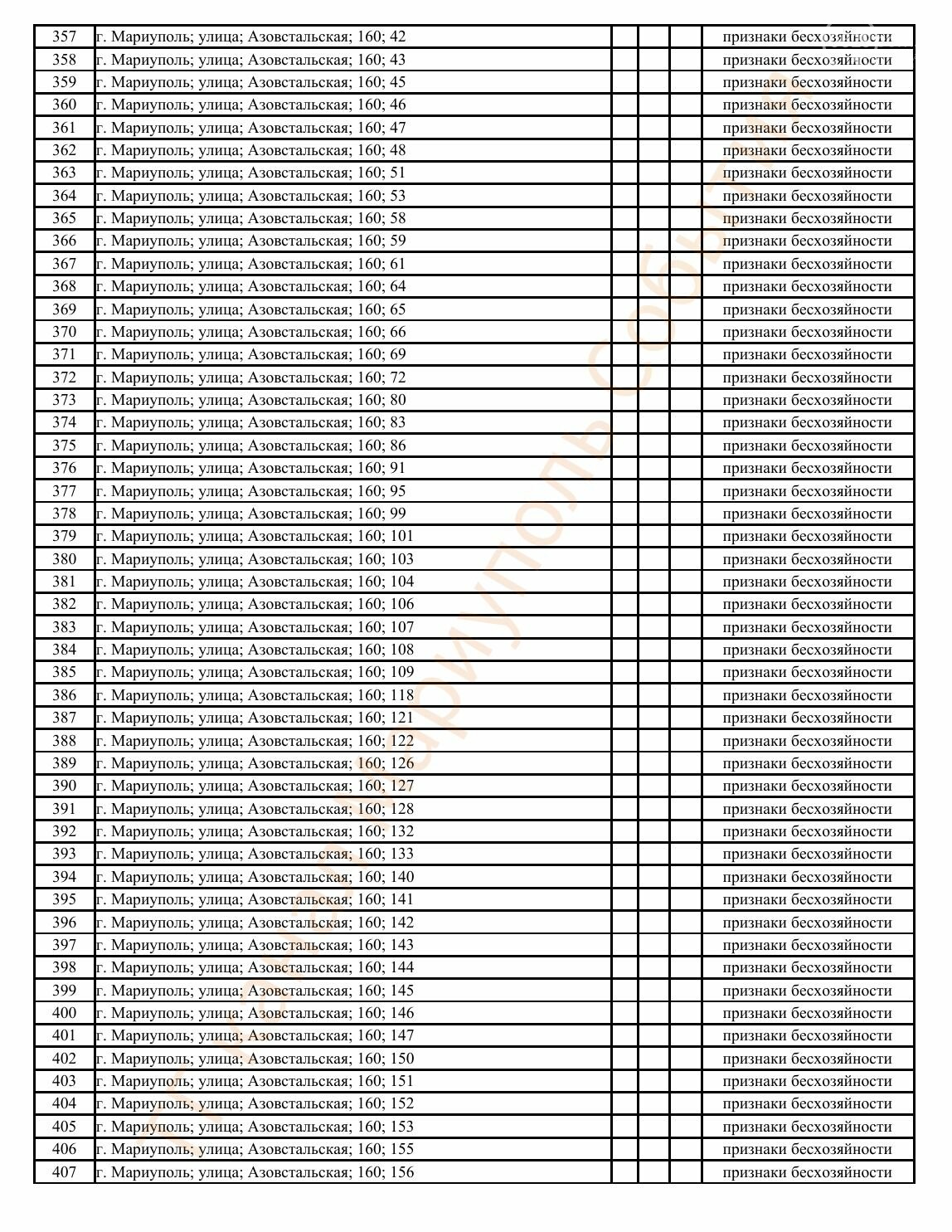 Окупаційна адміністрація Маріуполя оприлюднила черговий перелік нерухомості, яку визнали такою, що «має ознаки безхазяйності». У списку — близько 13 тисяч об’єктів, переважно квартир та житлових приміщень.
