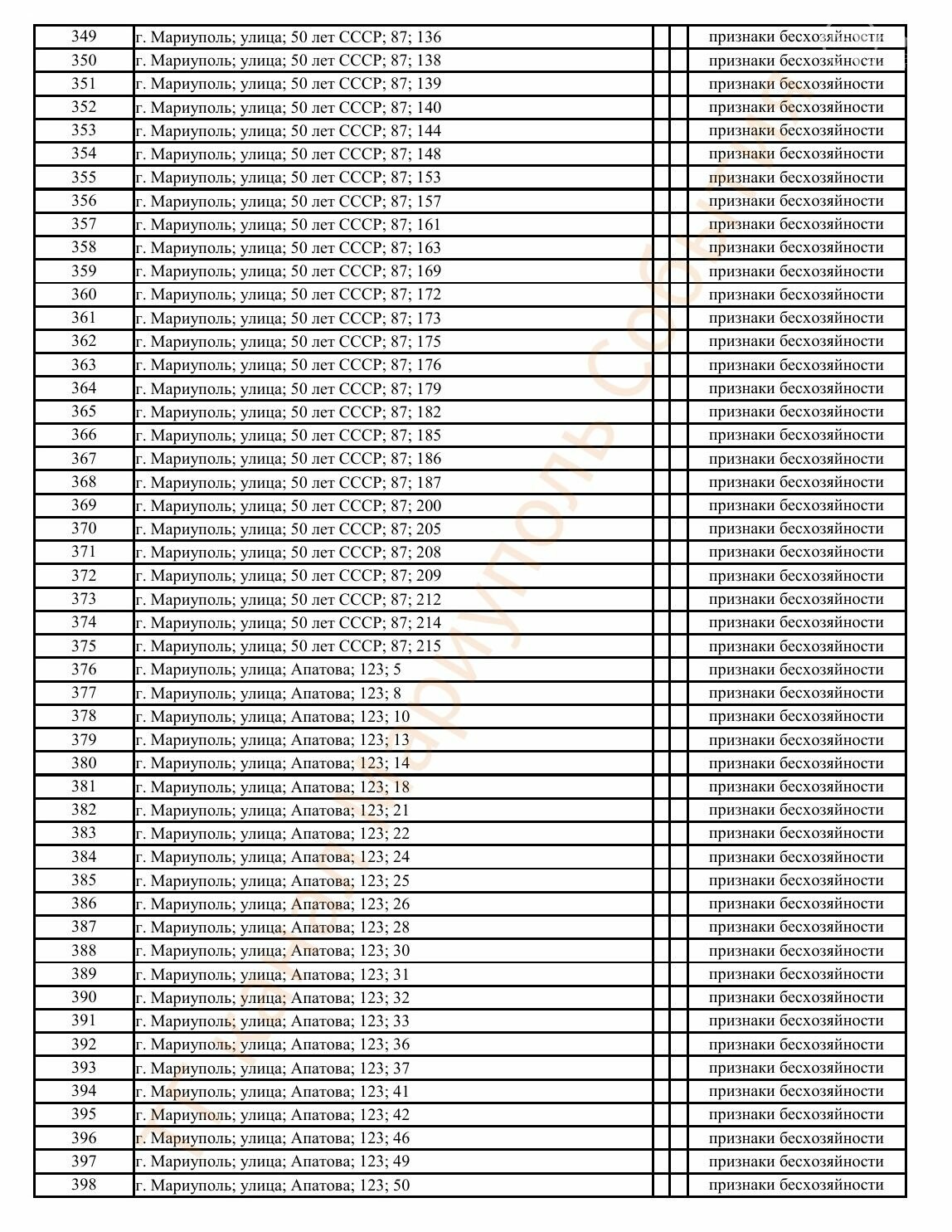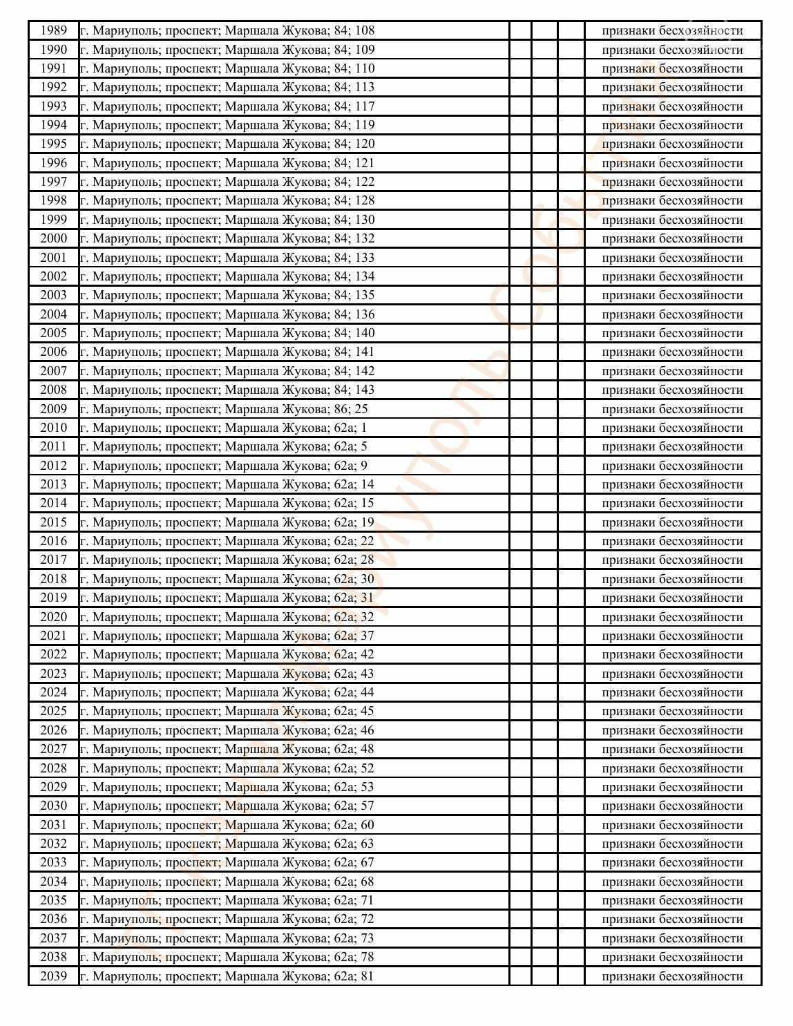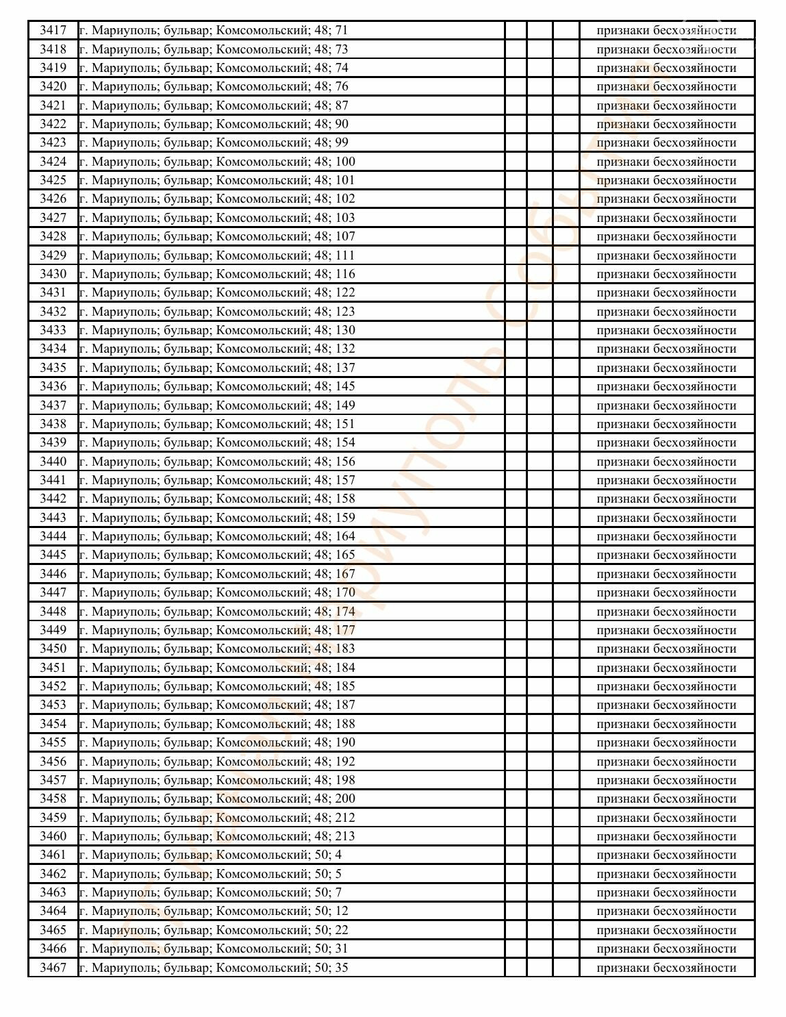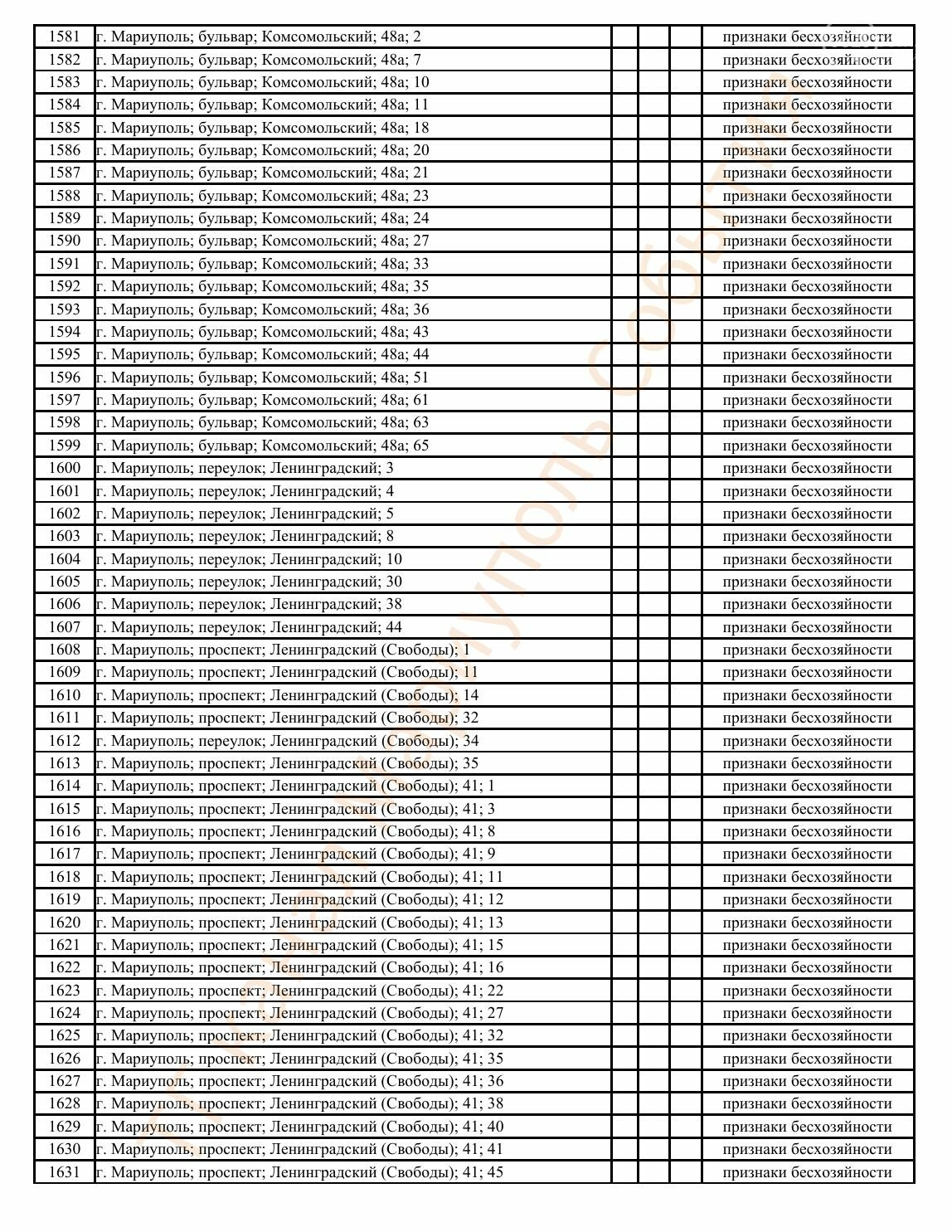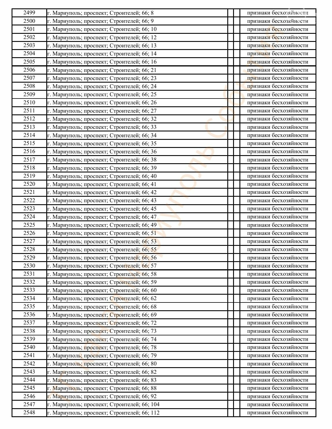 Окупаційна адміністрація Маріуполя оприлюднила черговий перелік нерухомості, яку визнали такою, що «має ознаки безхазяйності». У списку — близько 13 тисяч об’єктів, переважно квартир та житлових приміщень.
